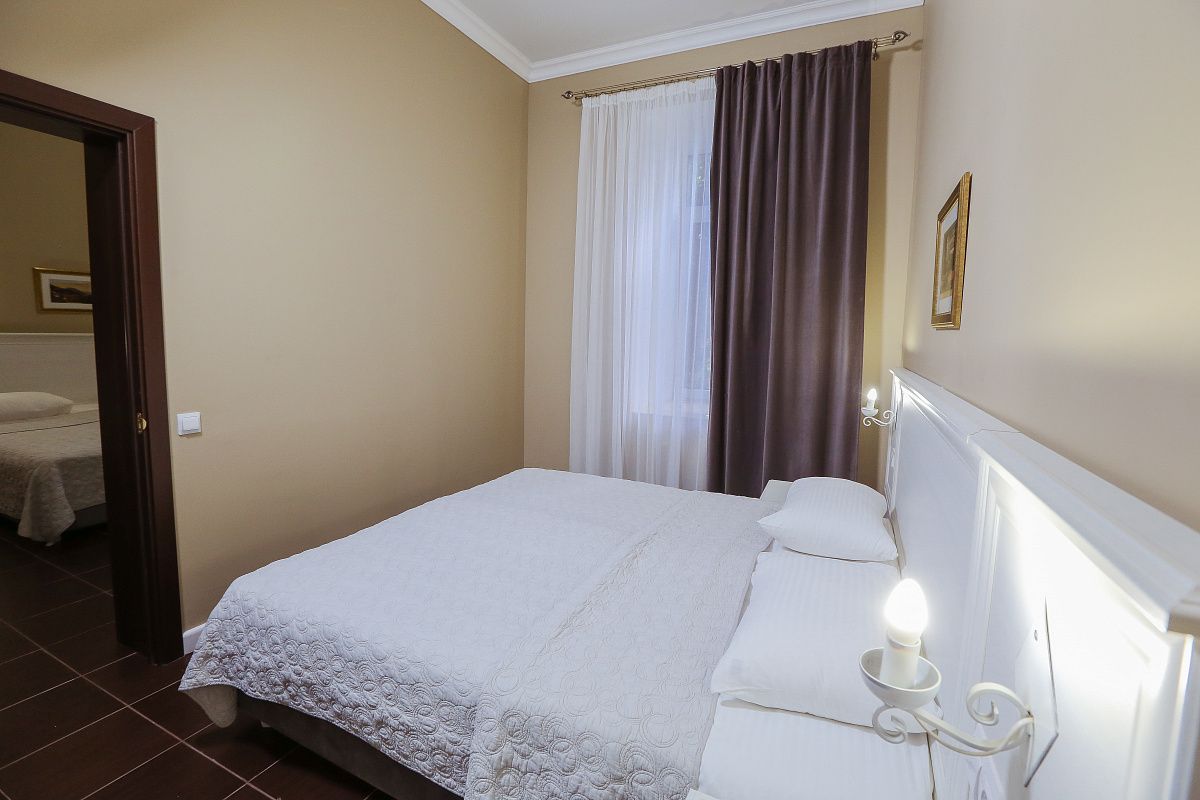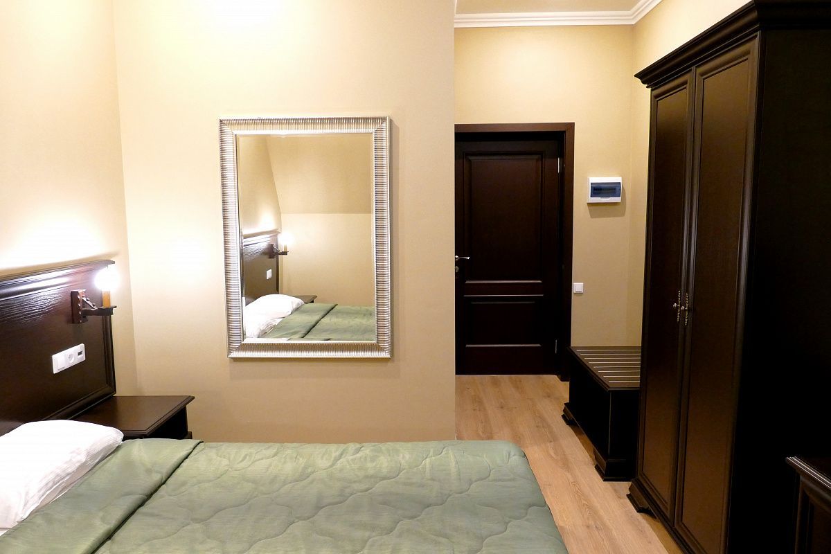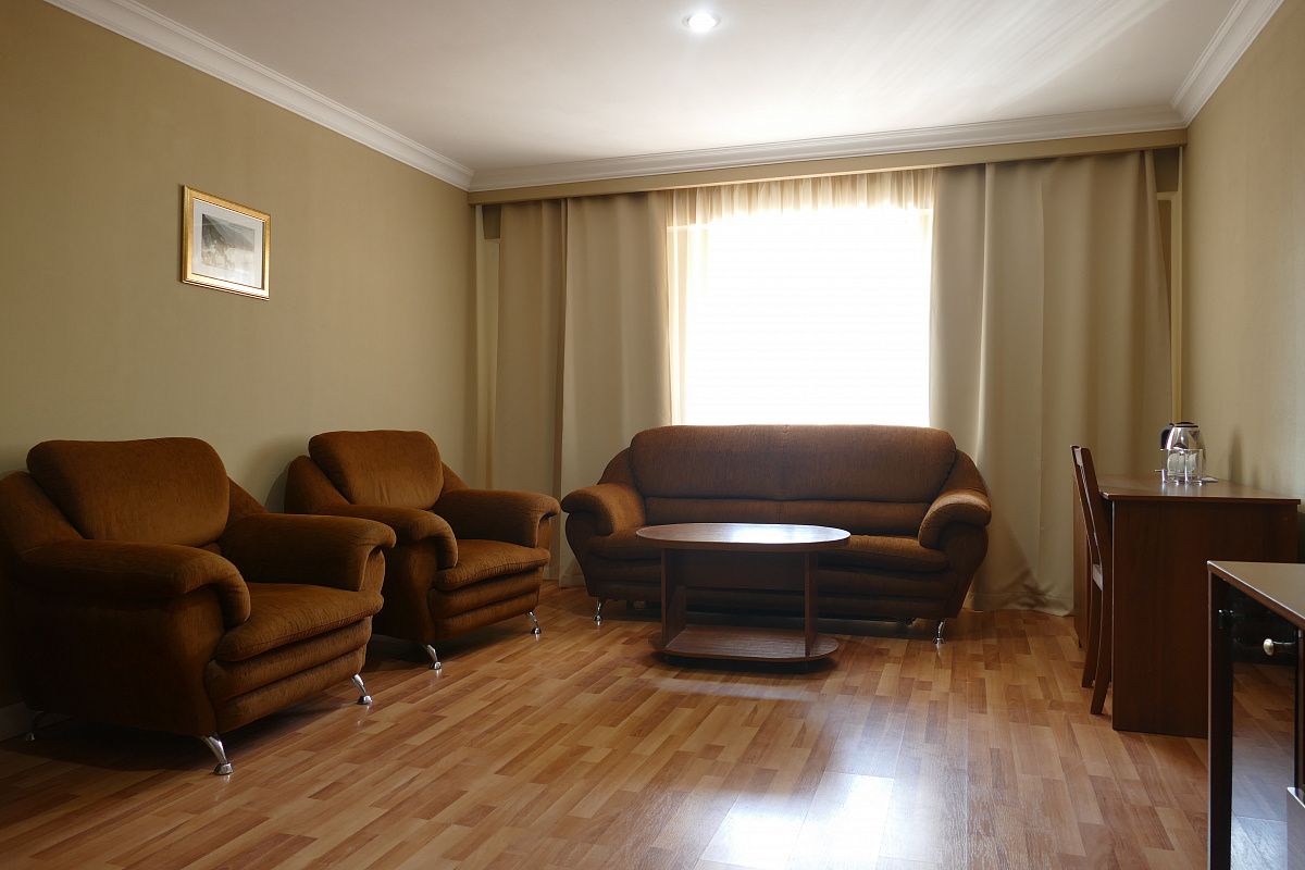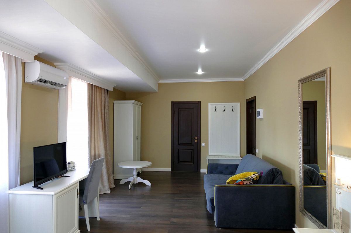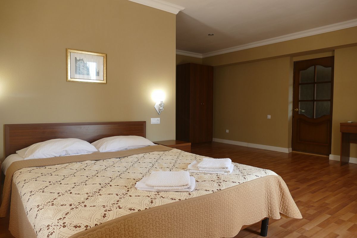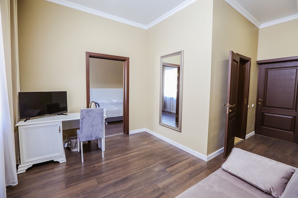 В номере: вешалка, диван раскладной, зеркало, кресла, кровать двуспальная, прикроватные тумбочки, стол, столик журнальный, стул, шкаф, сплит-система, телевизор, холодильник
