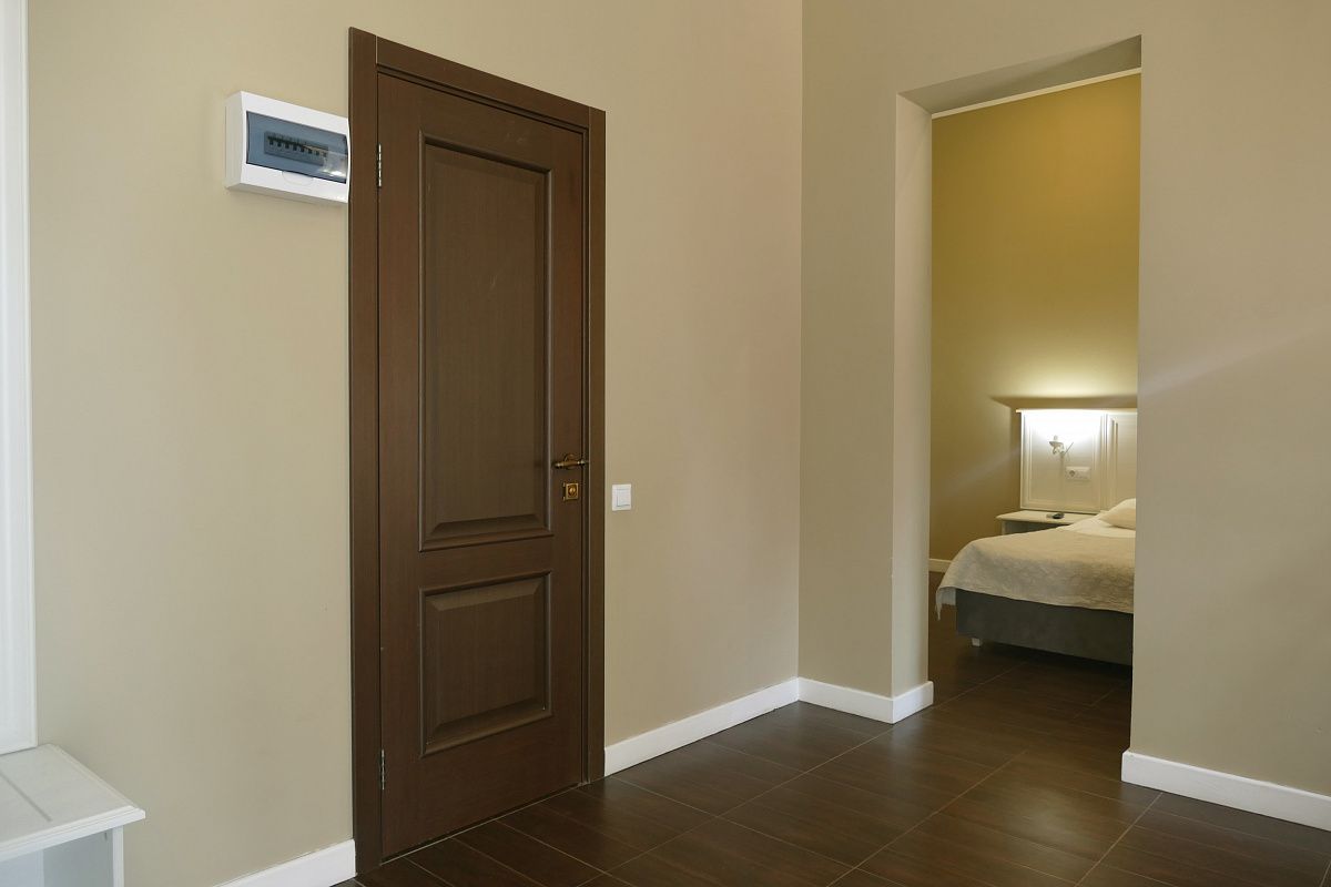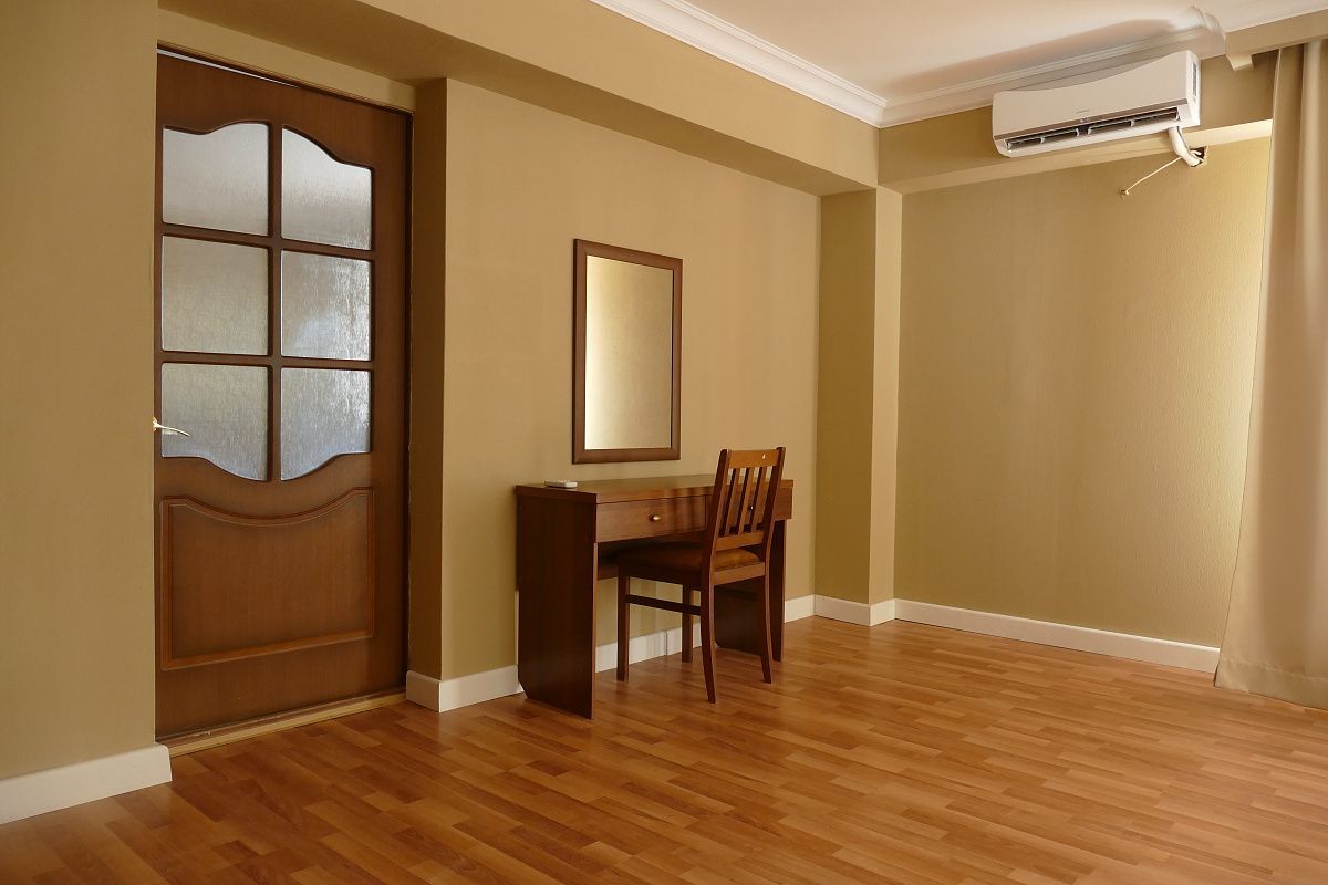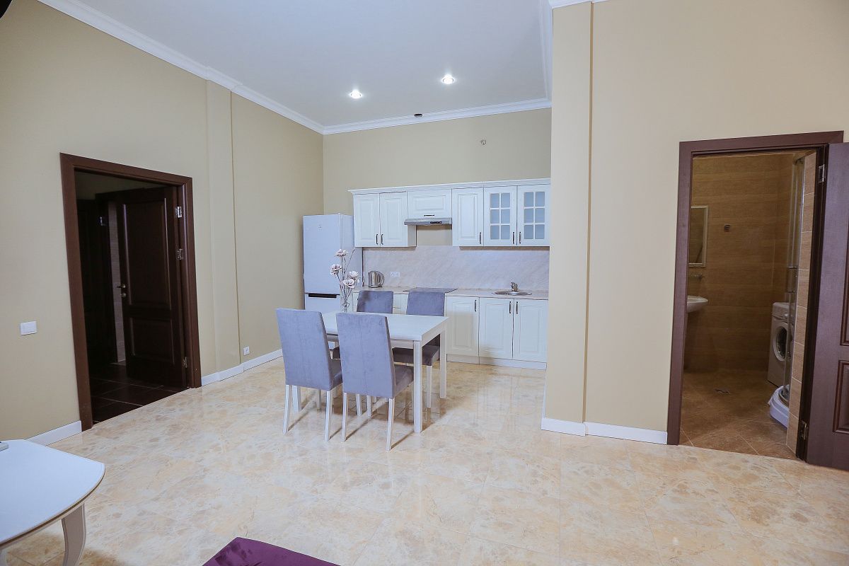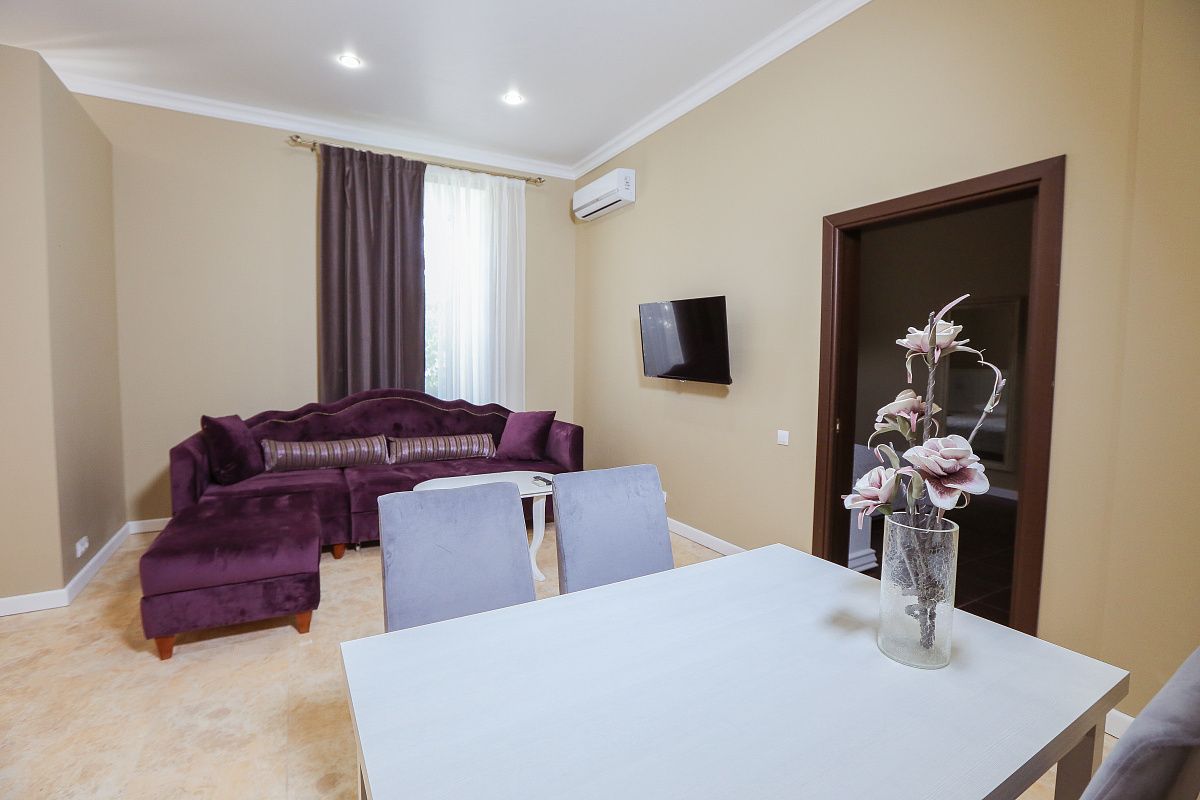 В номере: вешалка, диван, зеркало, кровать двуспальная, кухонная мебель, столик журнальный, стол обеденный, стулья, шкаф, набор посуды, сплит-система, стиральная машина, телевизор, холодильник, электрочайник