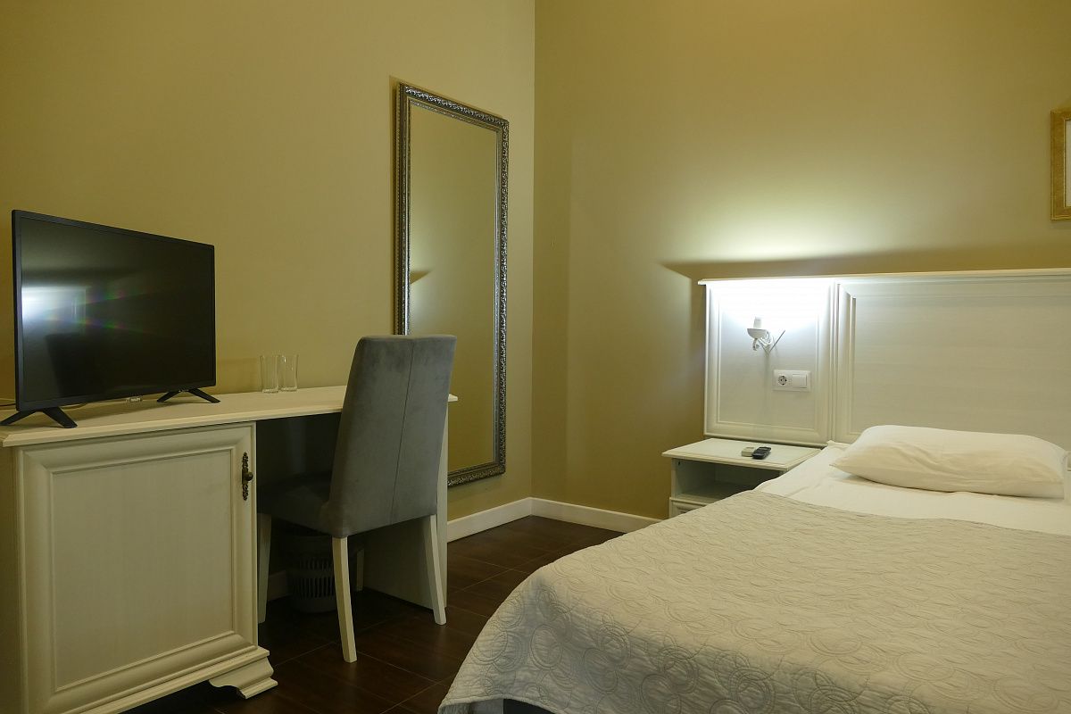 В номере: вешалка, зеркало, кровать двуспальная, прикроватные тумбочки, стол, стул, шкаф, сплит-система, телевизор, холодильник