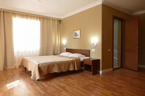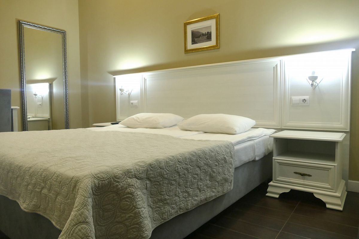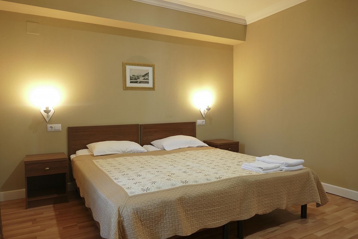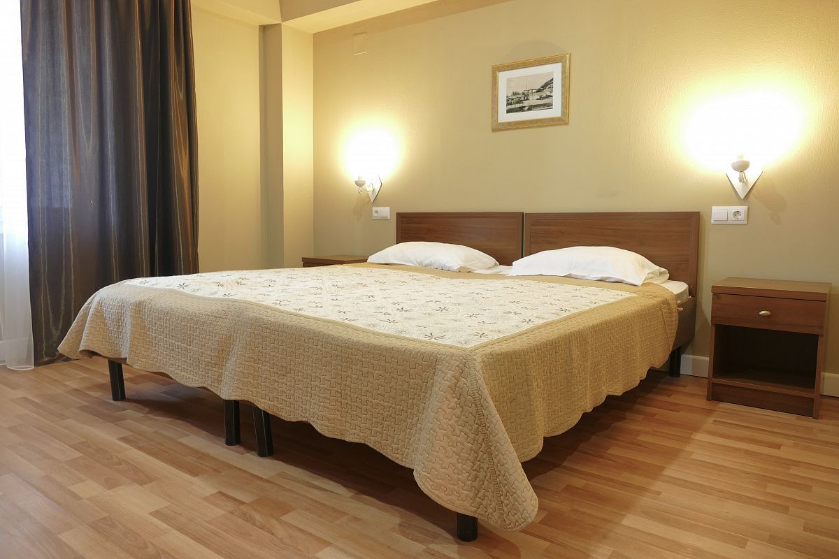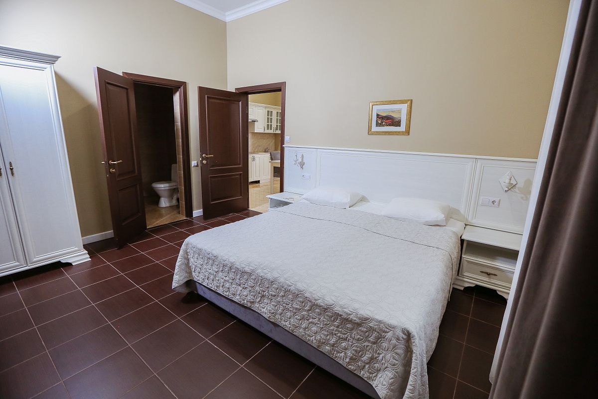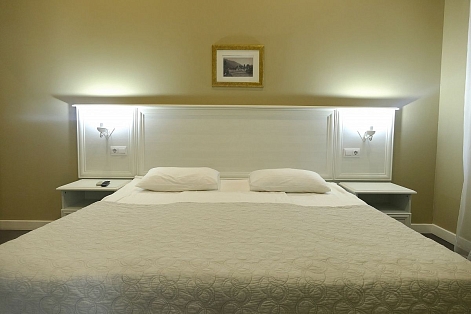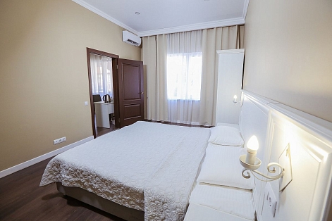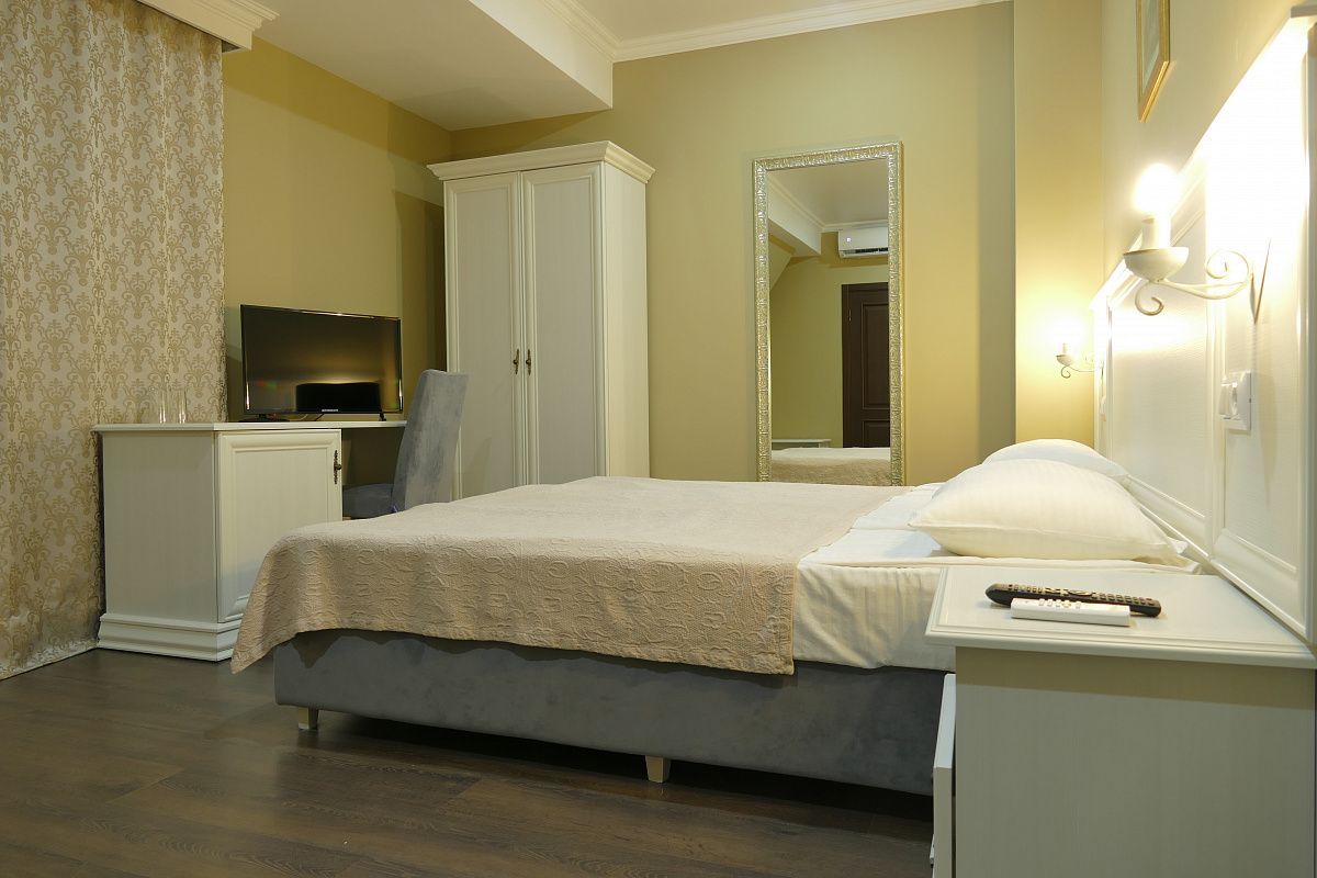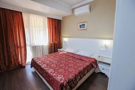 В номере: вешалка, зеркало, кресло-кровать, кровать двуспальная, прикроватные тумбочки, стол, столик журнальный, стул, шкаф, сплит-система, телевизор, холодильник