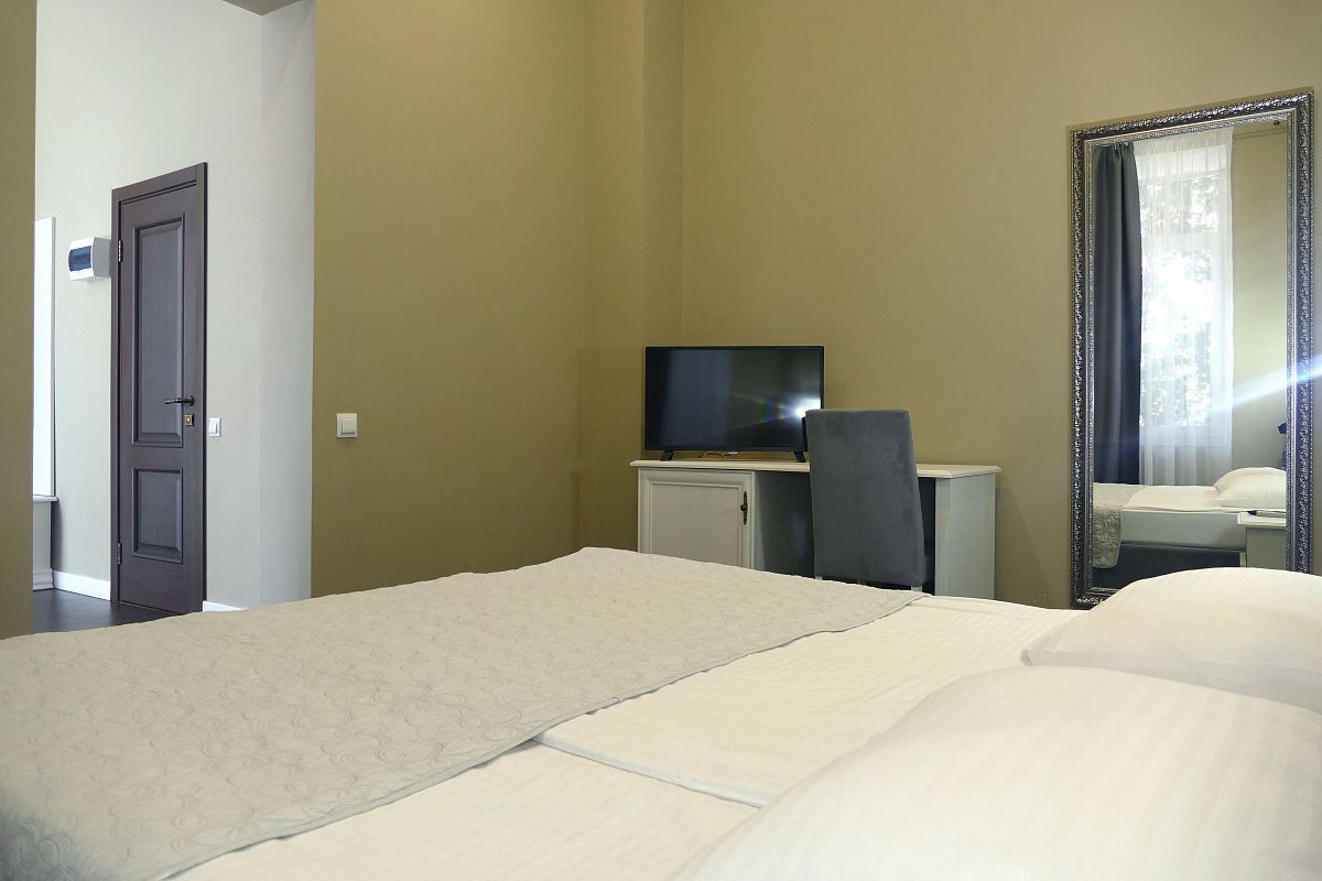 В номере: вешалка, зеркало, кровати односпальные /одна двуспальная кровать, прикроватные тумбочки, шкаф, сплит-система, телевизор, холодильник