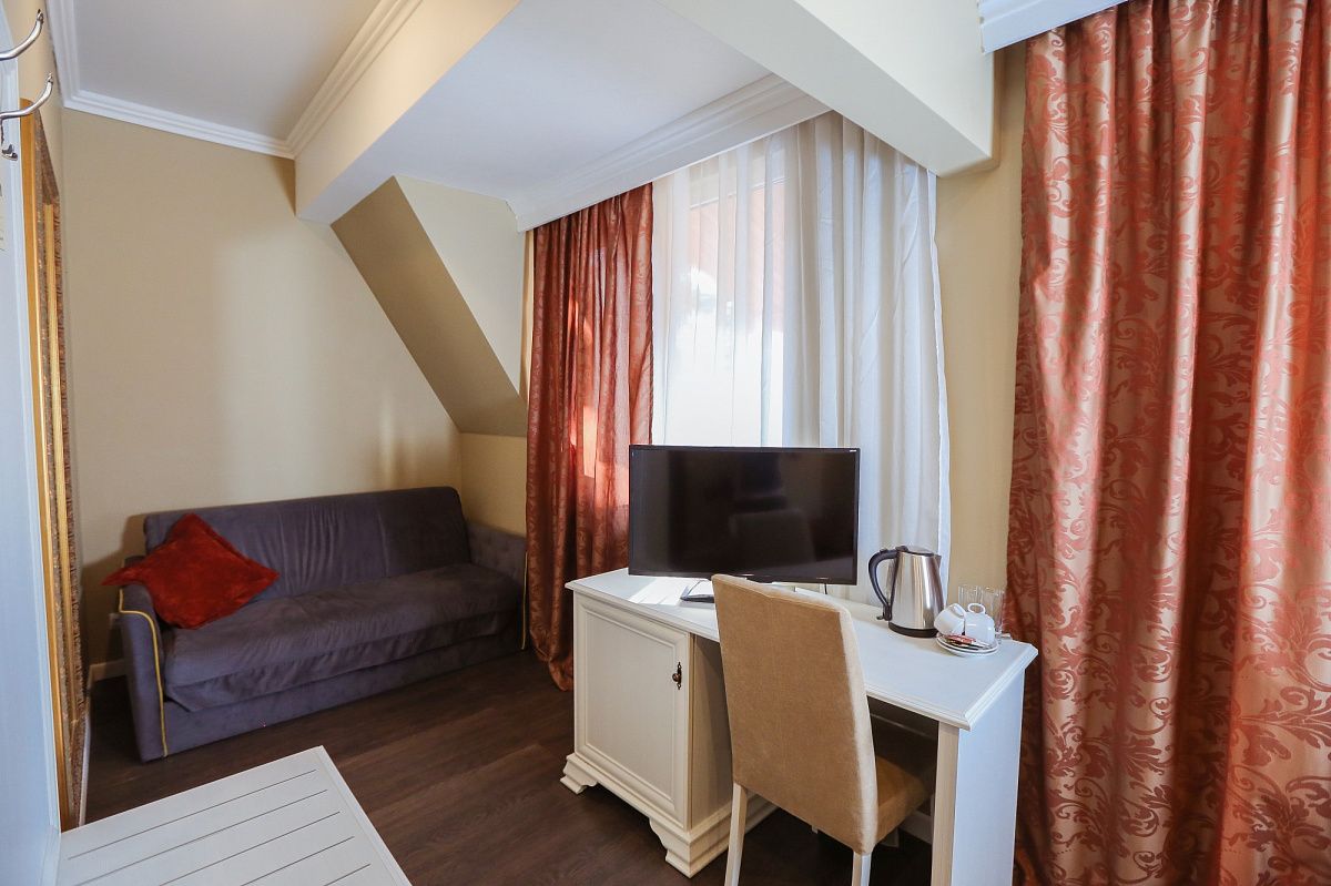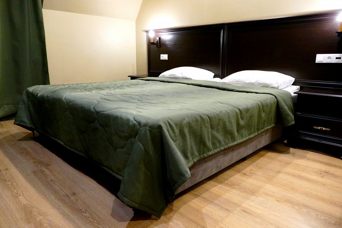 В номере: вешалка, диван раскладной, зеркало, кресла, кровать двуспальная, прикроватные тумбочки, стол, стул, шкаф, сплит-система, телевизор, холодильник