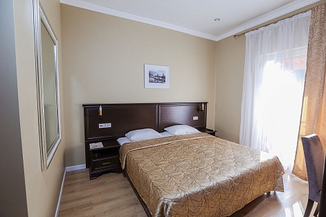 В номере: вешалка, зеркало, кресло-кровать, кровать двуспальная, прикроватные тумбочки, стол, стул, шкаф, сплит-система, телевизор, холодильник