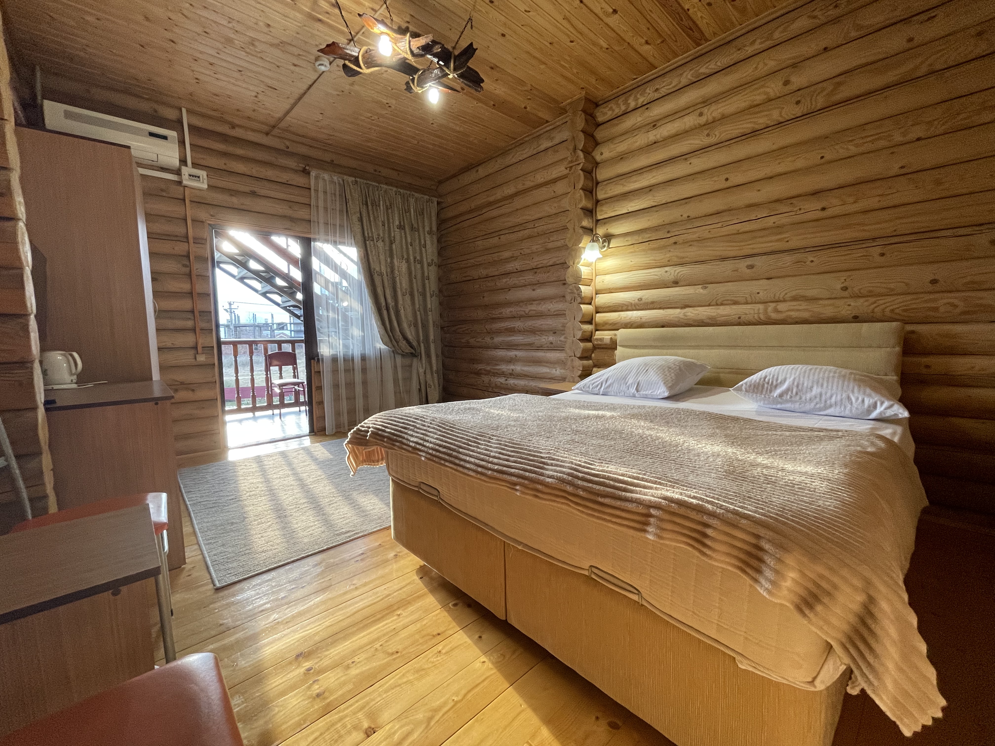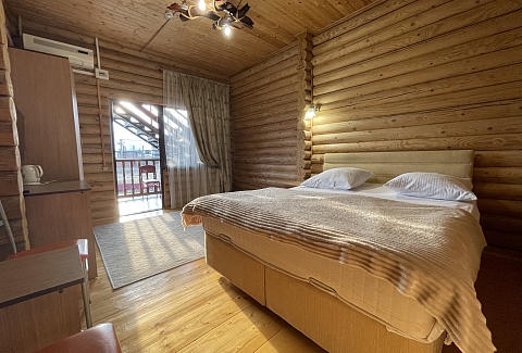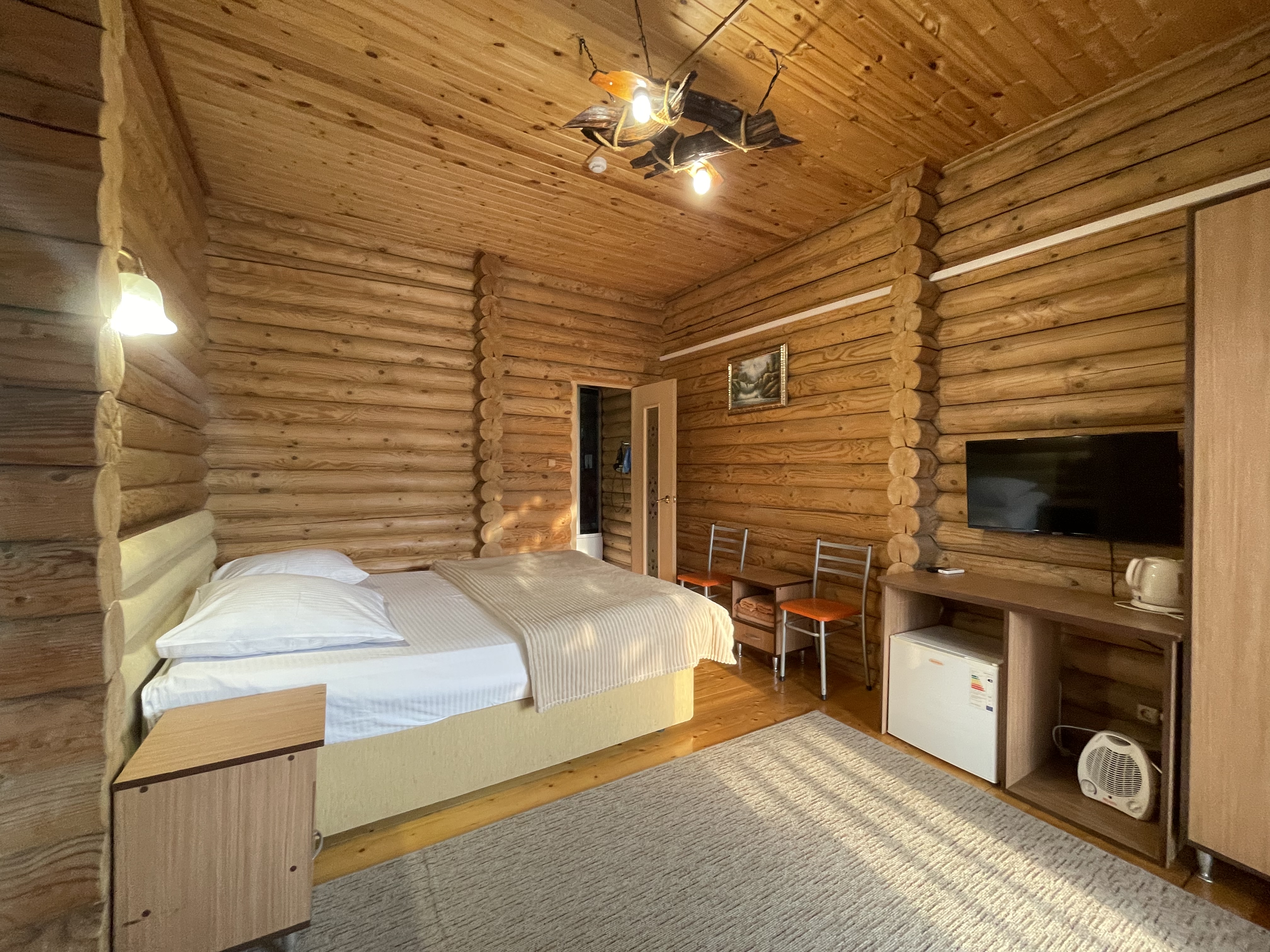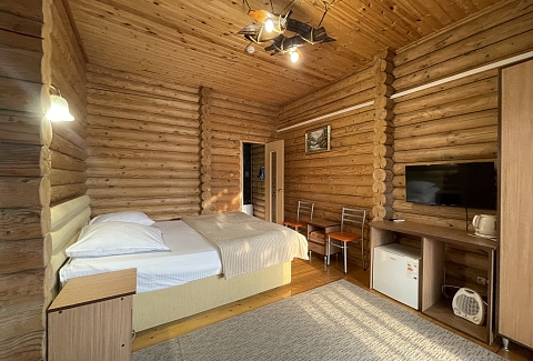 В номере: вешалка, зеркало, кресло, кровать двуспальная, прикроватные тумбочки, стол, стулья, шкаф, мини-холодильник, сплит-система, телевизор