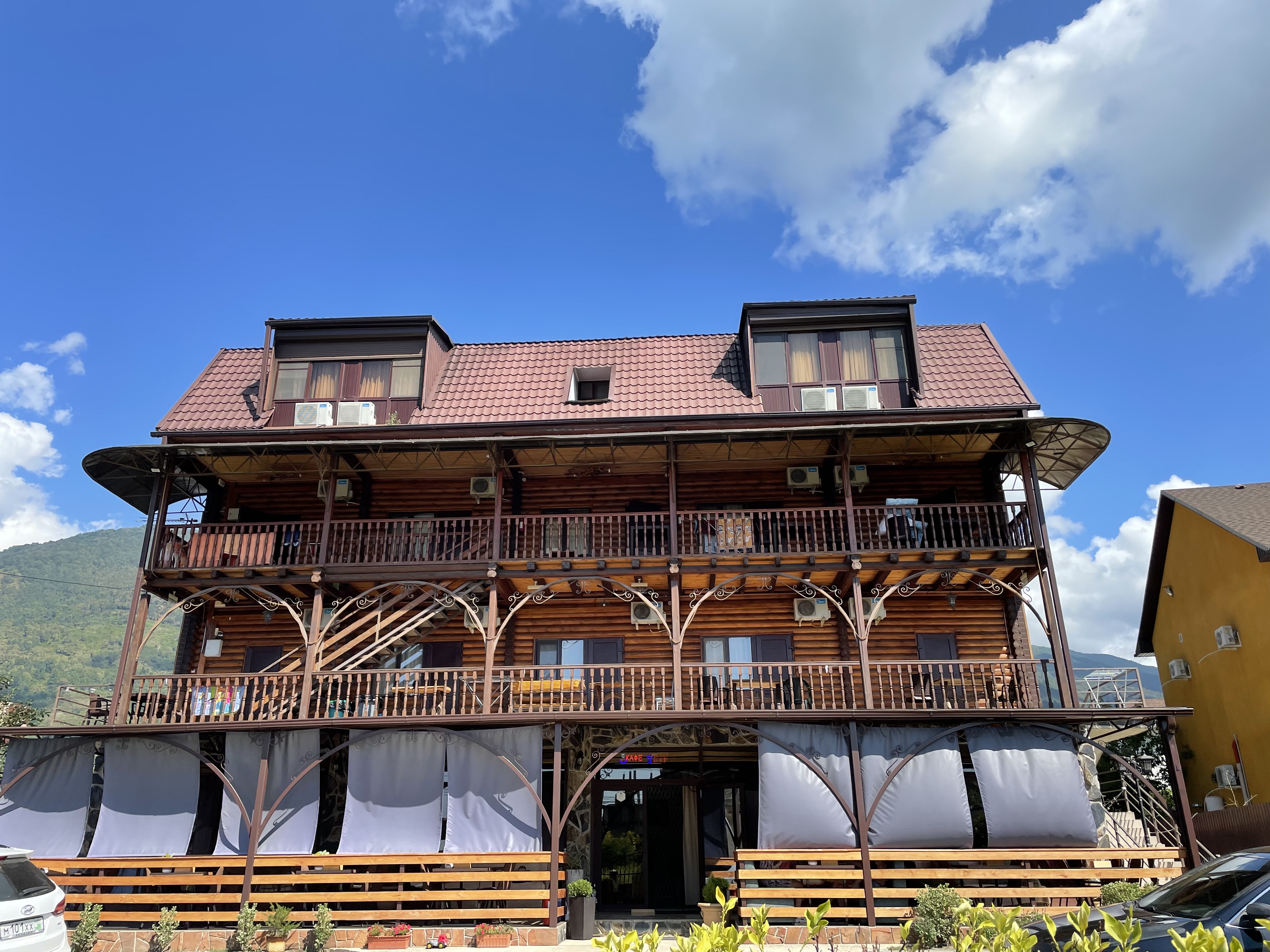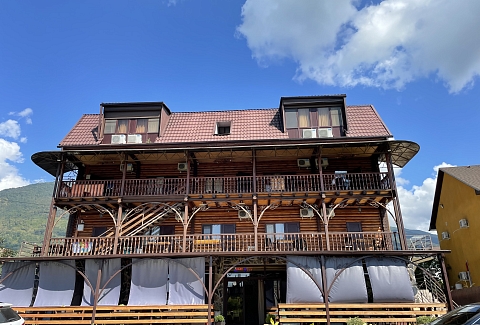 Гагра. Неподалеку расположен аквапарк, дельфинарий и современная бальнеолечебница.Гостевой дом представляет собой 3-х этажное здание c мансардой, построенное из добротного оцилиндрованного бревна. Все отдыхающие могут расположиться в номерах, в которых имеются телевизор, холодильник, кондиционер. В каждом номере есть интернет Wi-Fi и бесперебойное электро и водоснабжение (холодная и горячая вода). Все комнаты имеют душевые кабинки. На территории гостевого дома предусмотрена автостоянка.
