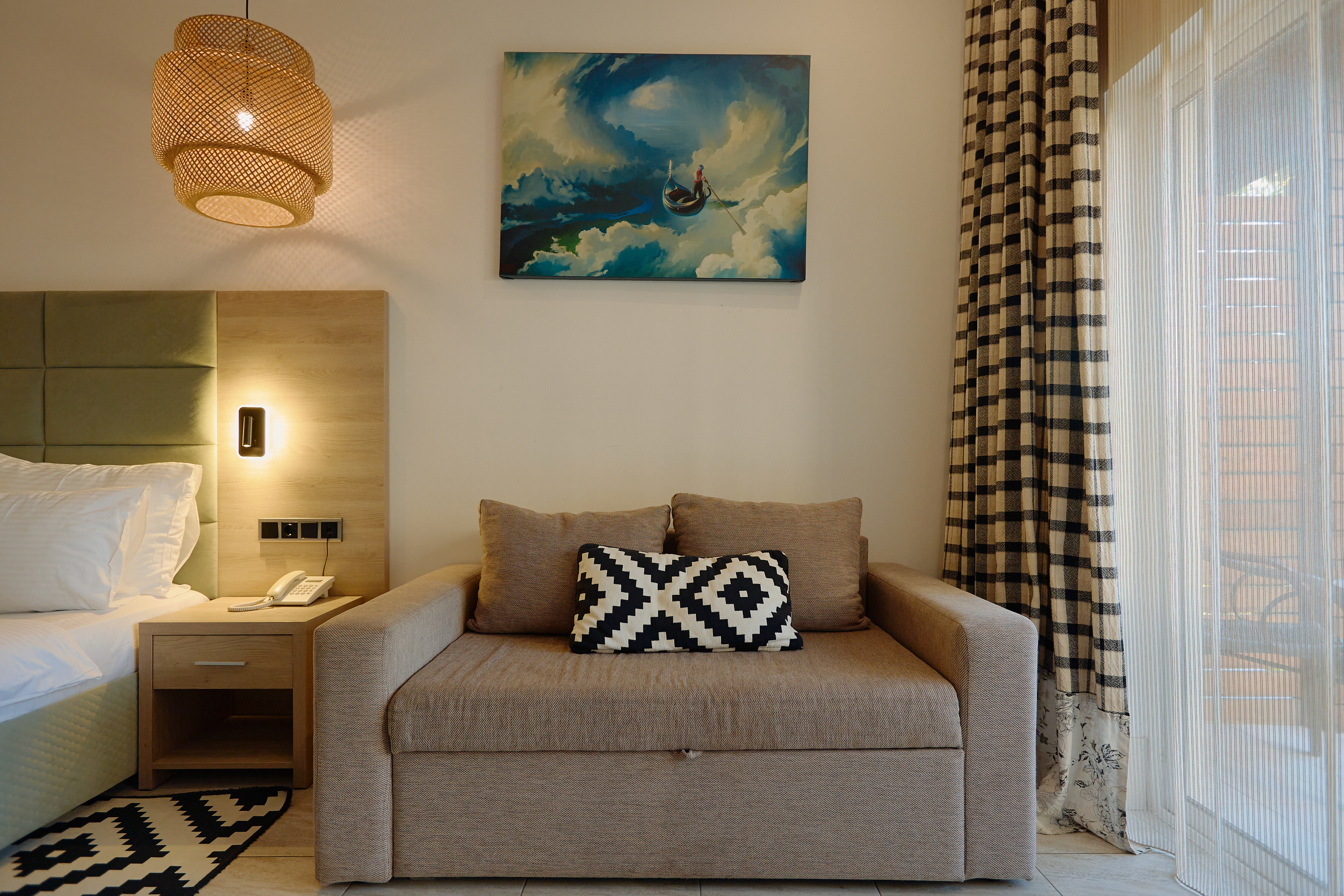 В номере: вешалка, диван, зеркало, кровати односпальные /одна двуспальная кровать, прикроватные тумбочки, стол, стул, шкаф, мини-холодильник, набор посуды, сплит-система, телевизор