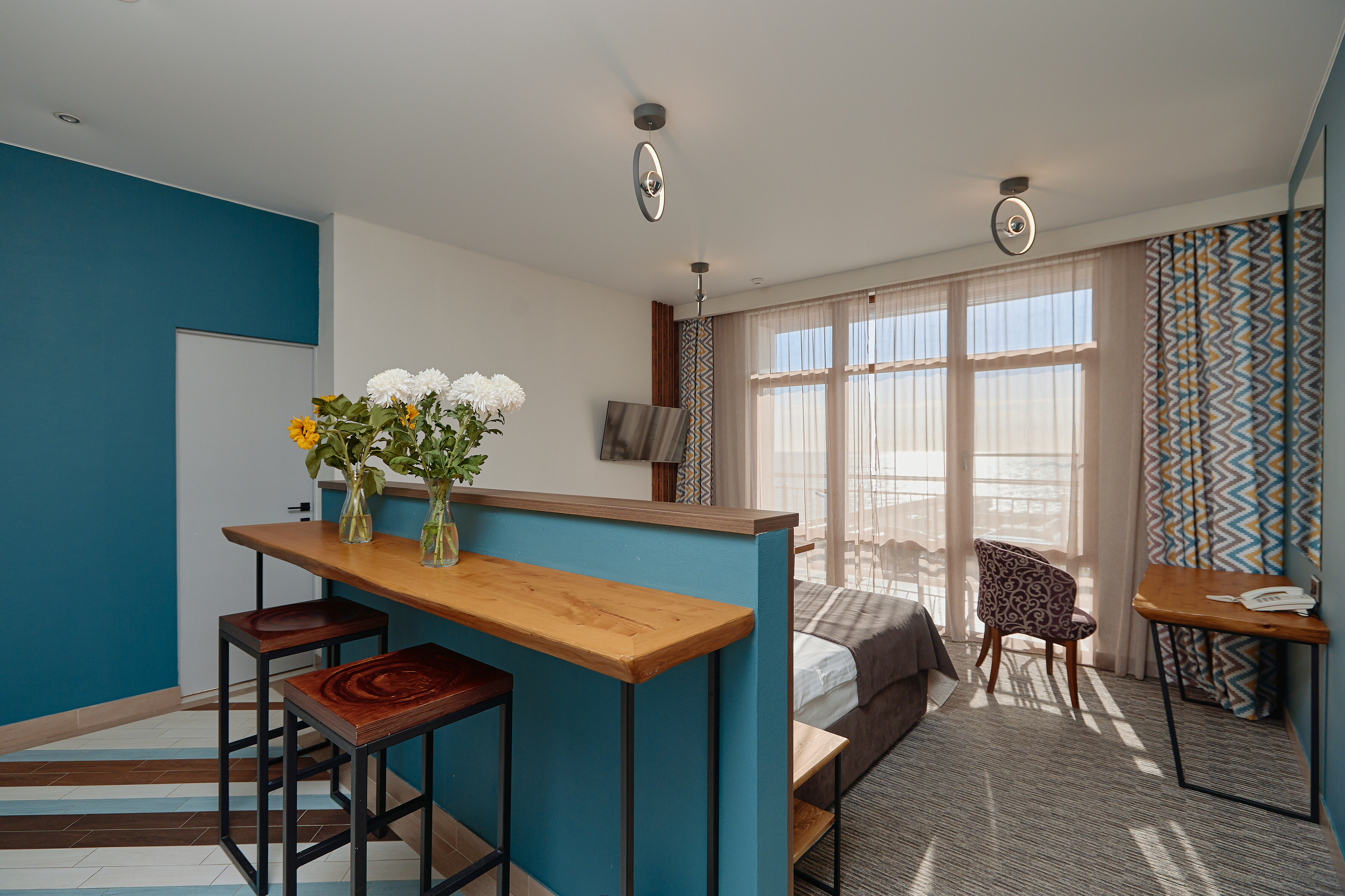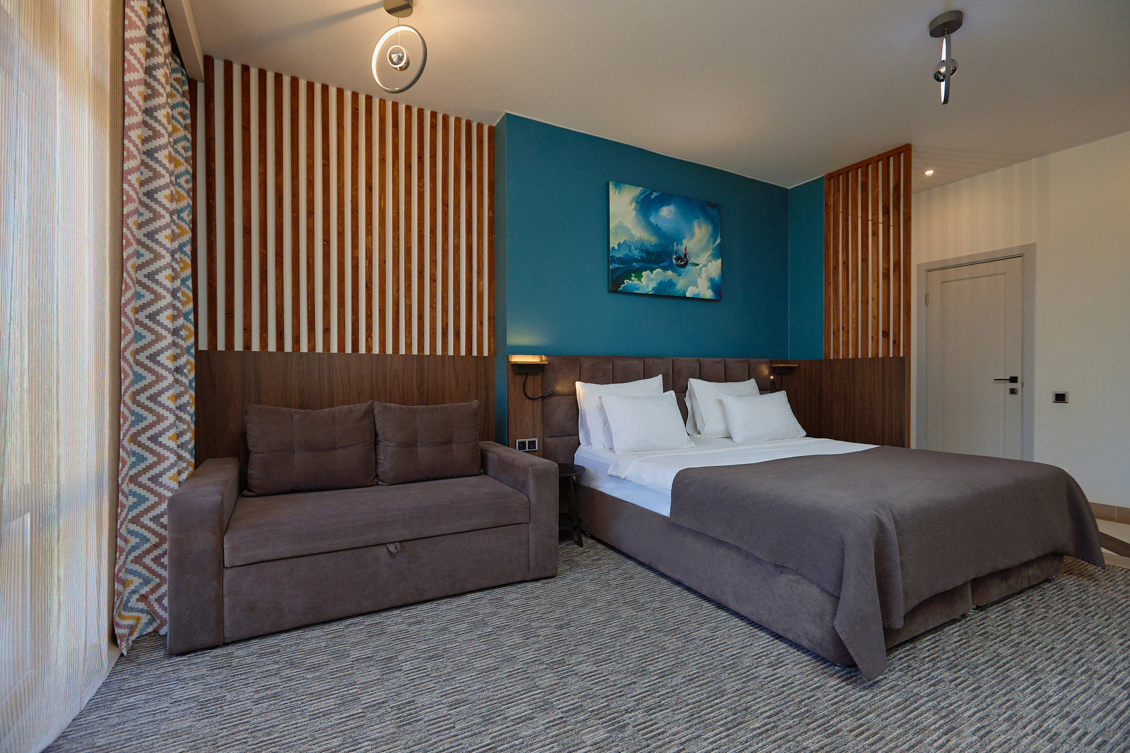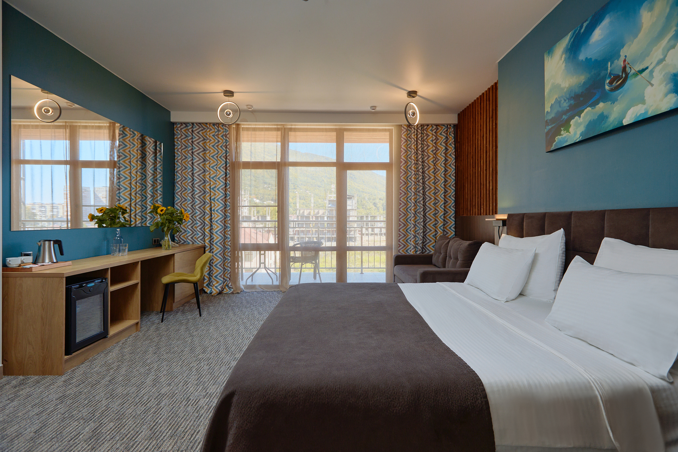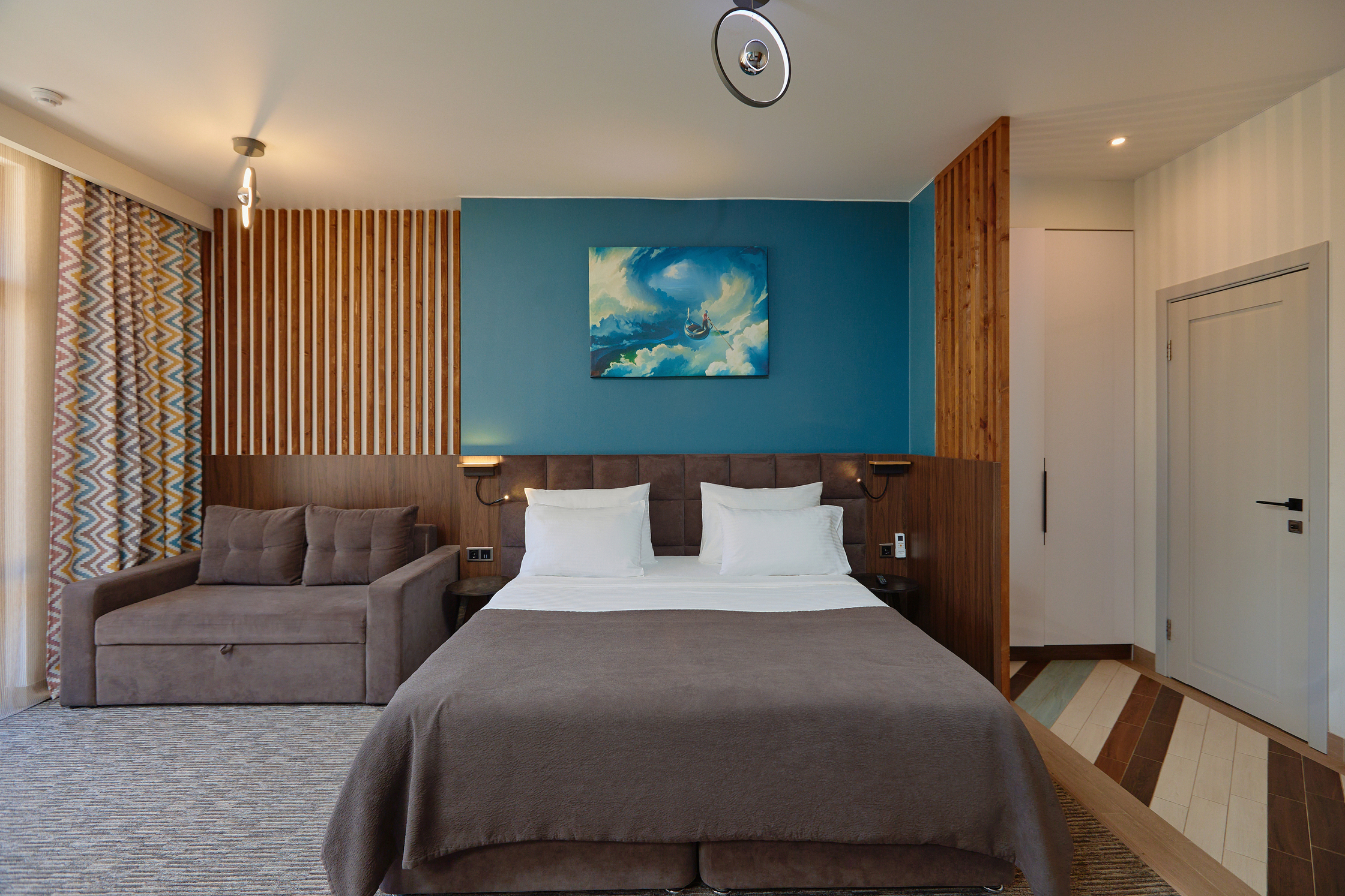В номере: вешалка, диван раскладной, зеркало, кровать двуспальная, прикроватные тумбочки, стол, стул, шкаф, мини-холодильник, набор посуды, сплит-система, телевизор ЖК