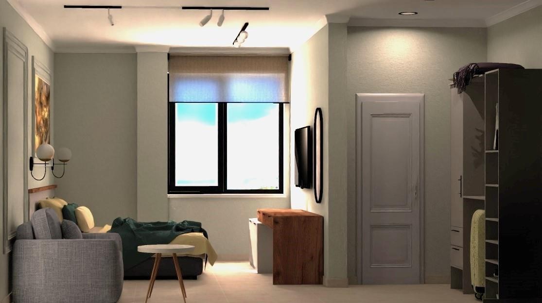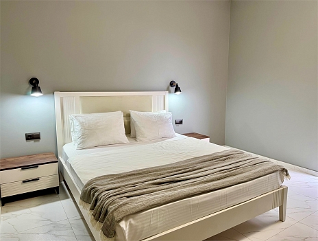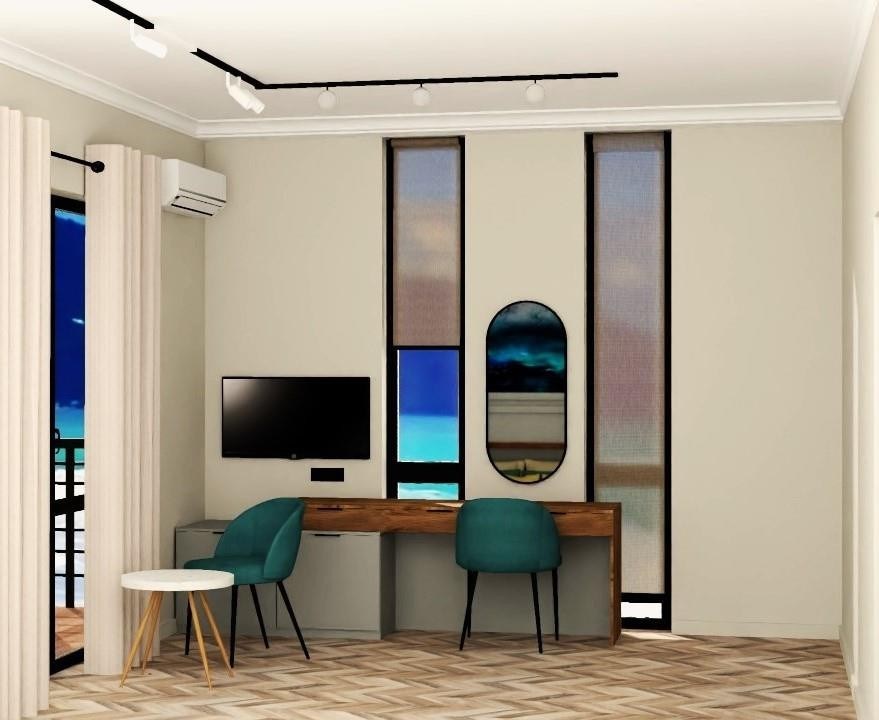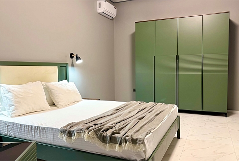 В номере: вешалка, диван, зеркало, кровать двуспальная, прикроватные тумбочки, стол, стулья, шкаф, кондиционер, микроволновая печь, набор посуды, плита электрическая, стиральная машина, телевизор, холодильник, чайный набор посуды, электрочайник
