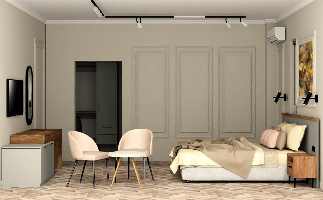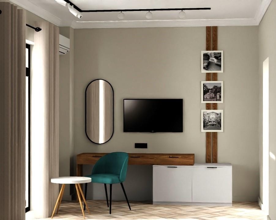 В номере: вешалка, зеркало, кровать двуспальная, прикроватные тумбочки, стол, стул, шкаф, кондиционер, телевизор, холодильник