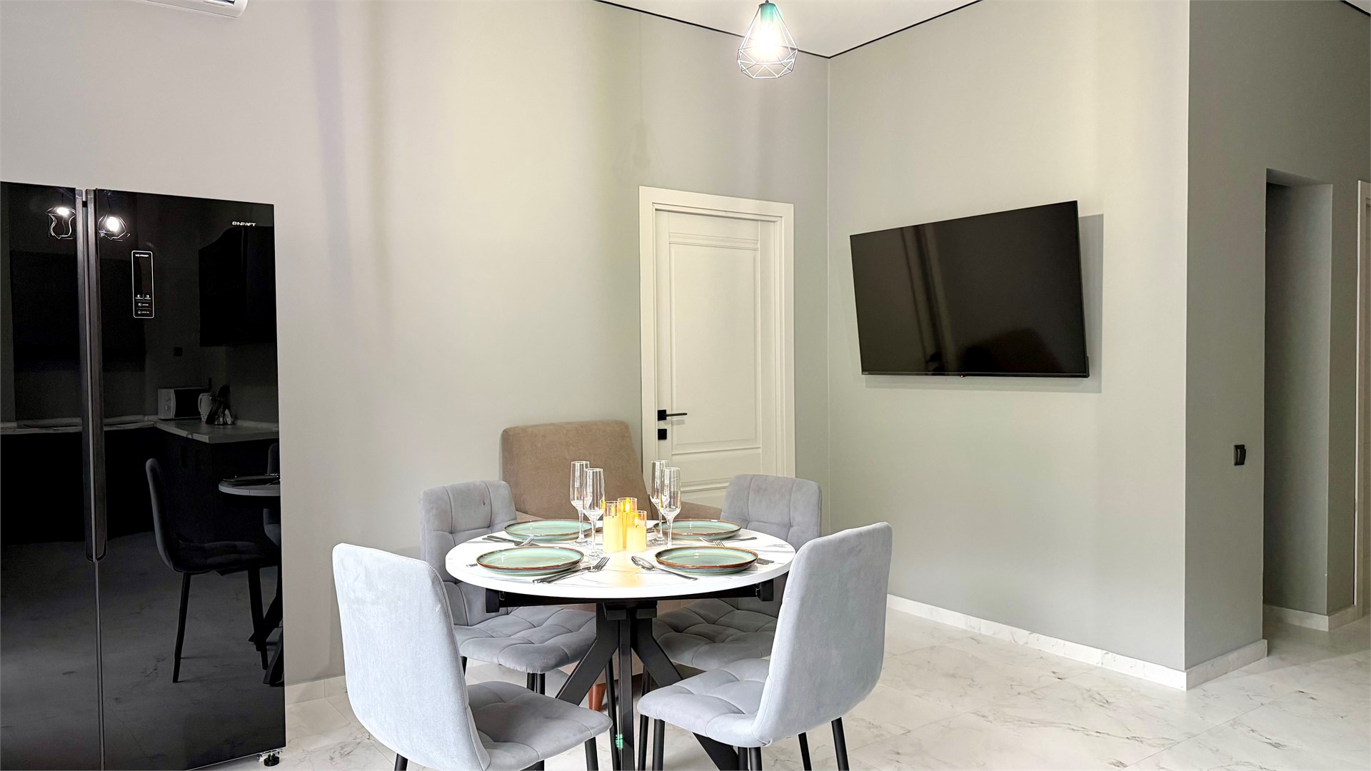В номере: вешалка, зеркало, кровать двуспальная, прикроватные тумбочки, стол, стул, шкаф, кондиционер, стиральная машина, телевизор, холодильник, чайный набор посуды, электрочайник