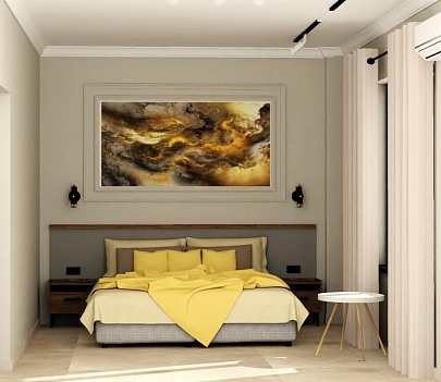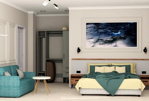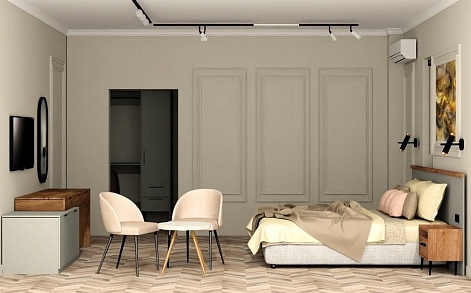 В номере: вешалка, диван, зеркало, кровать двуспальная, прикроватные тумбочки, стол, стул, шкаф, кондиционер, телевизор, холодильник