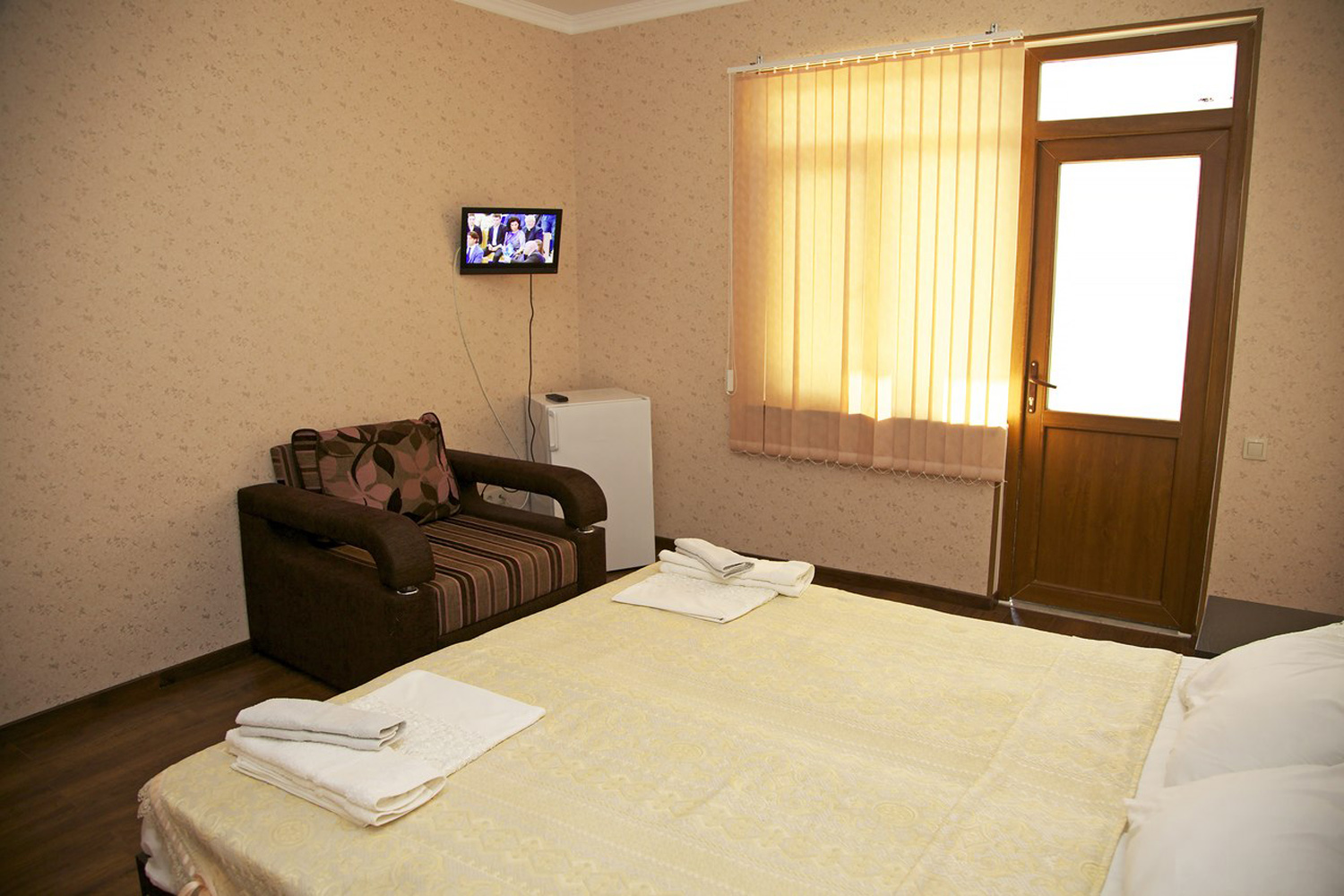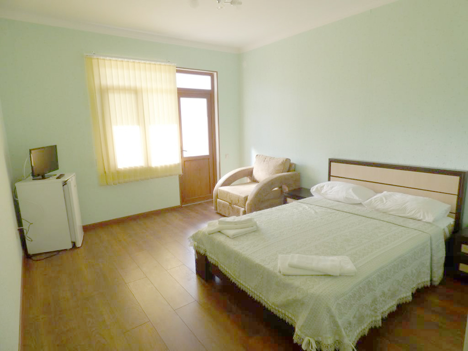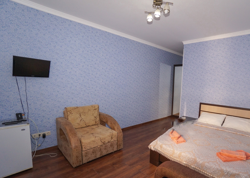 В номере: вешалка, зеркало, кресло-кровать, кровать двуспальная, прикроватные тумбочки, шкаф, кондиционер, телевизор, холодильник