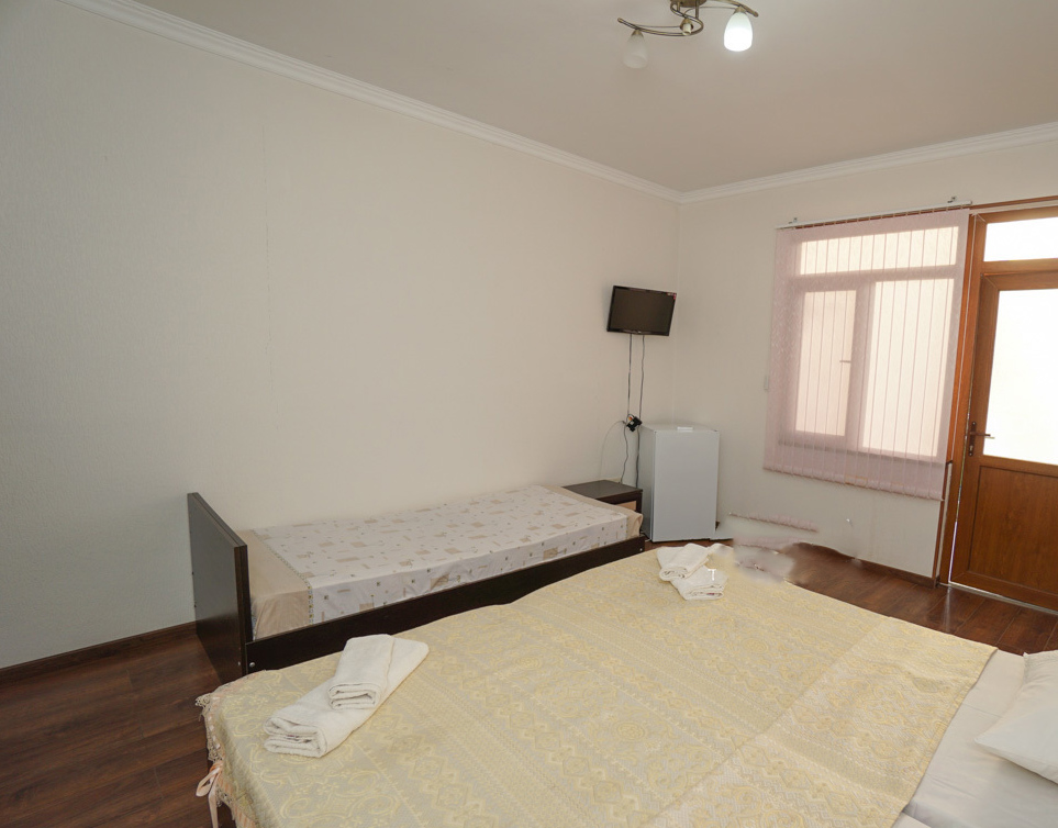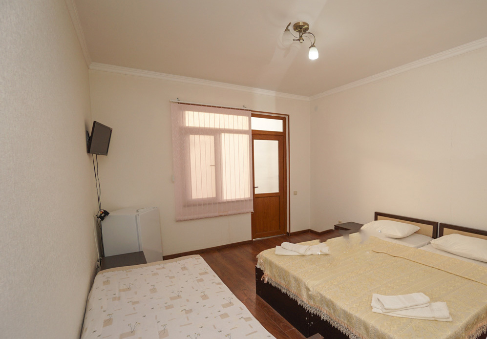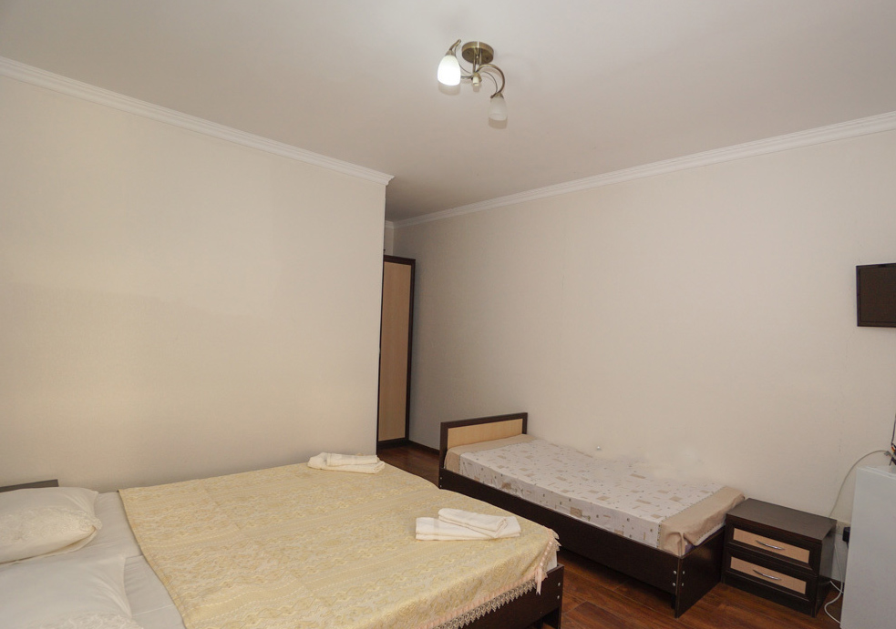 В номере: вешалка, зеркало, кровать двуспальная, кровать односпальная, прикроватные тумбочки, шкаф, кондиционер, телевизор, холодильник