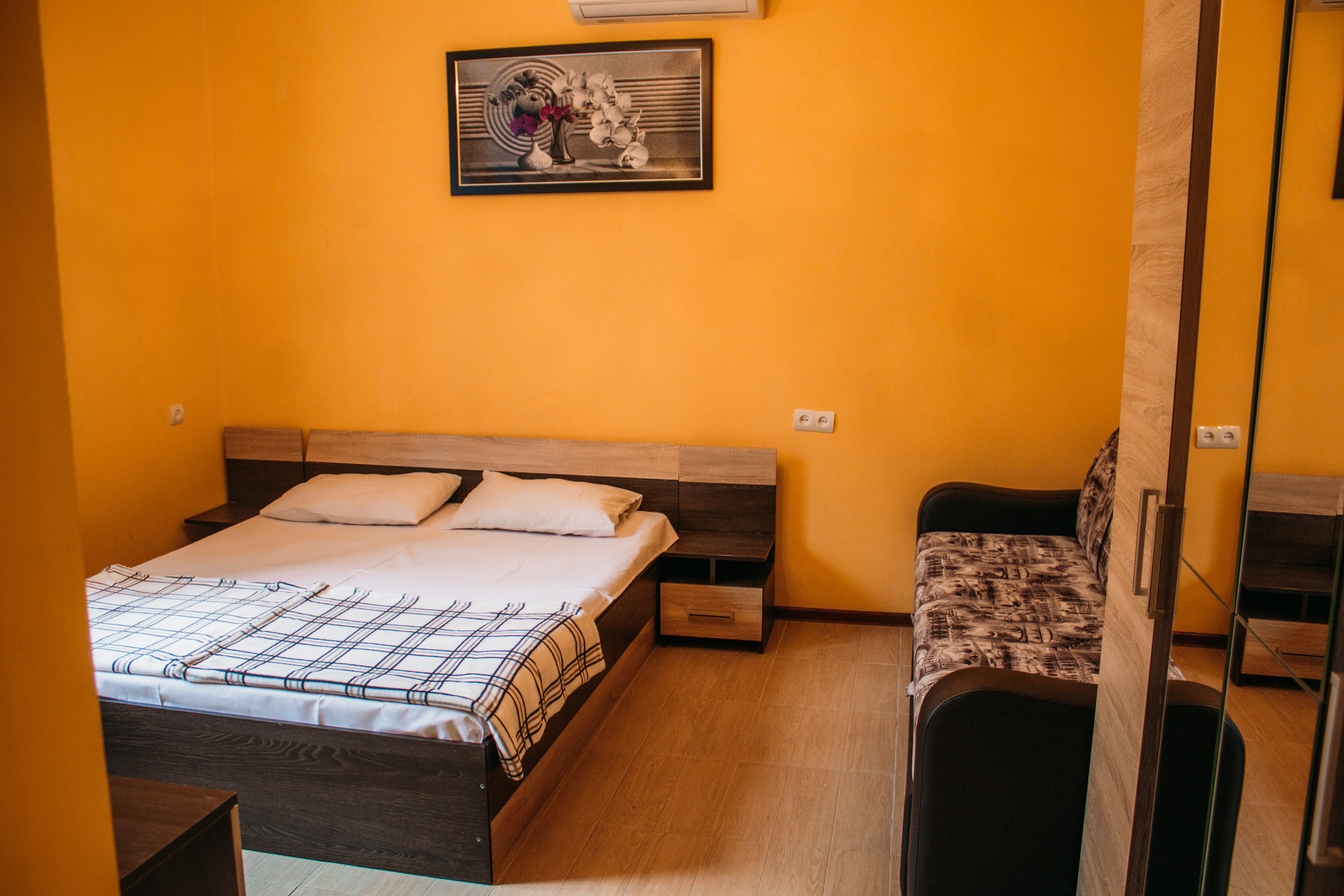 В номере: вешалка, зеркало, кровать двуспальная, прикроватные тумбочки, стол, стул, шкаф, кондиционер, мини-холодильник, телевизор