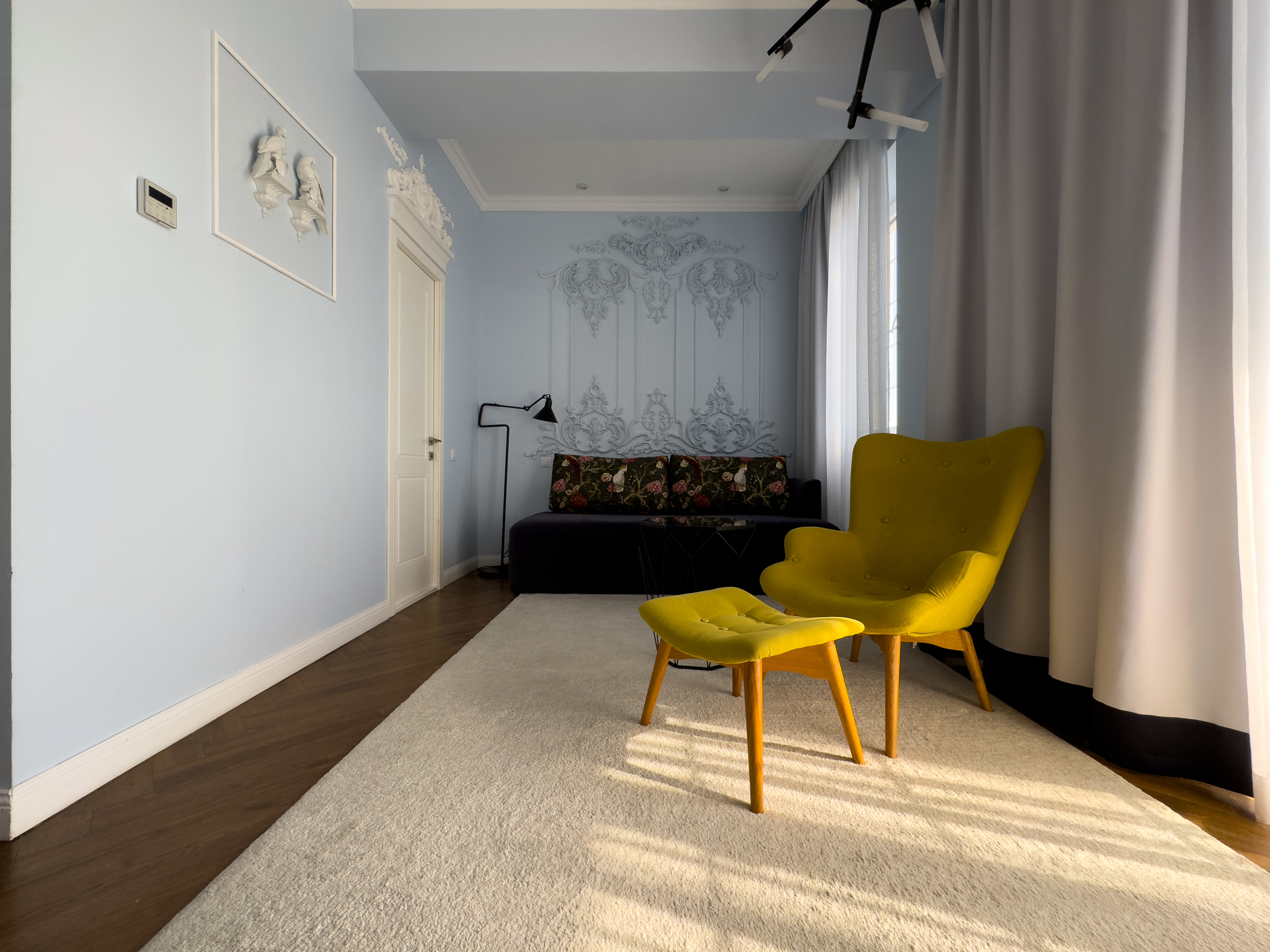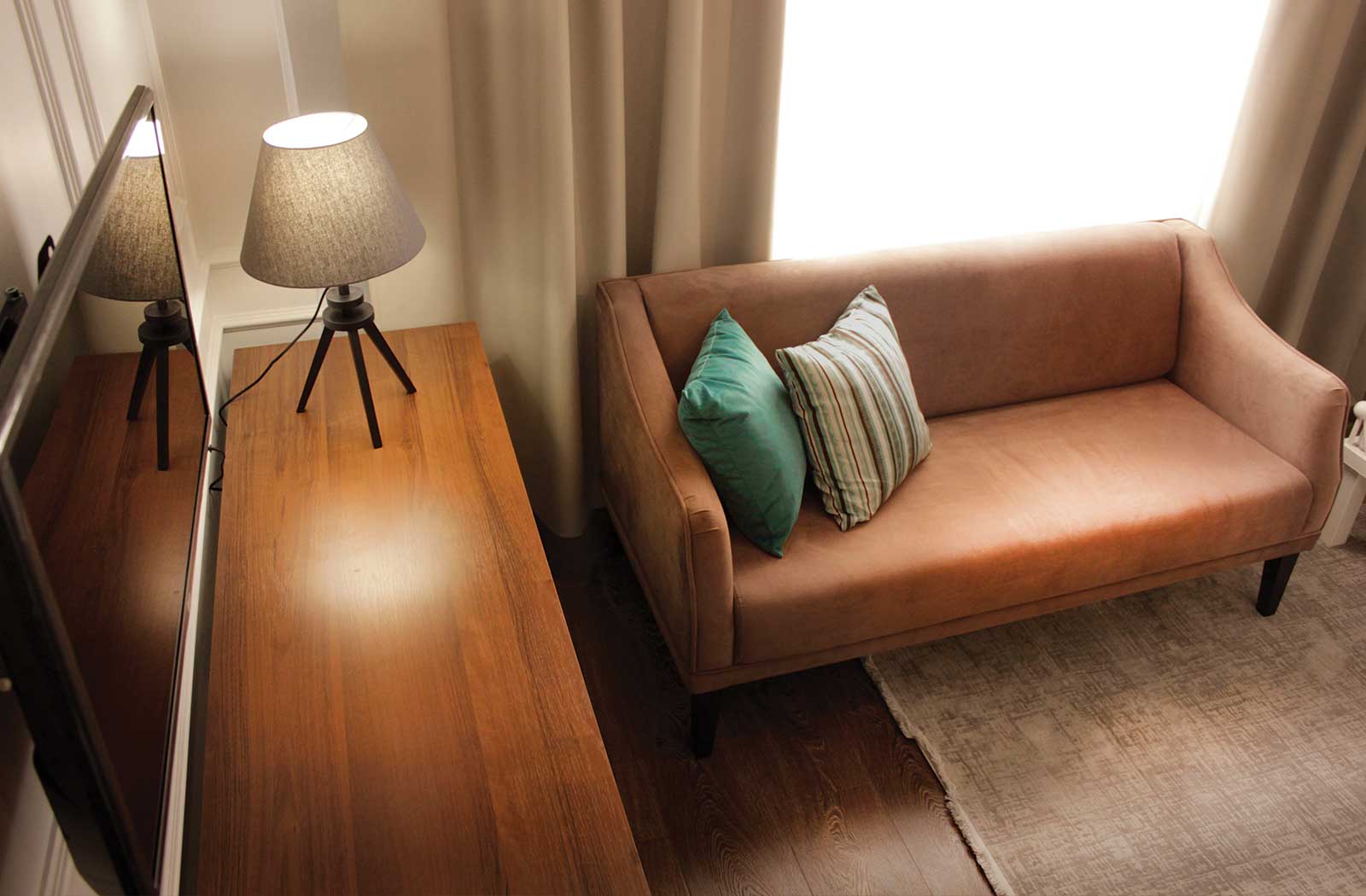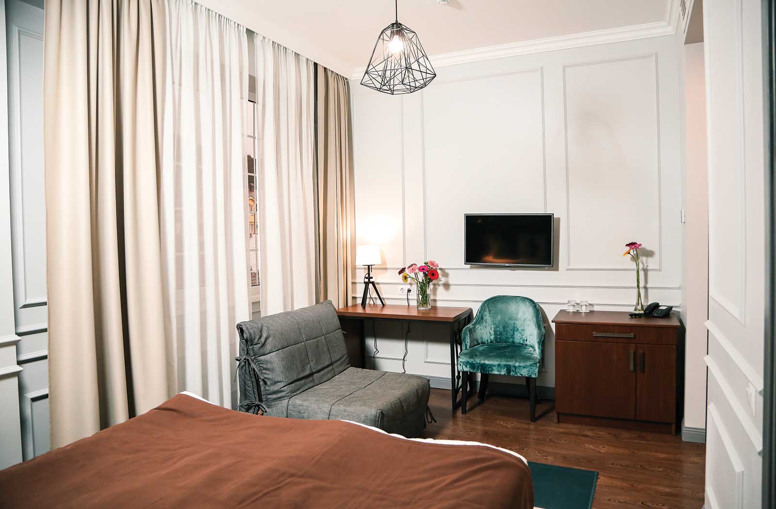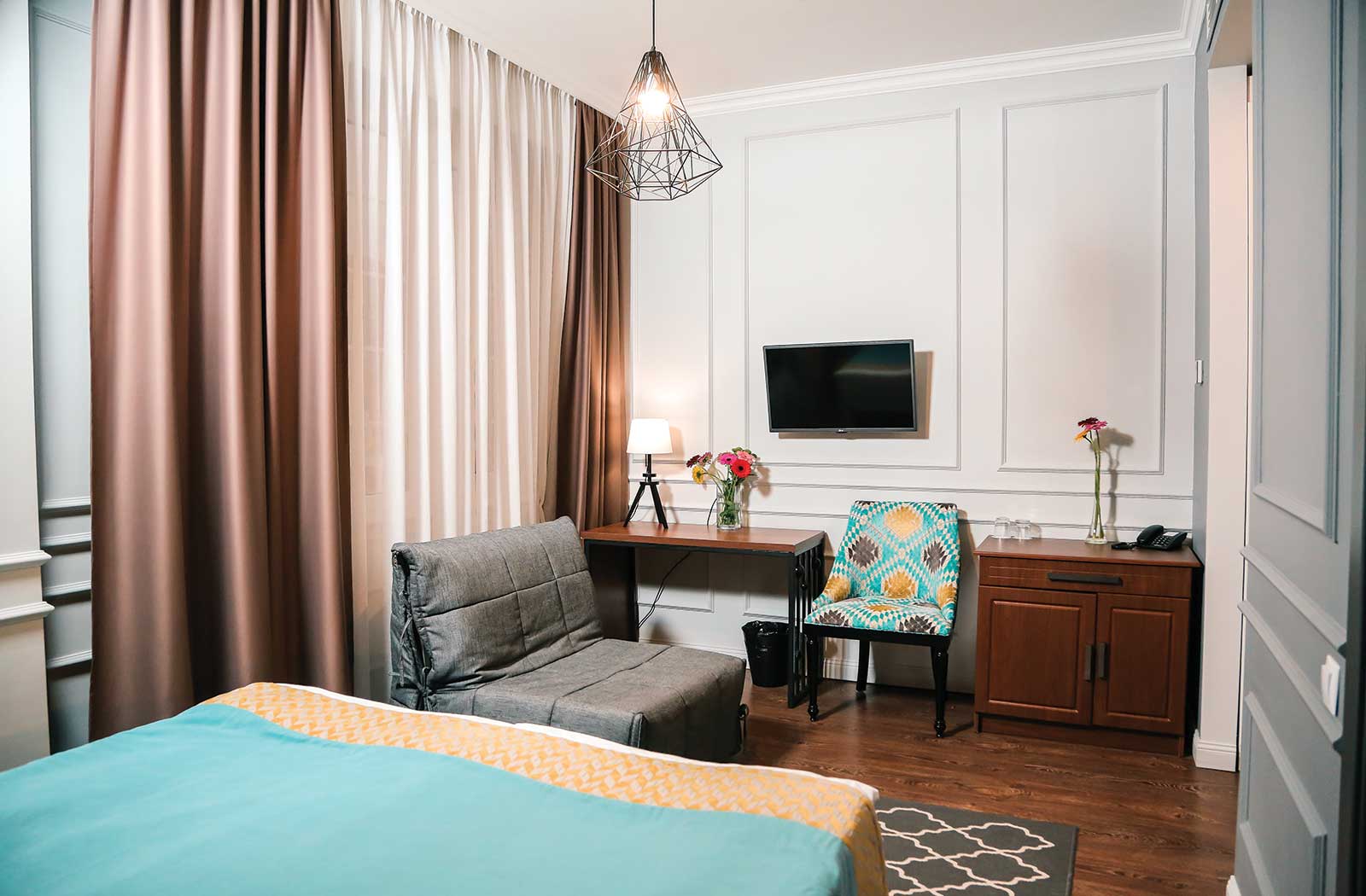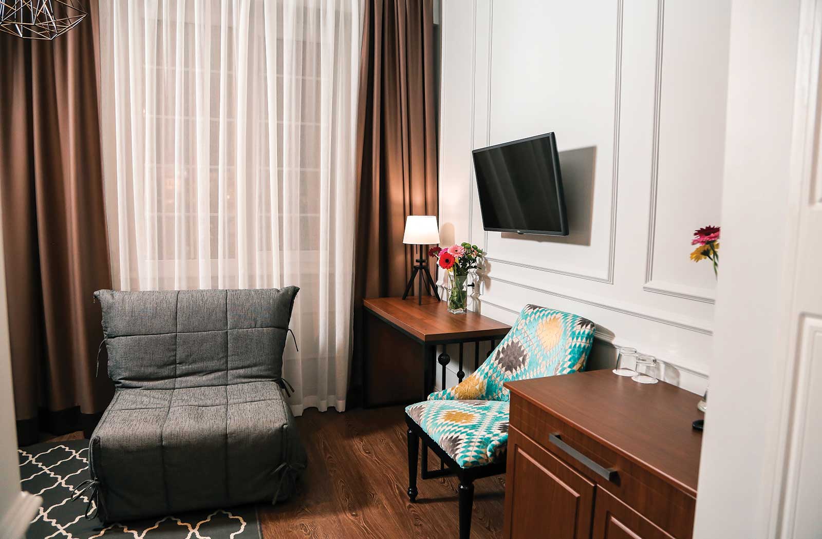 В номере: вешалка, диван раскладной, зеркало, кровать двуспальная, прикроватные тумбочки, стол, стул, шкаф, кондиционер, мини-холодильник, пляжные полотенца, сейф, телевизор, чайная станция