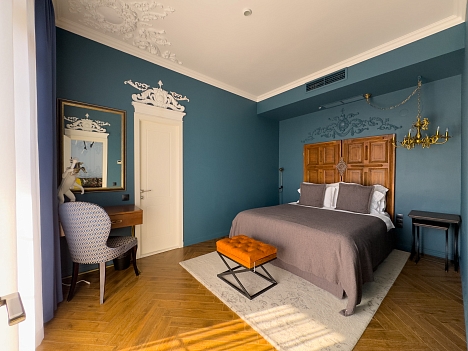 В номере: вешалка, диван, зеркало, кресло, кровать двуспальная, прикроватная тумбочка, столик кофейный, столик туалетный, стул, шкаф, кондиционер, мини-холодильник, пляжные полотенца, сейф, телевизор, чайная станция