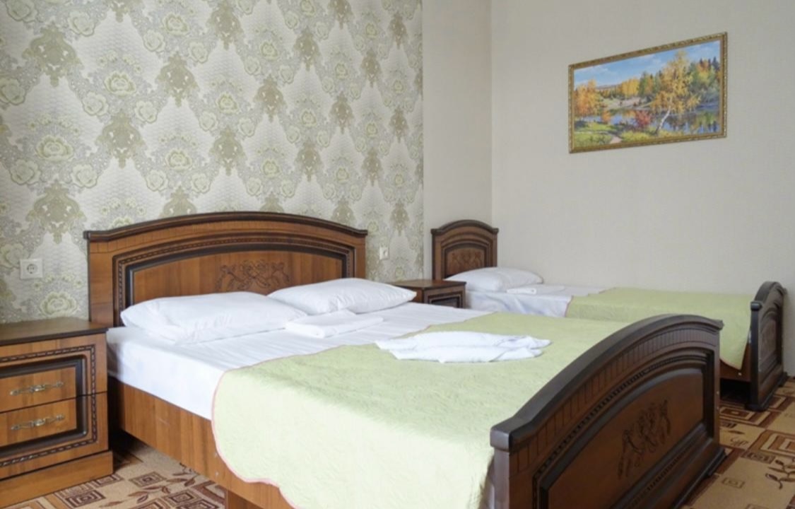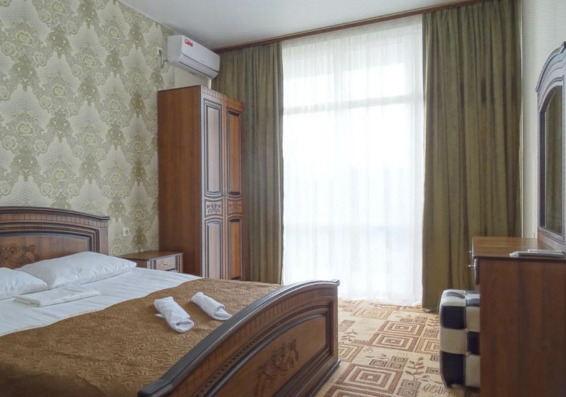 В номере: вешалка, зеркало, кресло-кровать, кровати односпальные /одна двуспальная кровать, прикроватные тумбочки, пуфик, столик туалетный, шкаф, кондиционер, телевизор, холодильник