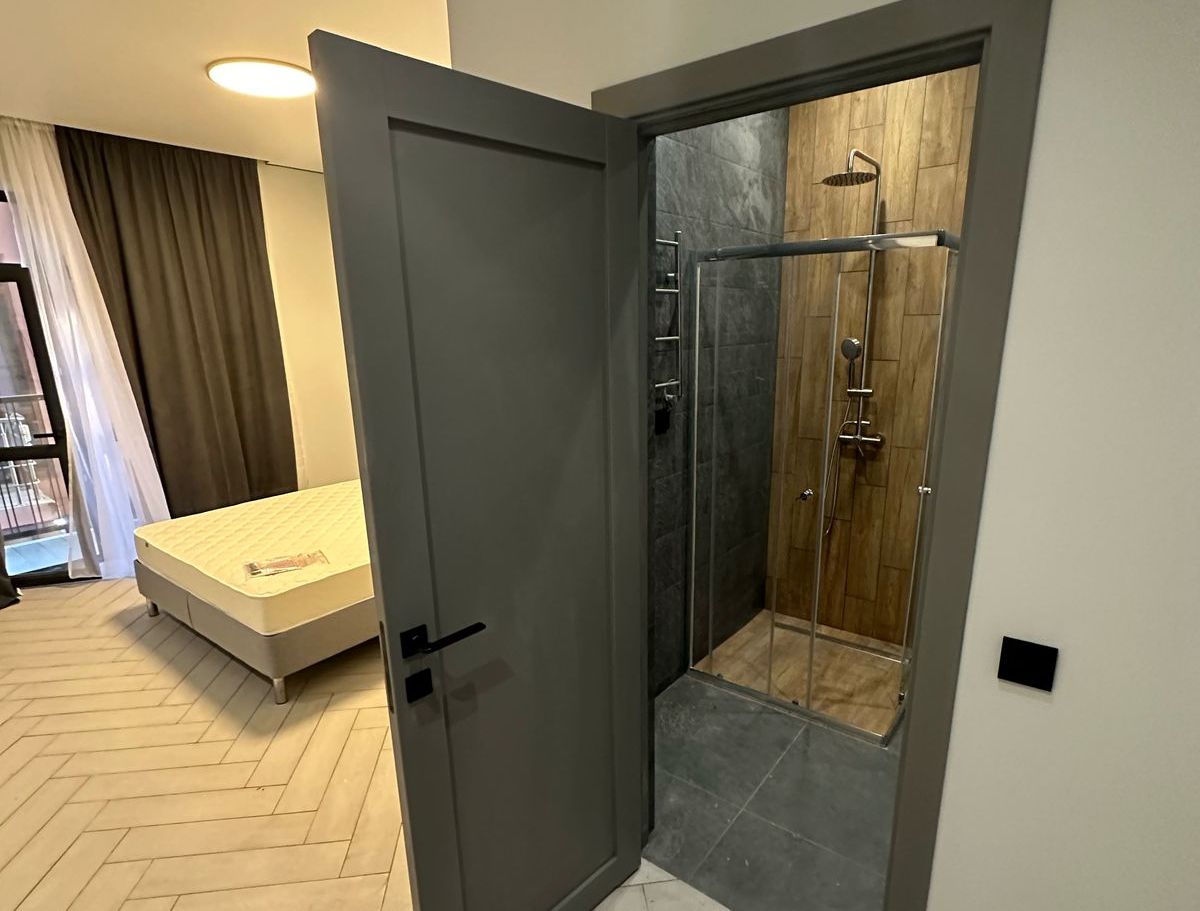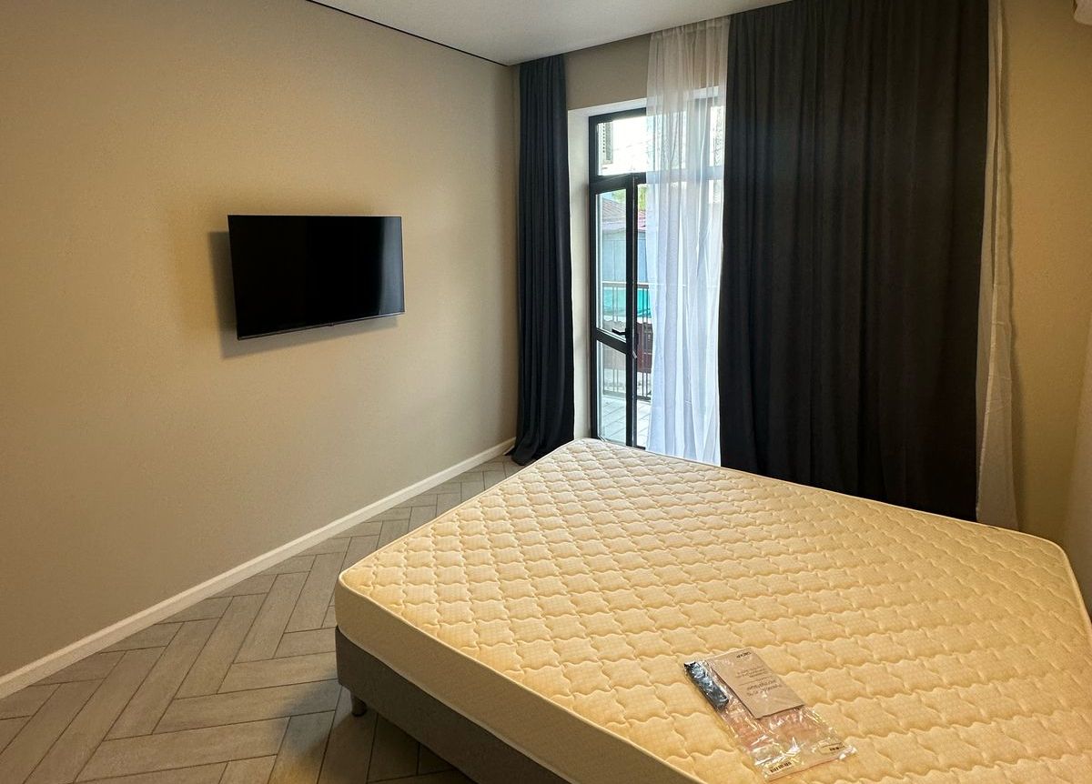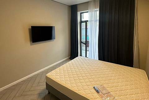В номере: вешалка, зеркало, кровать двуспальная, прикроватные тумбочки, стол, стул, шкаф, кондиционер, телевизор, теплый пол, электрочайник
