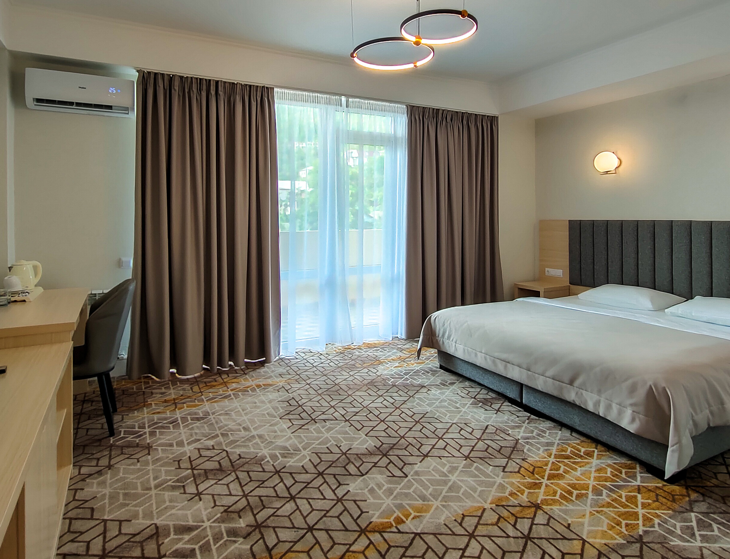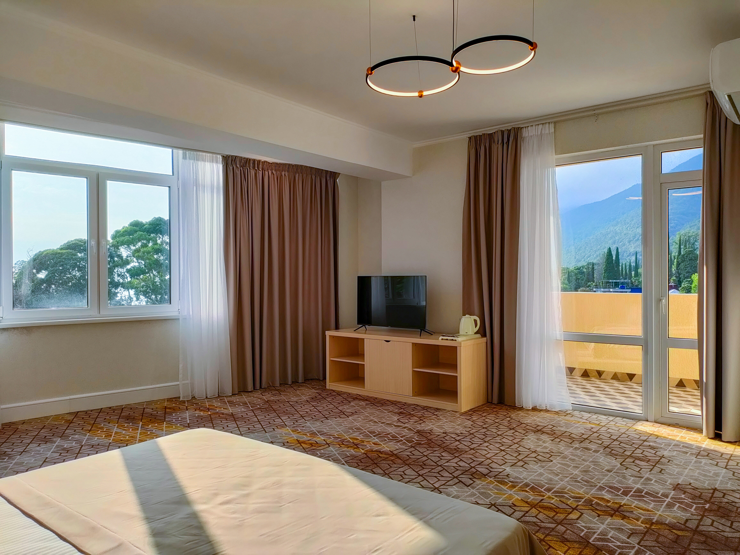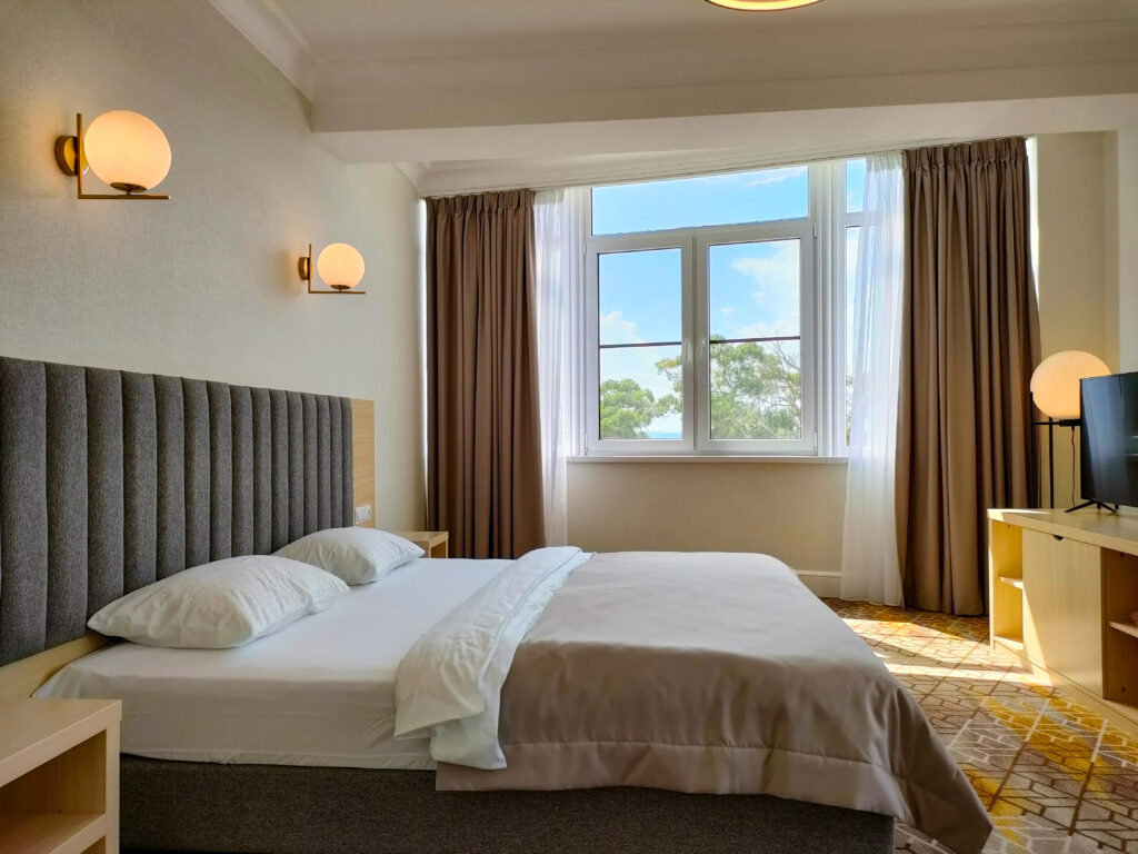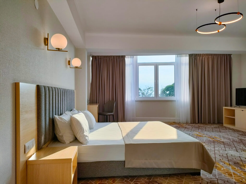 Гостей ожидают комфортабельные номера категории Стандарт, Семейный, Люкс. В номерах есть все необходимое для хорошего отдыха — установлена сплит-система, доступен беспроводной интернет, комнаты оснащены современной бытовой техникой, в индивидуальных санузлах для гостей подготовлены наборы косметических принадлежностей, а в ряде номеров предусмотрены меблированные балконы.На первом этаже работают бар с кальяном и ресторан, где отдыхающие могут заказать завтраки, обеды, ужины, продегустировать холодные и горячие напитки или просто перекусить в течение дня. К услугам гостей открытый бассейн и сауна, расположенные на крыше здания. Оттуда открываются живописные виды на горы, лес и море.В паре минут ходьбы находится городской песчано-галечный пляж. Пляж оборудован — установлены раздевалки, лежаки, навесы, работает прокат пляжных принадлежностей.