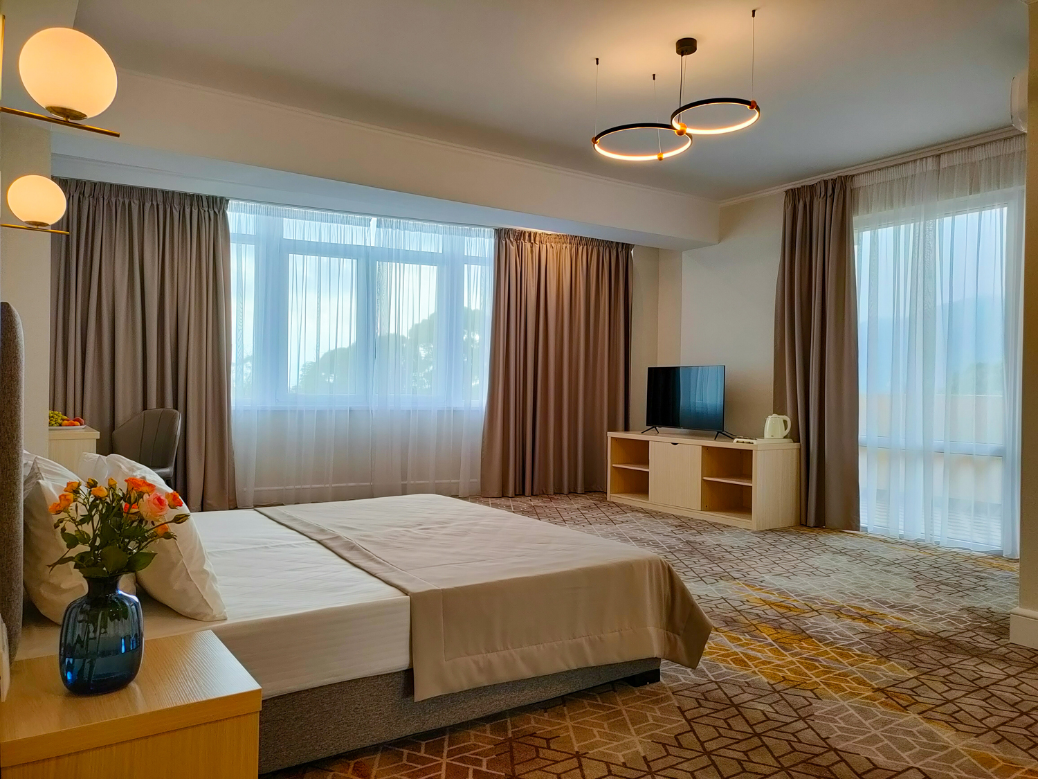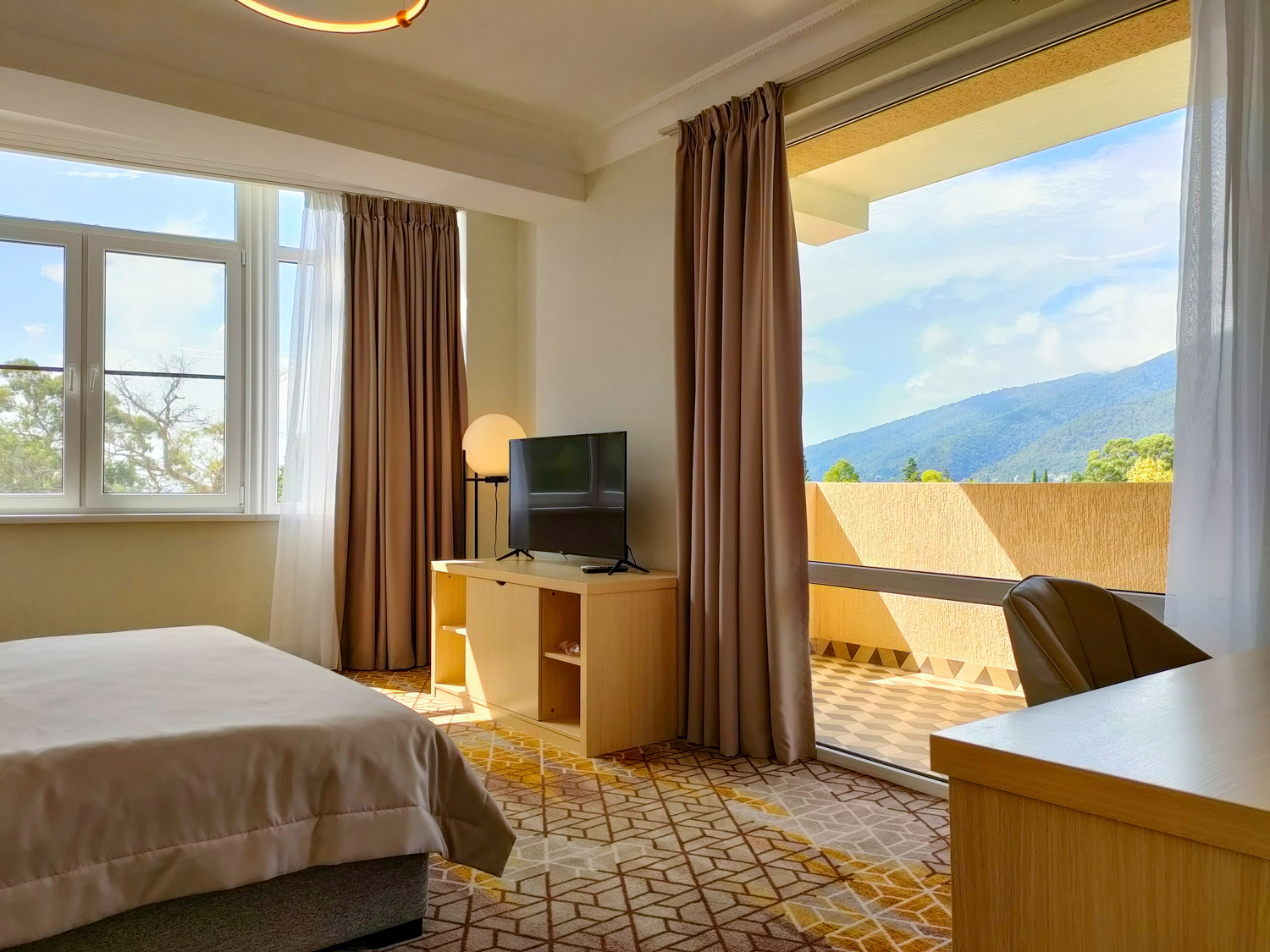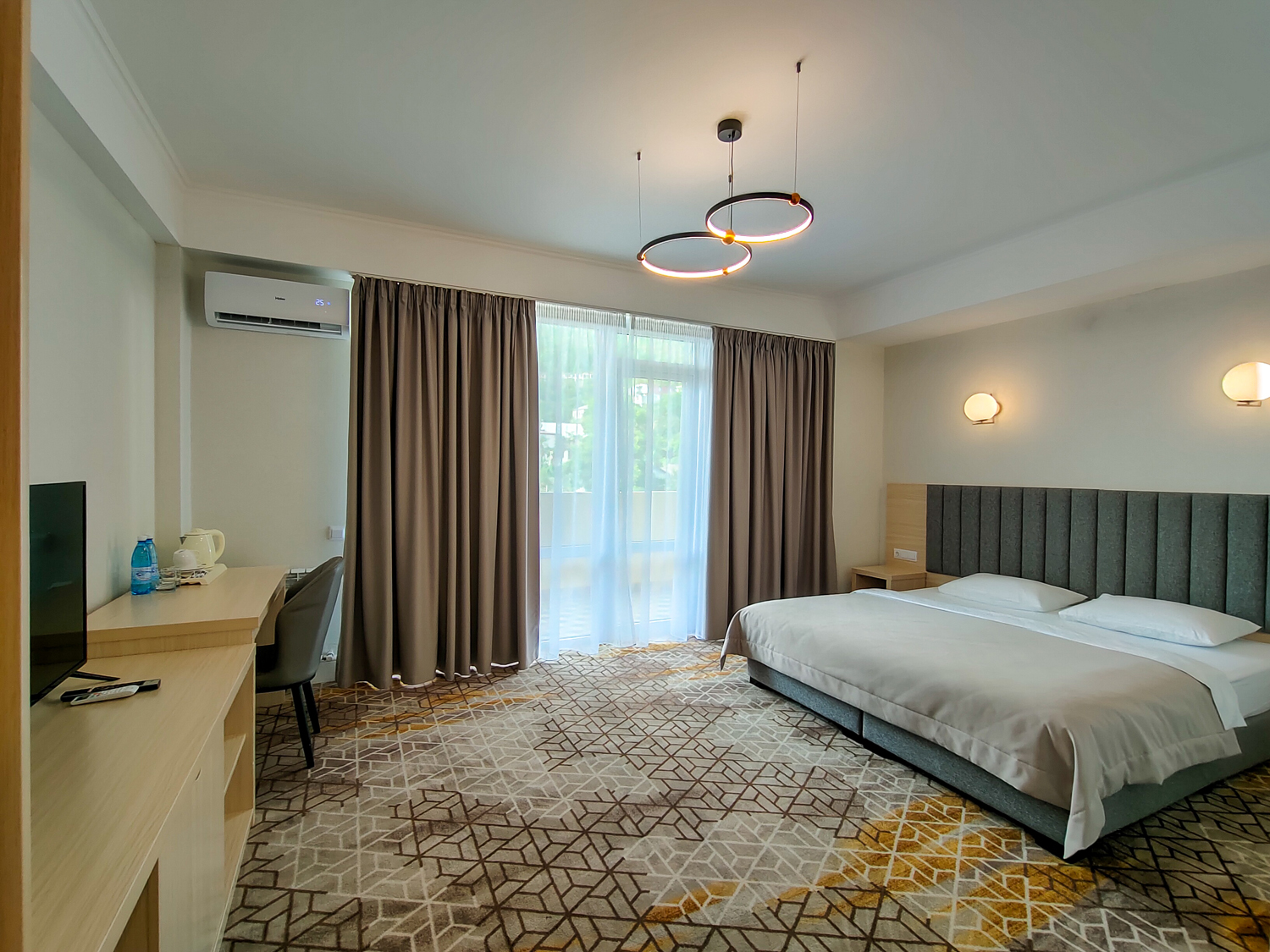 Гостей ожидают комфортабельные номера категории Стандарт, Семейный, Люкс. В номерах есть все необходимое для хорошего отдыха — установлена сплит-система, доступен беспроводной интернет, комнаты оснащены современной бытовой техникой, в индивидуальных санузлах для гостей подготовлены наборы косметических принадлежностей, а в ряде номеров предусмотрены меблированные балконы.На первом этаже работают бар с кальяном и ресторан, где отдыхающие могут заказать завтраки, обеды, ужины, продегустировать холодные и горячие напитки или просто перекусить в течение дня. К услугам гостей открытый бассейн и сауна, расположенные на крыше здания. Оттуда открываются живописные виды на горы, лес и море.В паре минут ходьбы находится городской песчано-галечный пляж. Пляж оборудован — установлены раздевалки, лежаки, навесы, работает прокат пляжных принадлежностей.