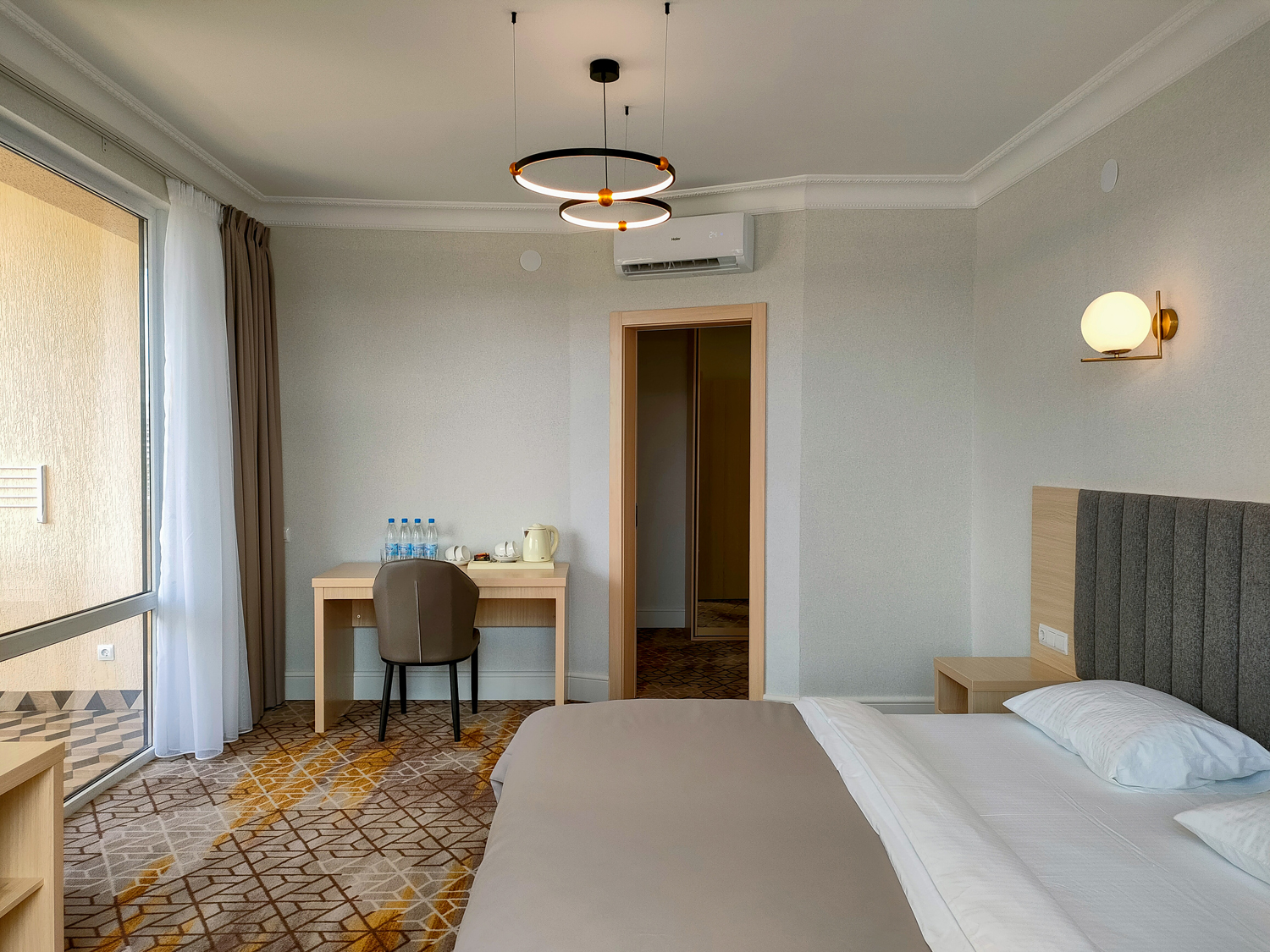 В номере: вешалка, зеркало, кровать двуспальная, прикроватные тумбочки, стол, стулья, тумба под телевизор, шкаф, мини-холодильник, пляжные полотенца, сейф, сплит-система, телевизор ЖК, телефон, чайная станция