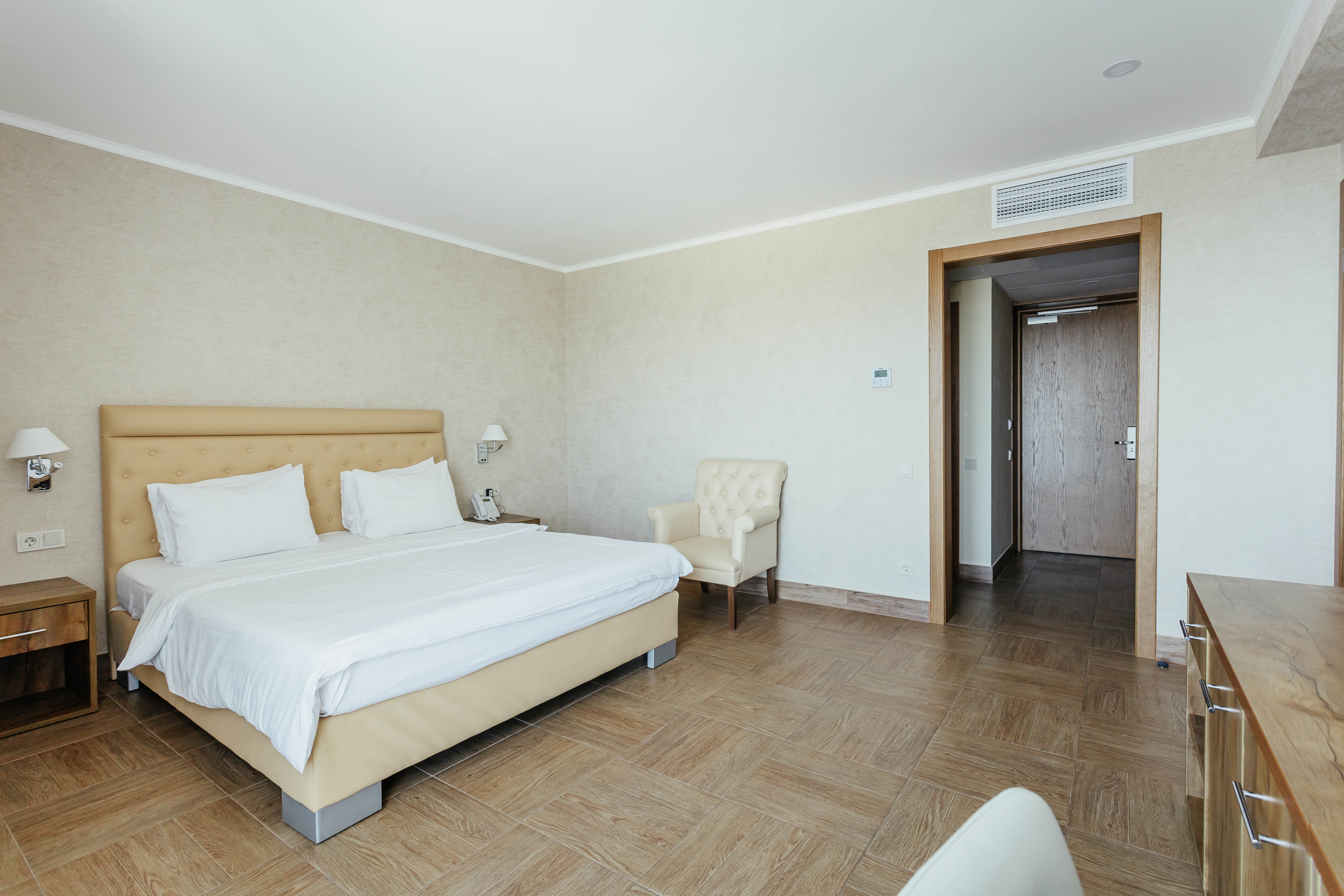 В номере: вешалка, диван раскладной, зеркало, кресло, кровать двуспальная, прикроватные тумбочки, стол, столик журнальный, стул, шкаф, сейф, сплит-система, телевизор, телефон, холодильник, чайная станция