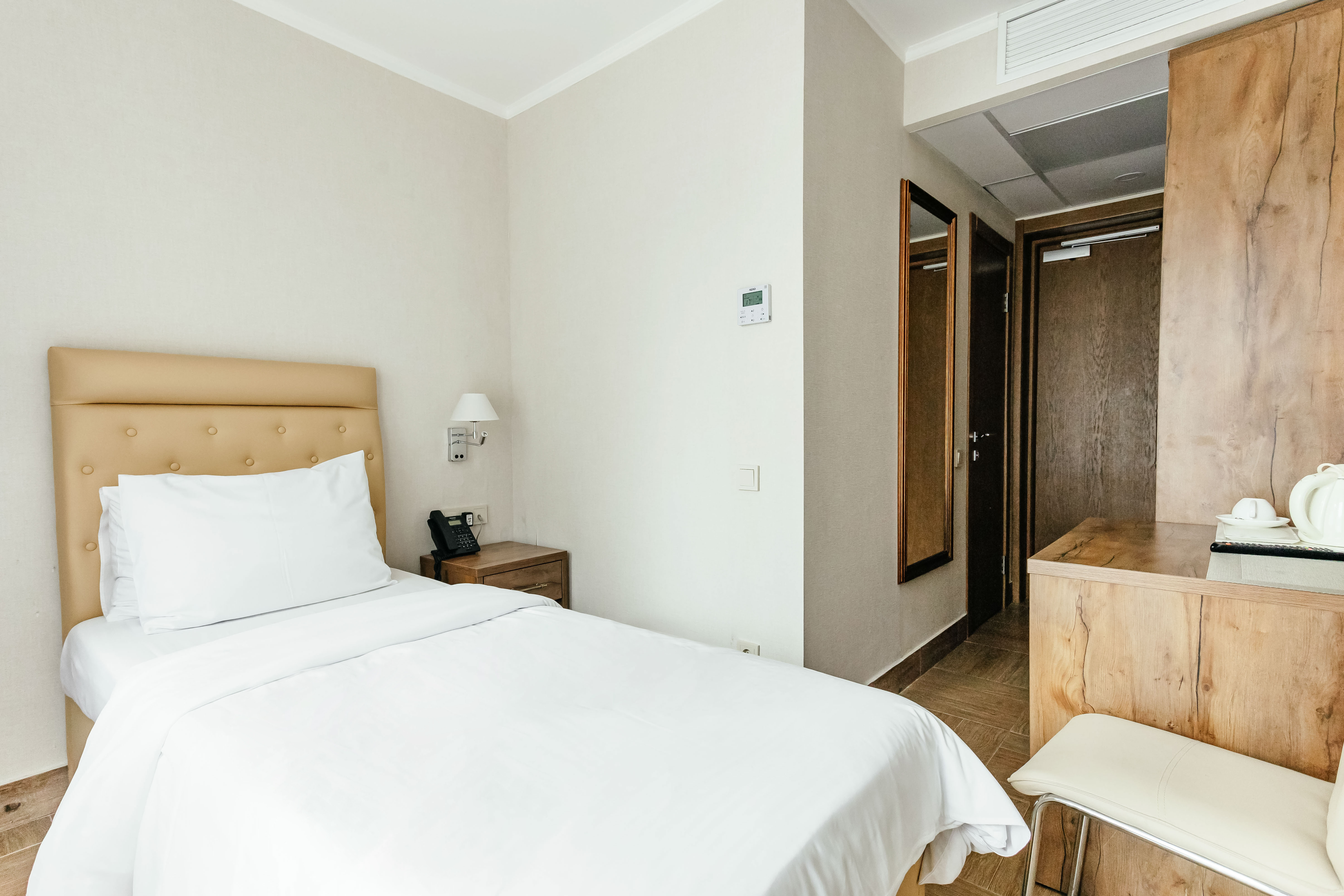 В номере: вешалка, зеркало, кровать односпальная, прикроватная тумбочка, стол, стул, шкаф, сейф, сплит-система, телевизор, телефон, холодильник, чайная станция