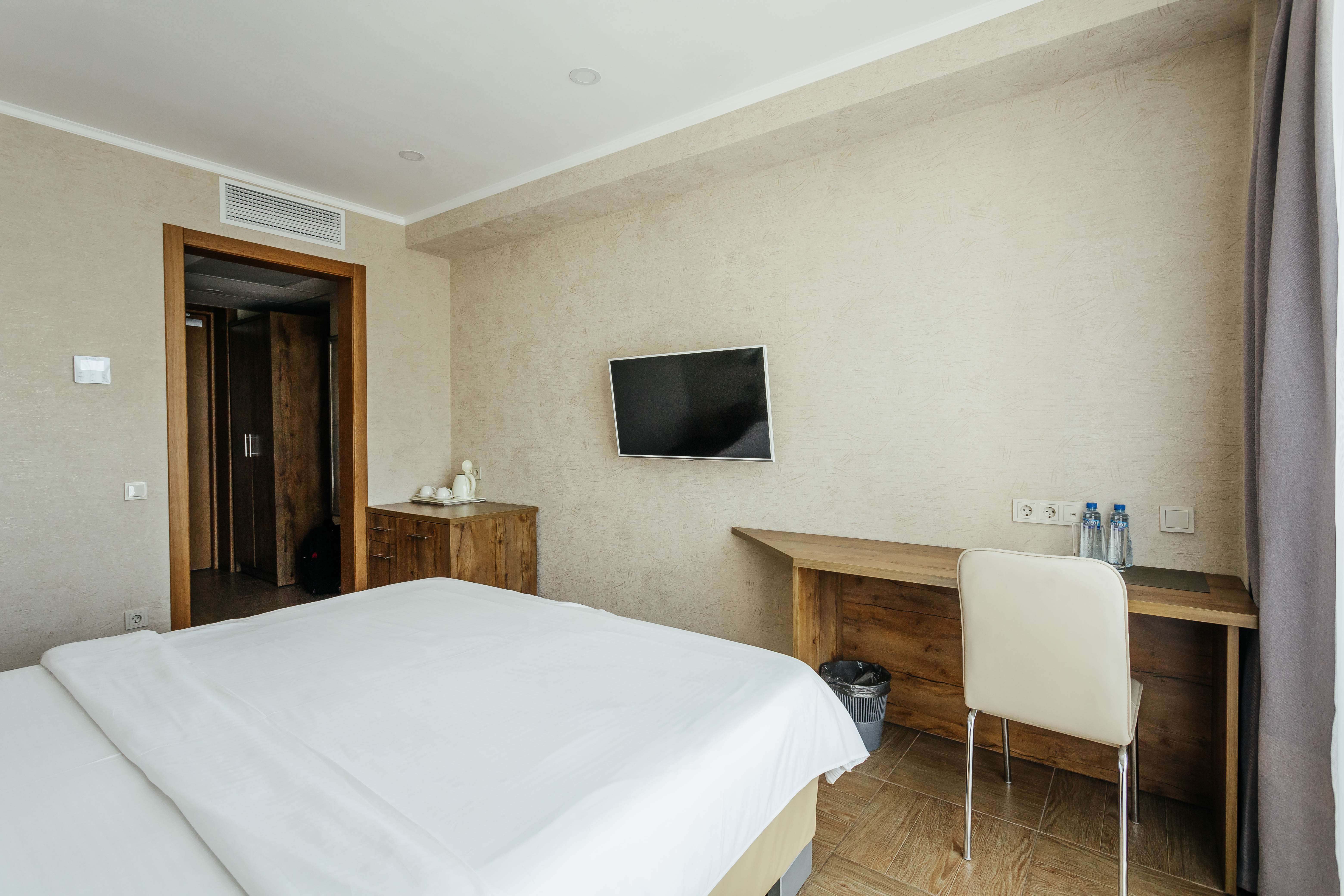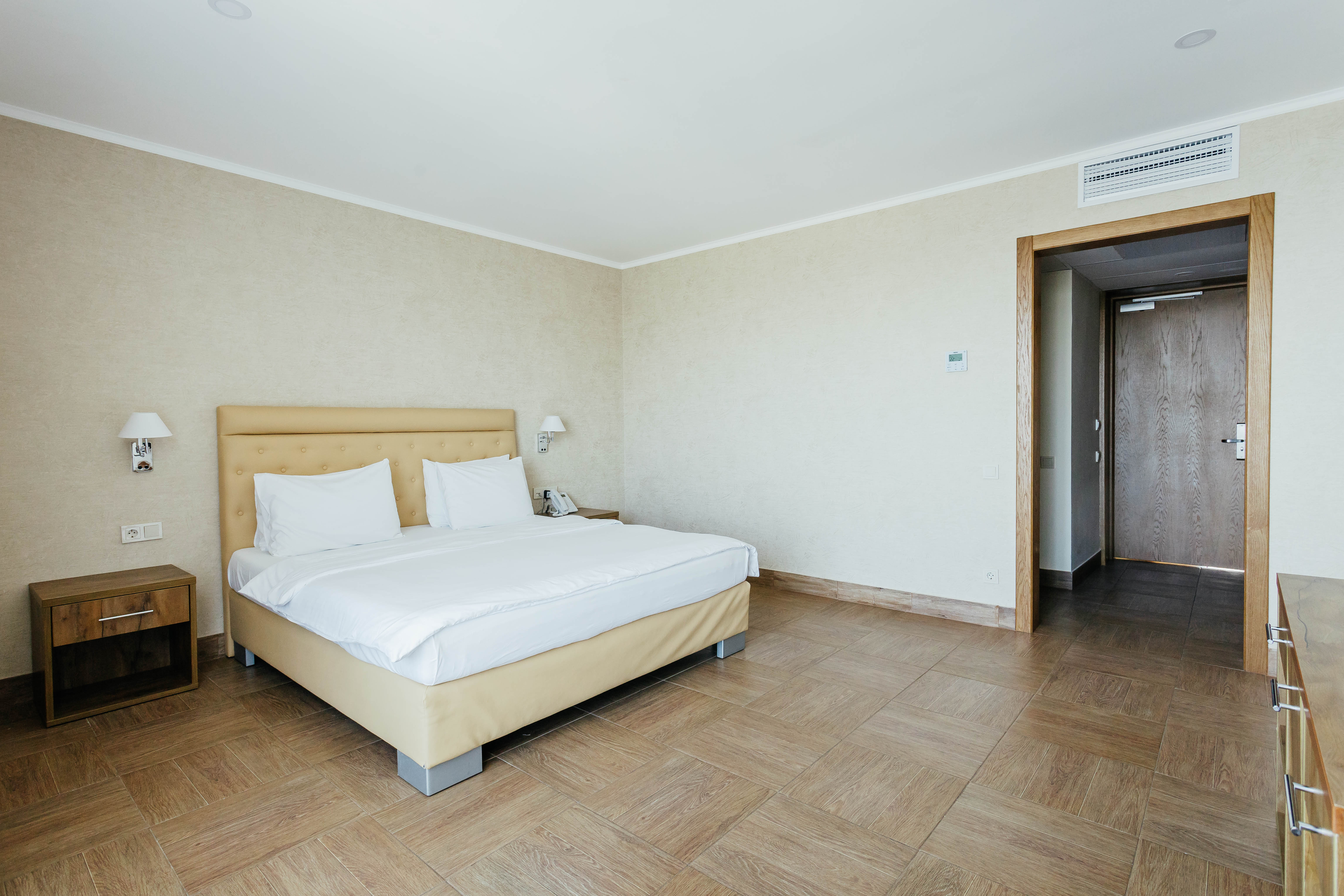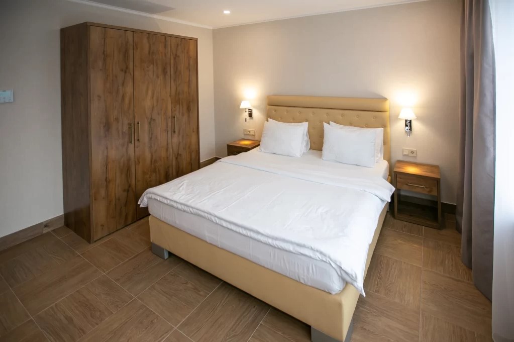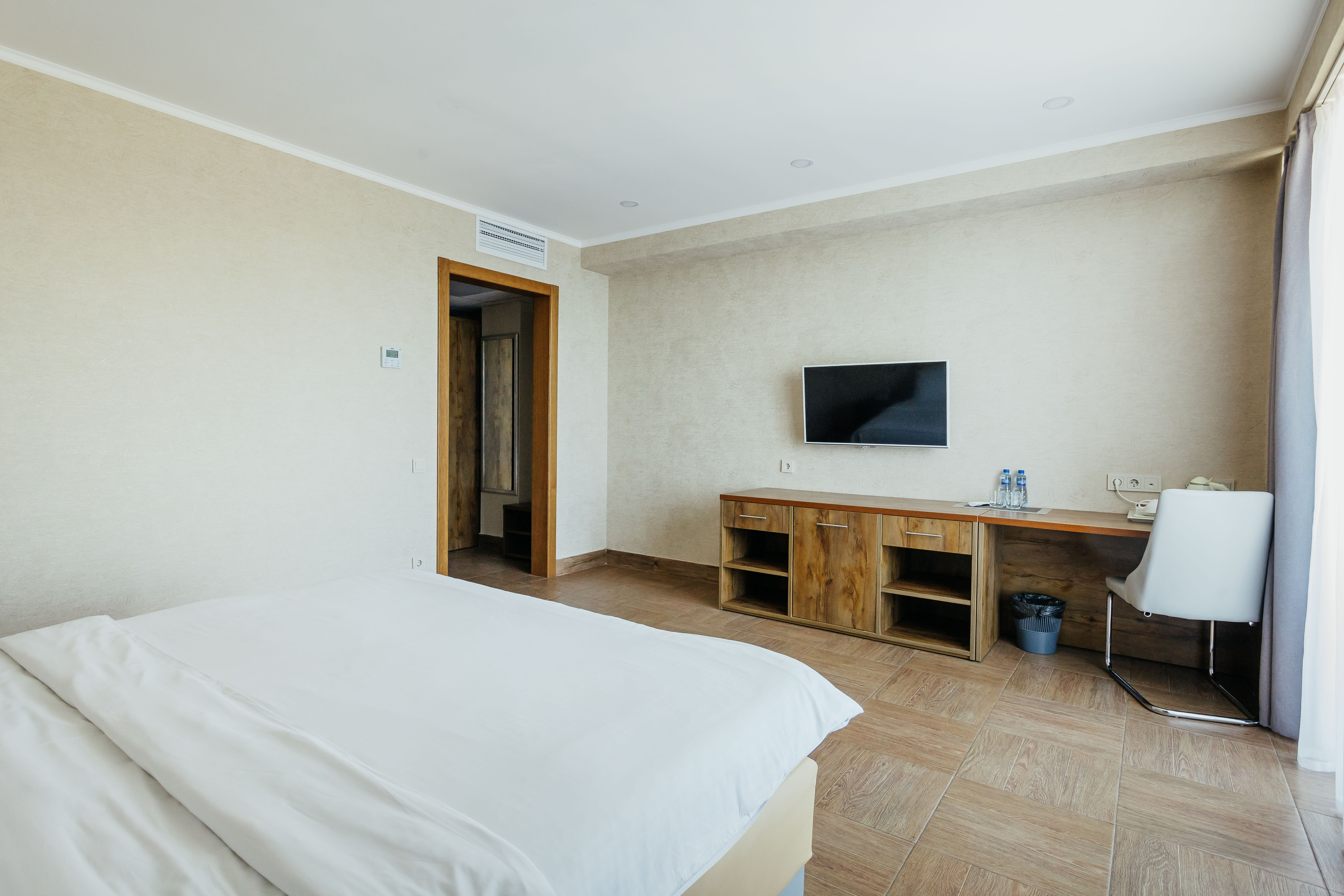 В номере: вешалка, диван раскладной, зеркало, кровать двуспальная, прикроватные тумбочки, стол, столик журнальный, стул, шкаф, сейф, сплит-система, телевизор, телефон, холодильник, чайная станция