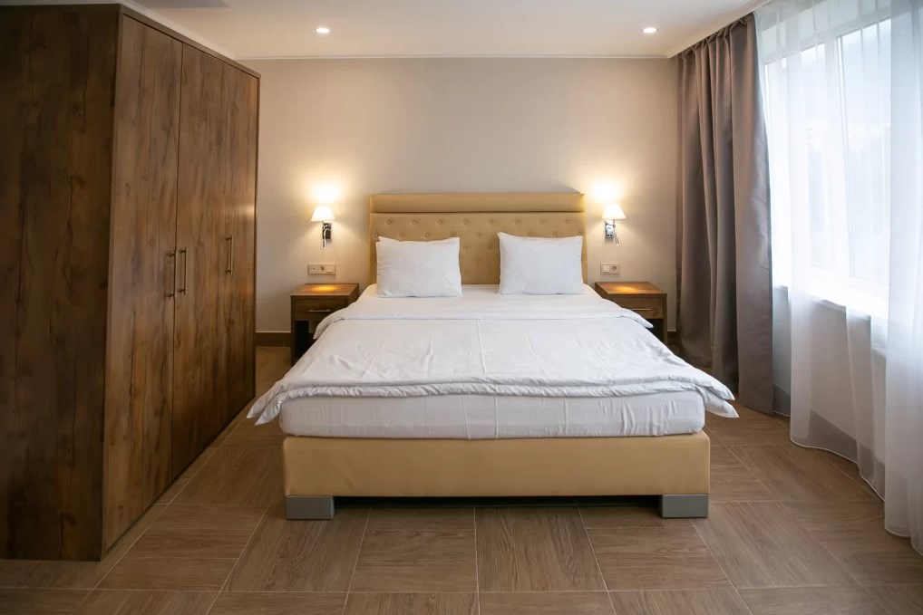 В номере: вешалка, диван, зеркало, кровать двуспальная, прикроватные тумбочки, стол, стулья, шкаф, сейф, сплит-система, телевизор, телефон, холодильник, чайная станция