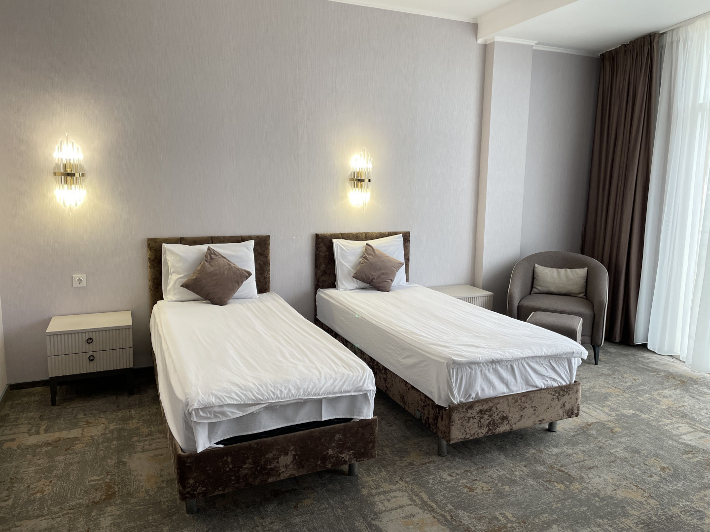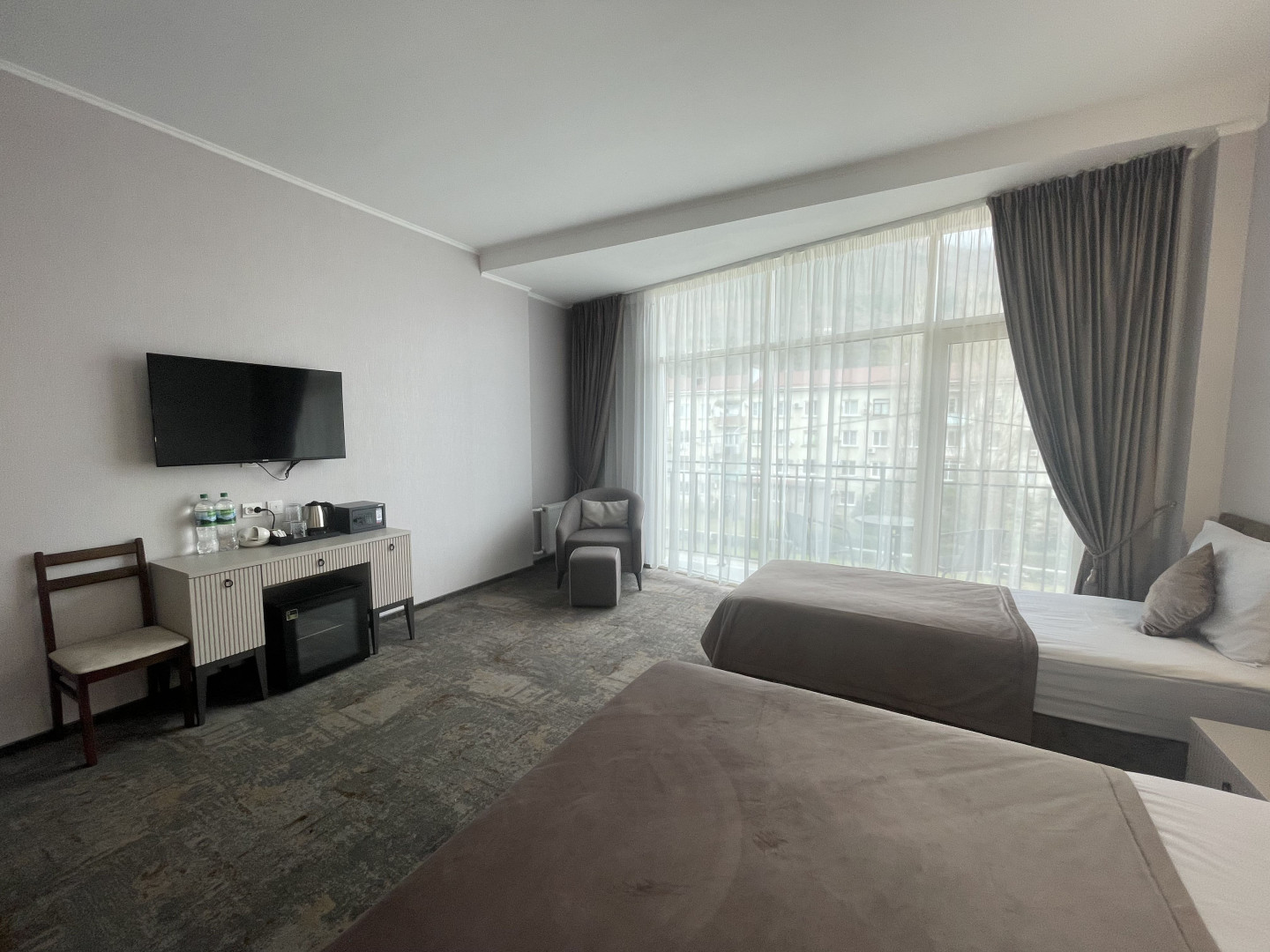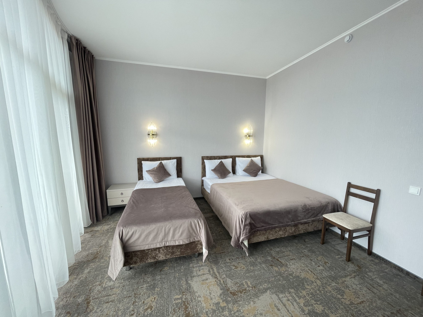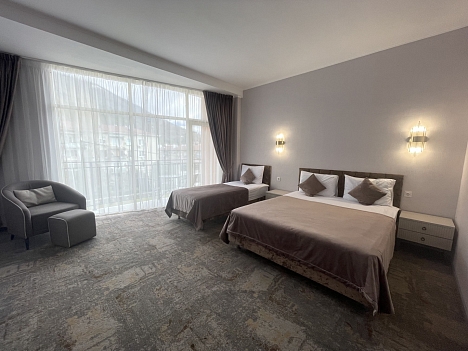 В номере: вешалка, зеркало, кровать двуспальная, кровать односпальная, прикроватные тумбочки, стол, стул, шкаф, кондиционер, телевизор, холодильник