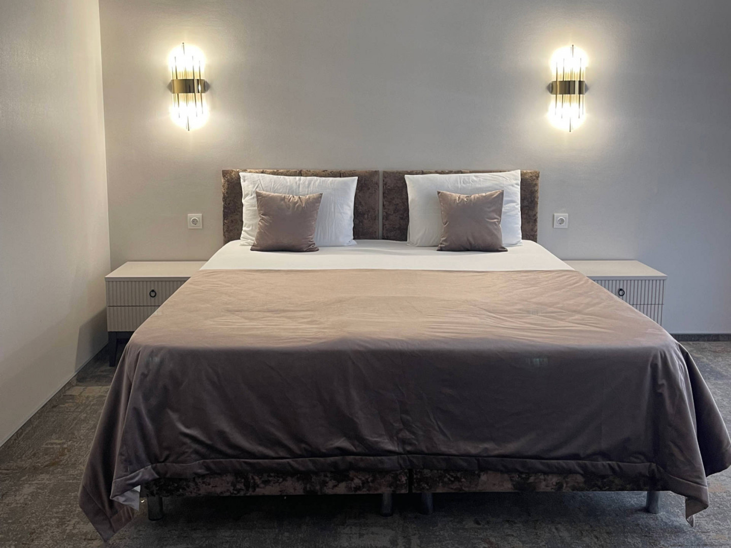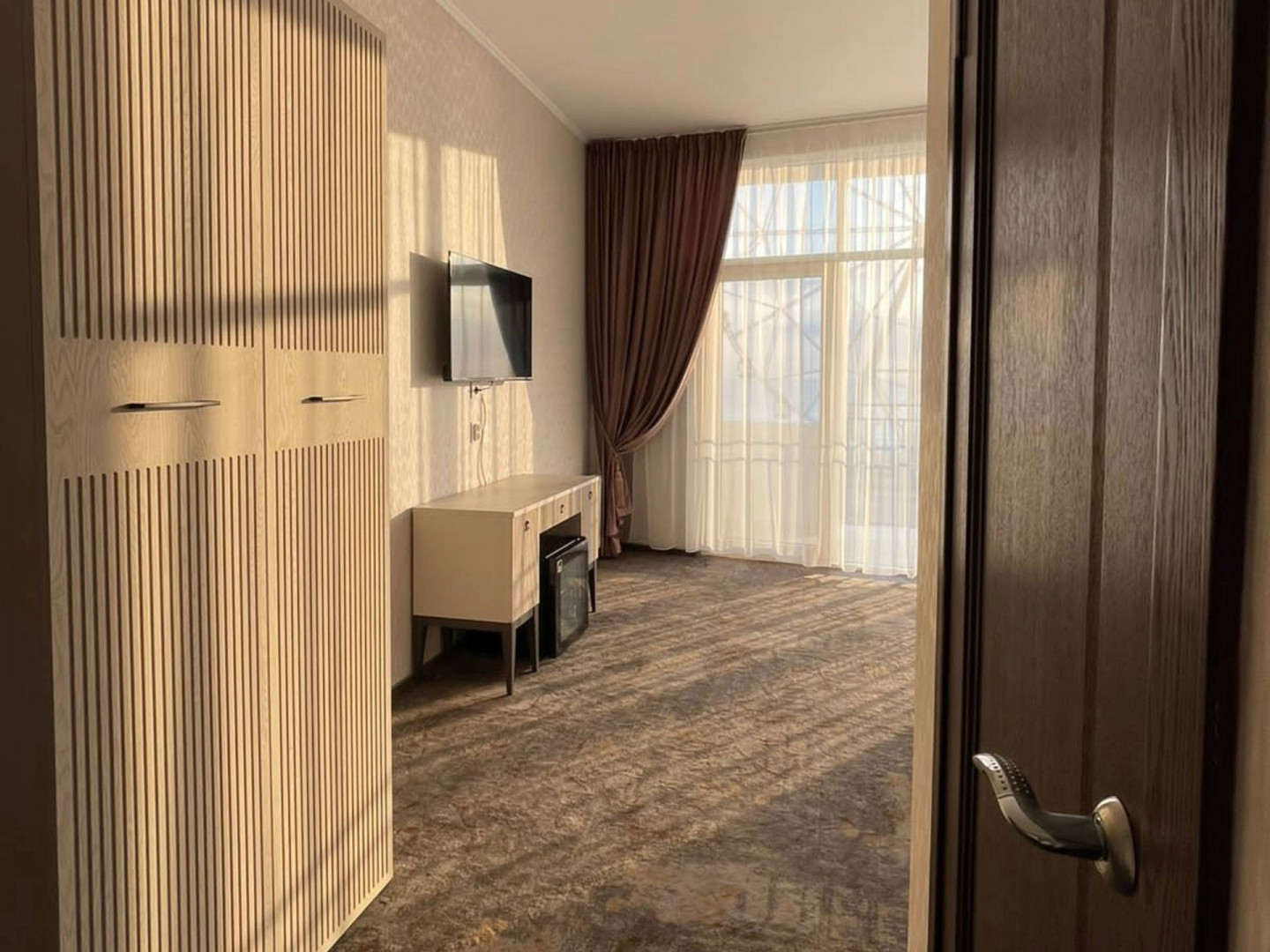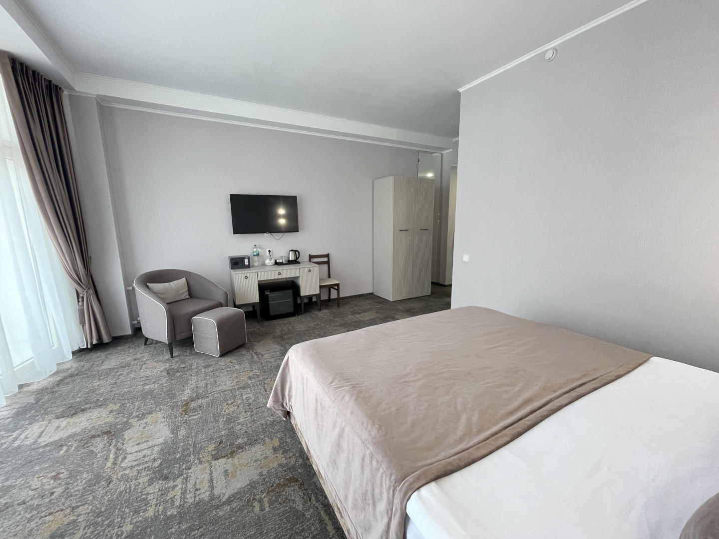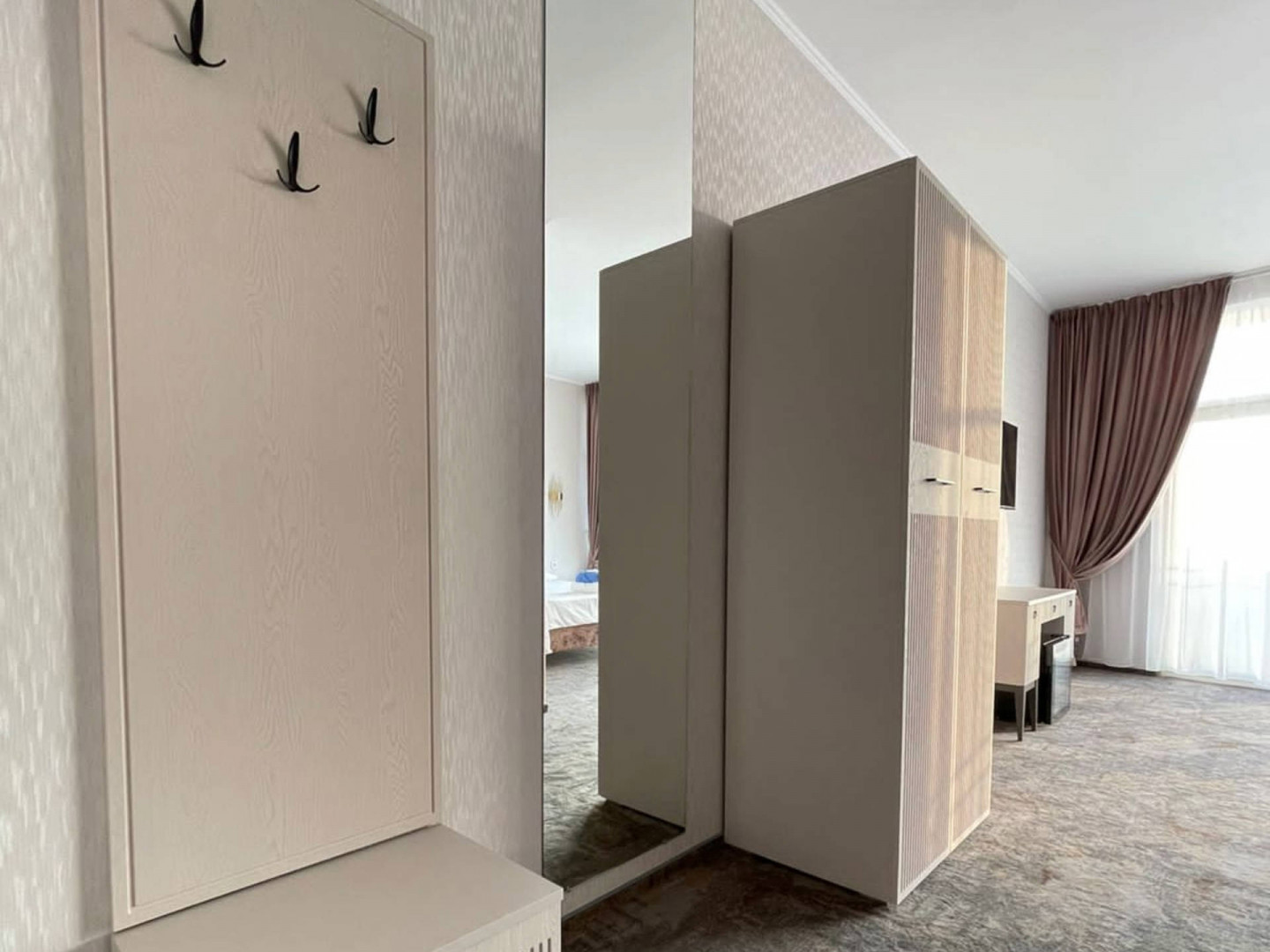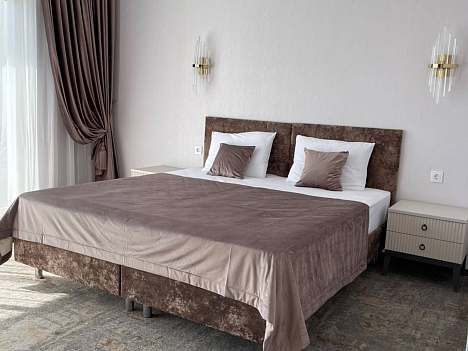 В номере: вешалка, диван раскладной, зеркало, кровать двуспальная, прикроватные тумбочки, стол, стул, шкаф, кондиционер, телевизор, холодильник
