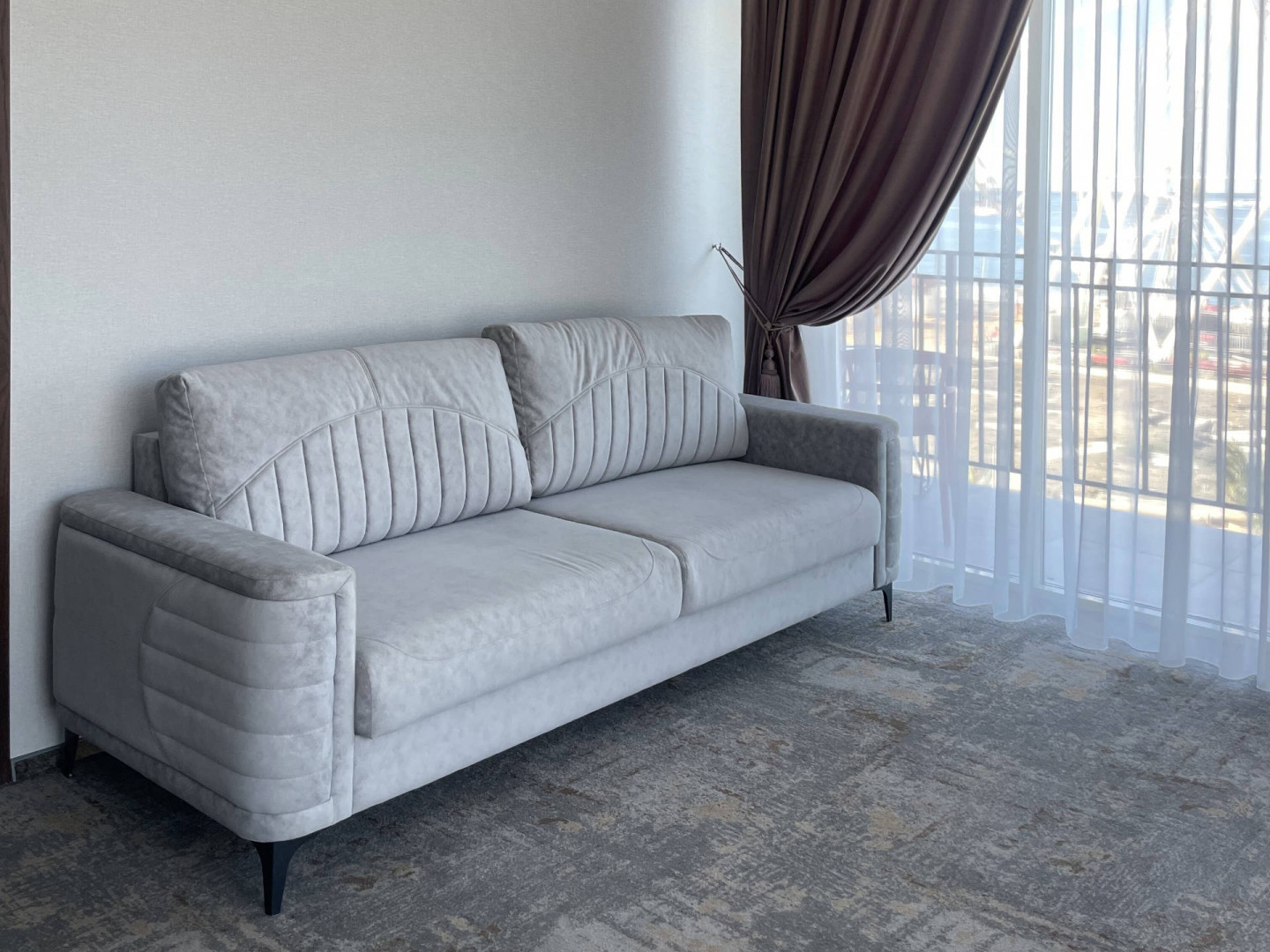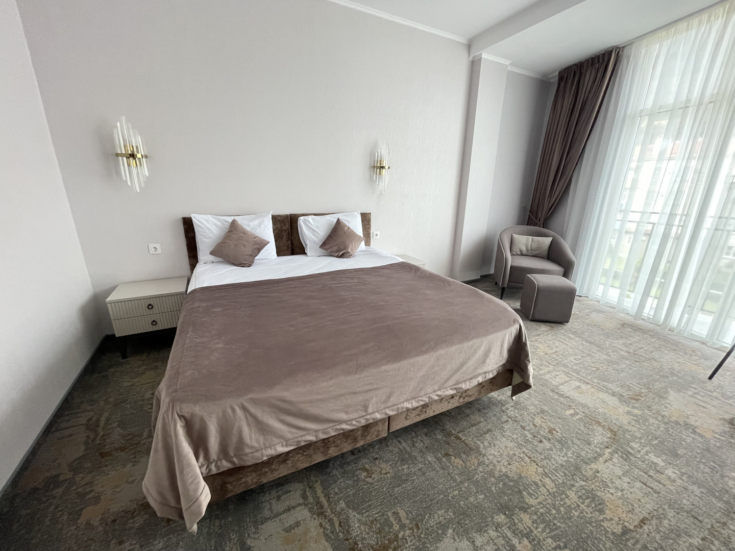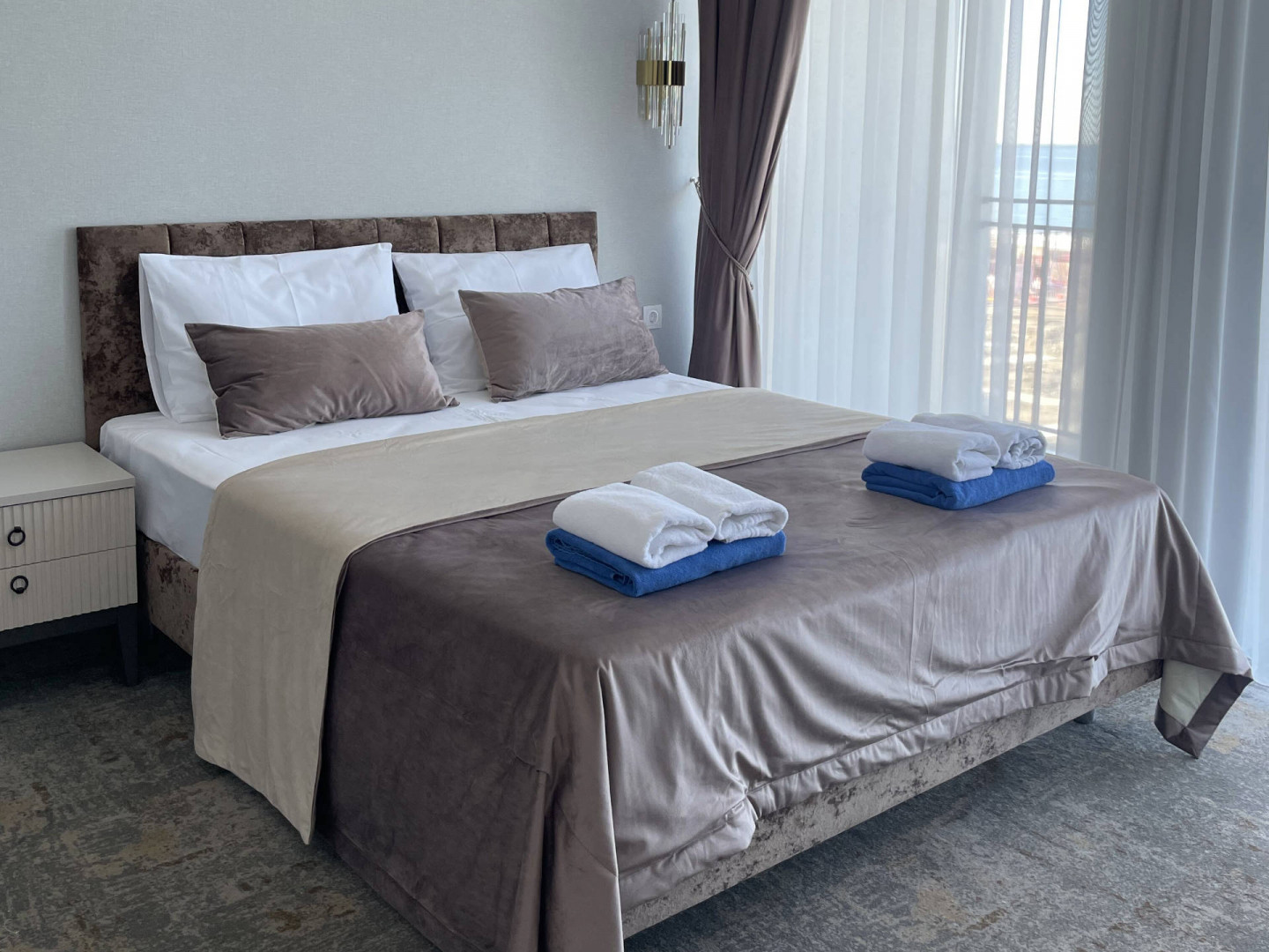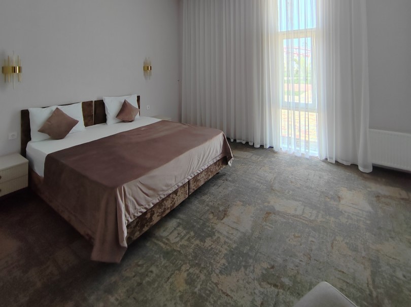 В номере: вешалка, диван раскладной, зеркало, кровать двуспальная, прикроватные тумбочки, стол, стул, шкаф, кондиционер, телевизор, холодильник