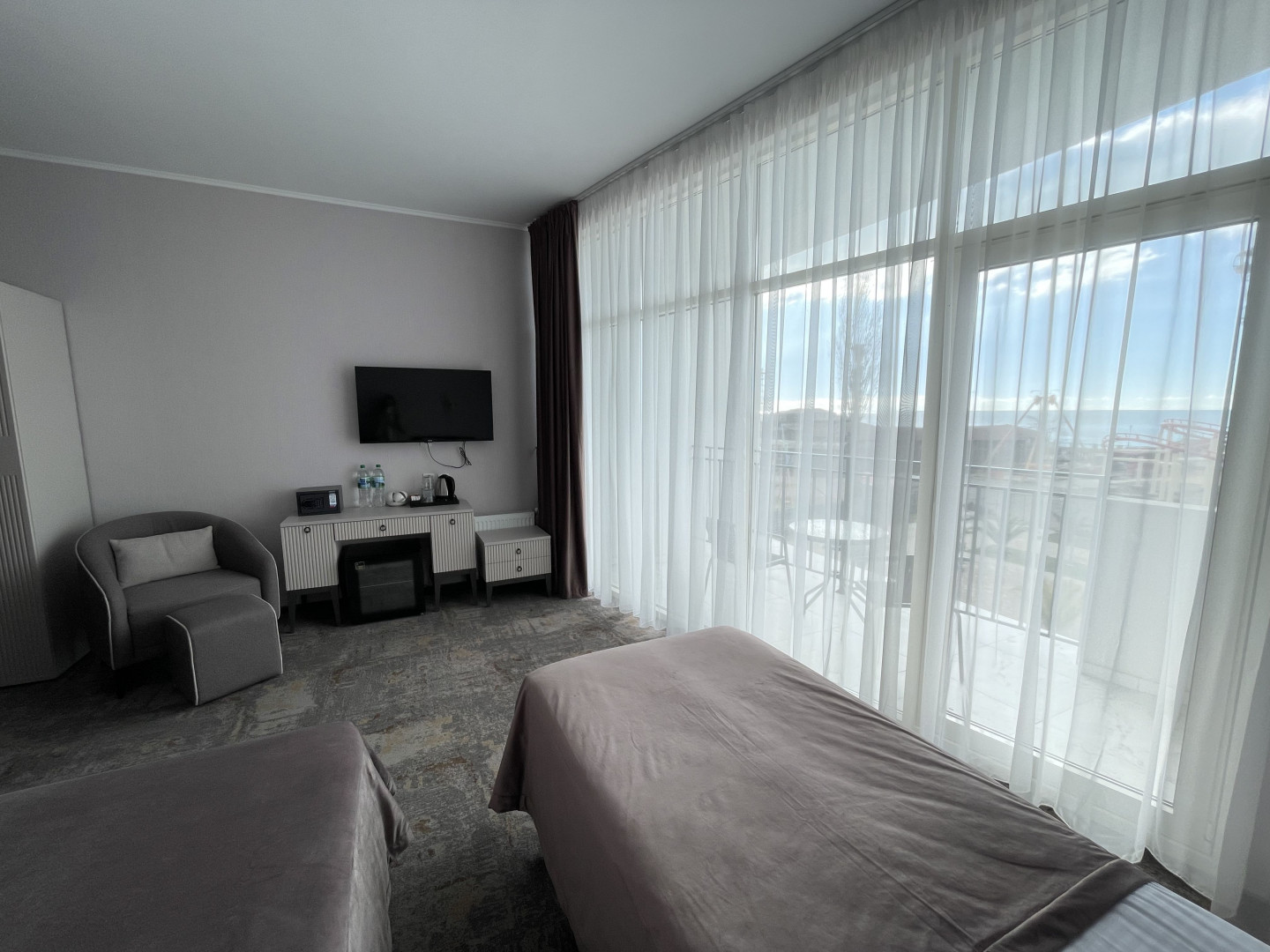 В номере: вешалка, зеркало, кровати односпальные /одна двуспальная кровать, прикроватные тумбочки, стол, стул, шкаф, кондиционер, телевизор, холодильник