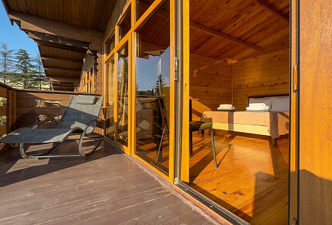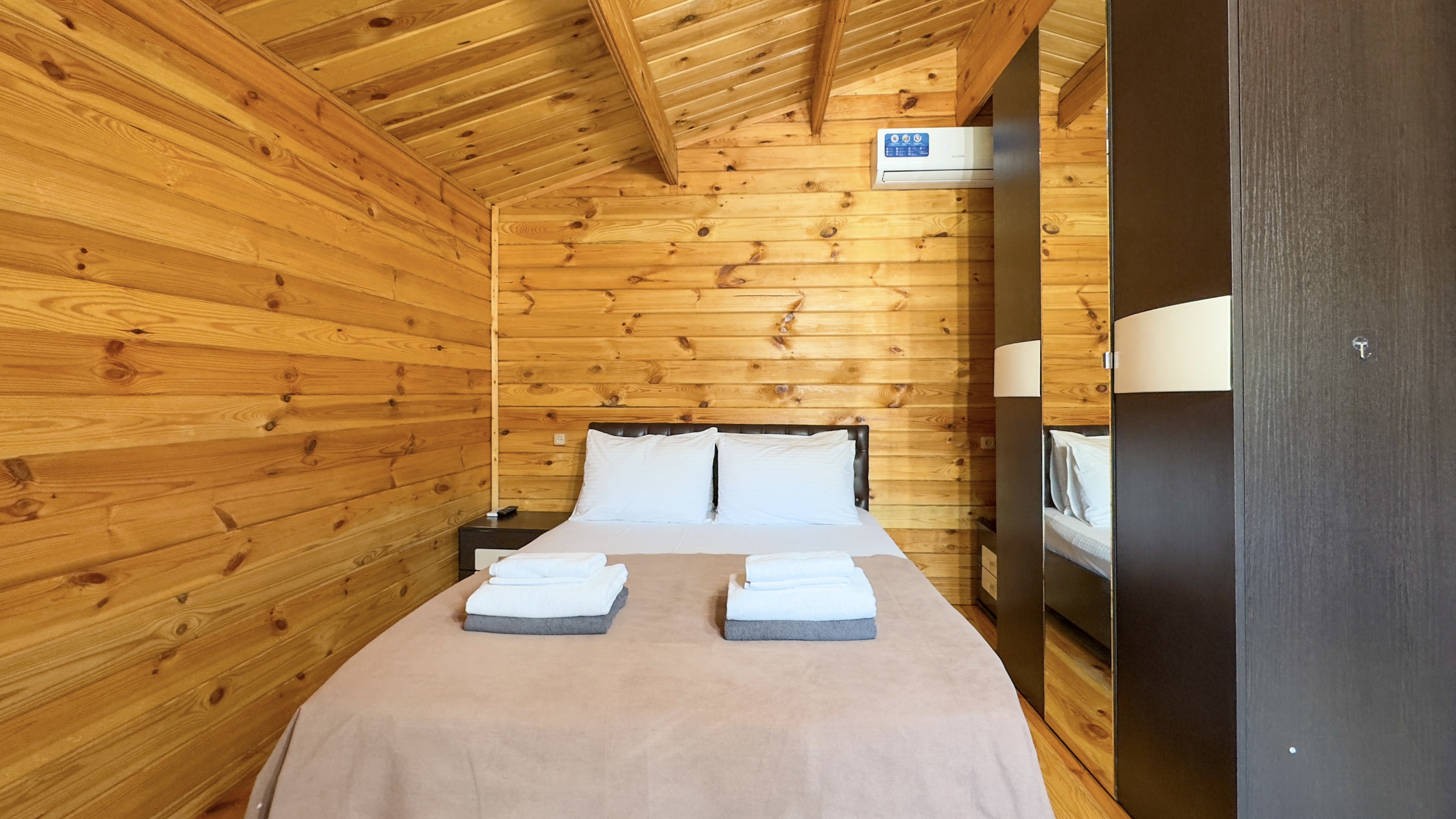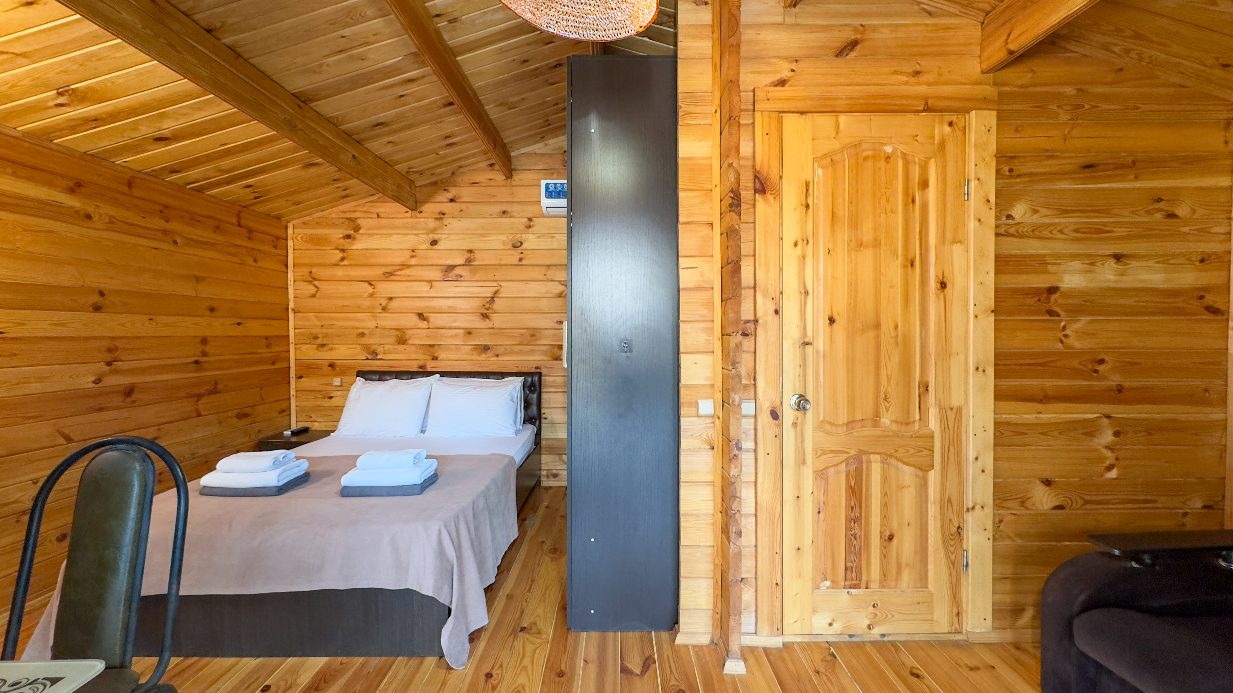 В номере: вешалка, диван раскладной, зеркало, кровать двуспальная, прикроватные тумбочки, стол, стулья, шкаф, кондиционер, мини-холодильник, сейф, телевизор, чайная станция