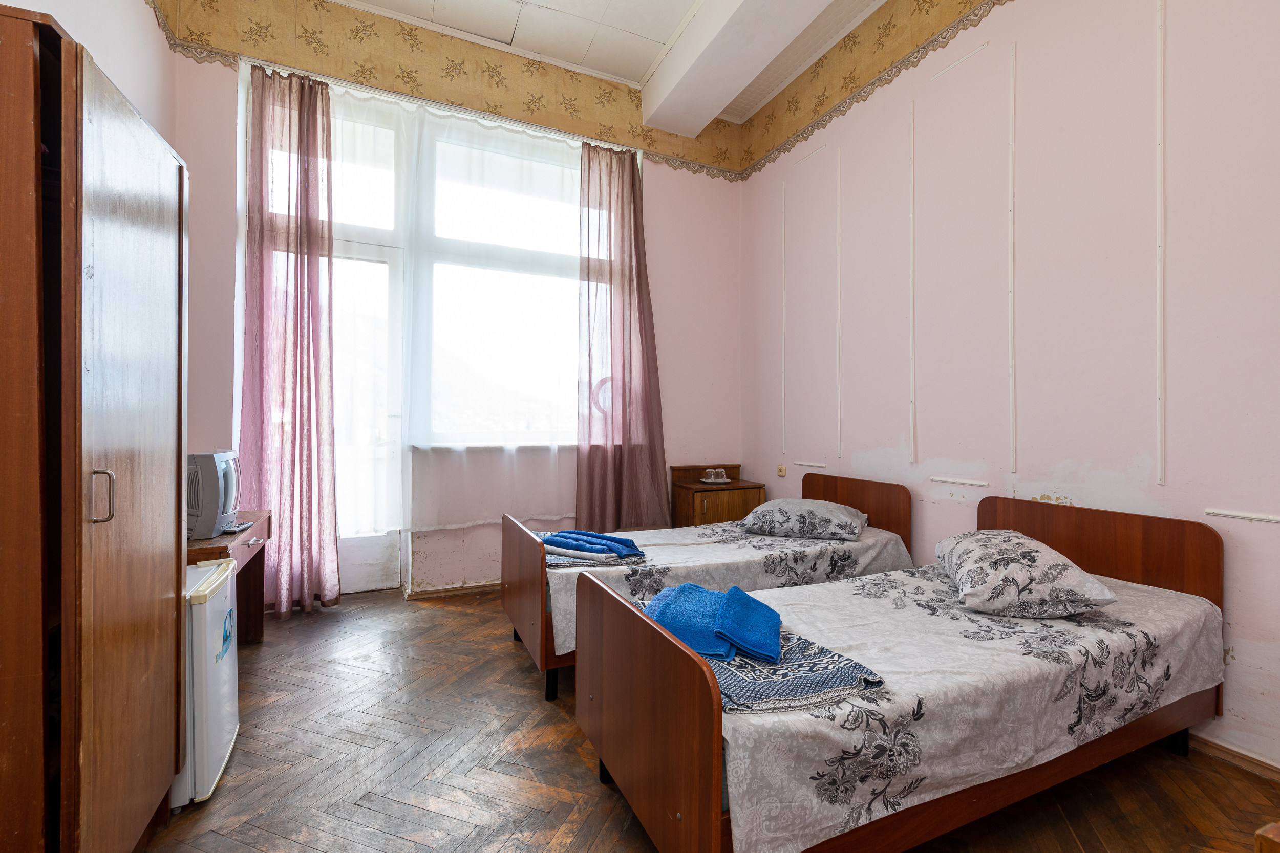 В номере: вешалка, зеркало, кровати односпальные, прикроватные тумбочки, стол, стулья, шкаф, кондиционер, телевизор, холодильник, чайный набор посуды