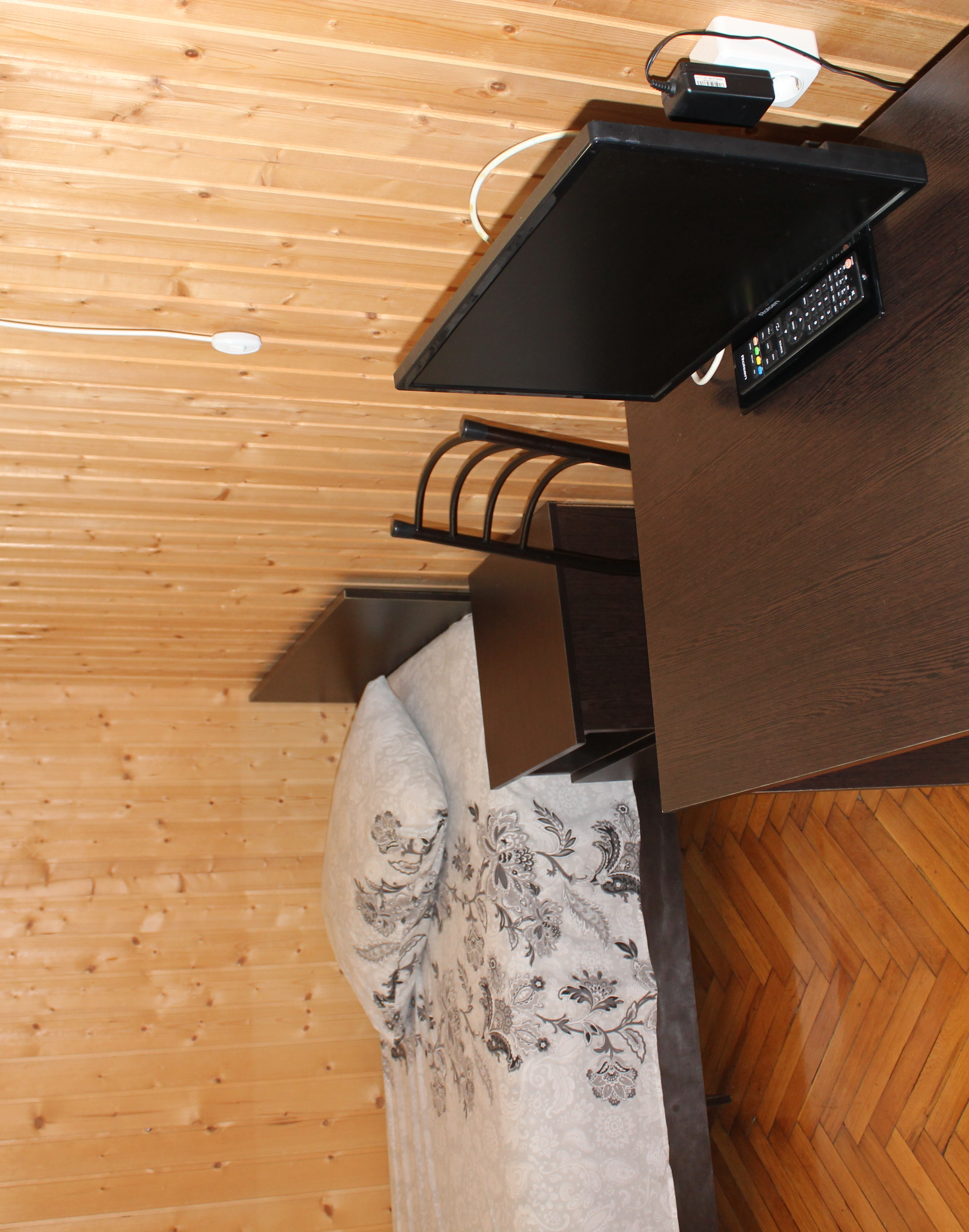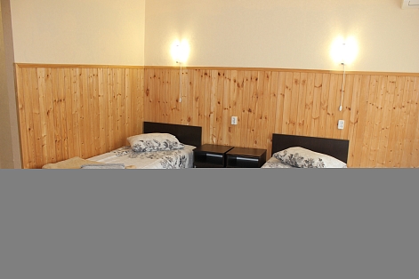 В номере: вешалка, зеркало, кровать двуспальная, кровать односпальная, прикроватные тумбочки, стол, столик журнальный, стулья, шкаф, кондиционер, телевизор, холодильник, чайный набор посуды, электрочайник