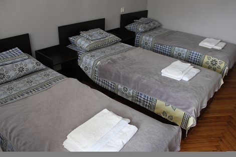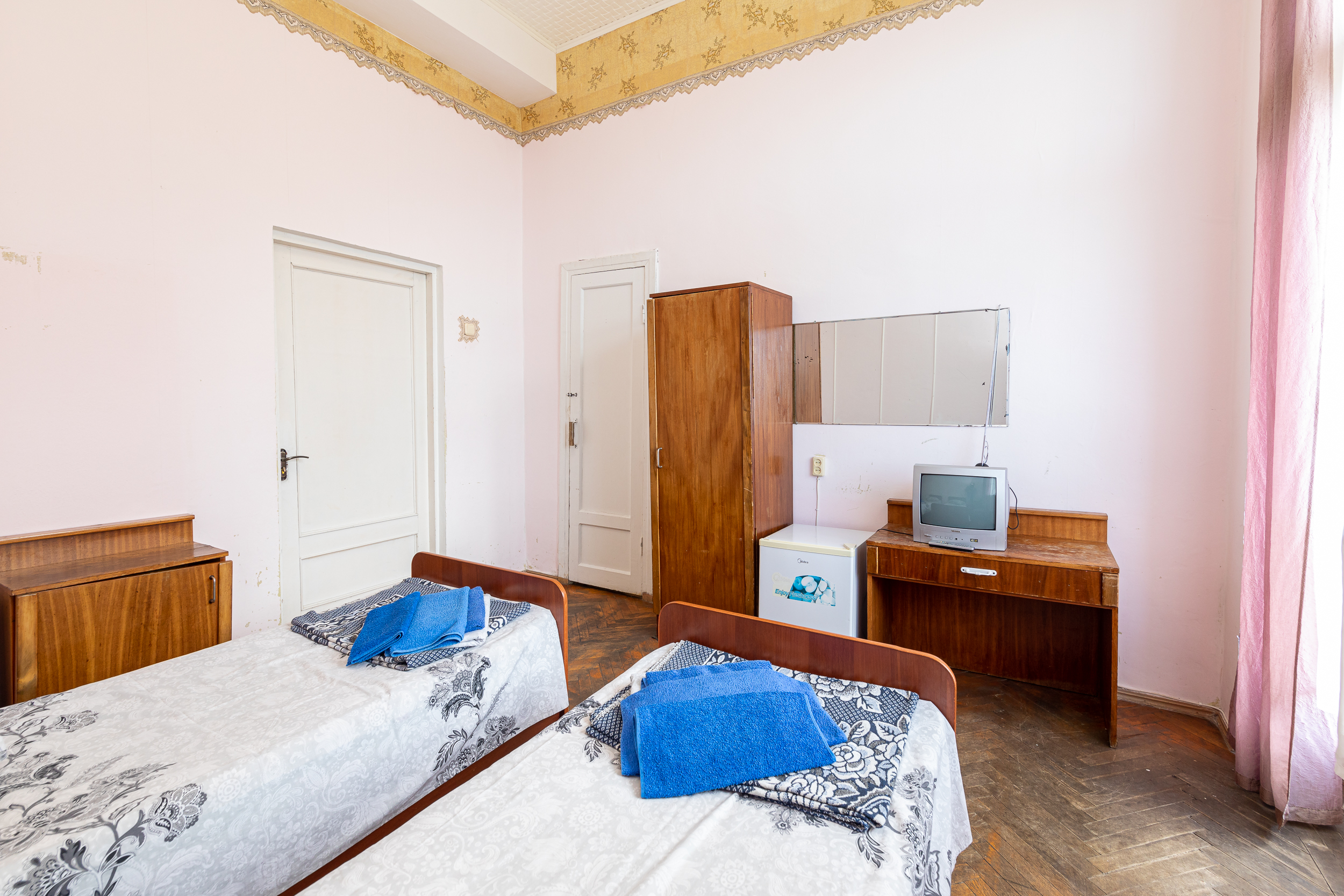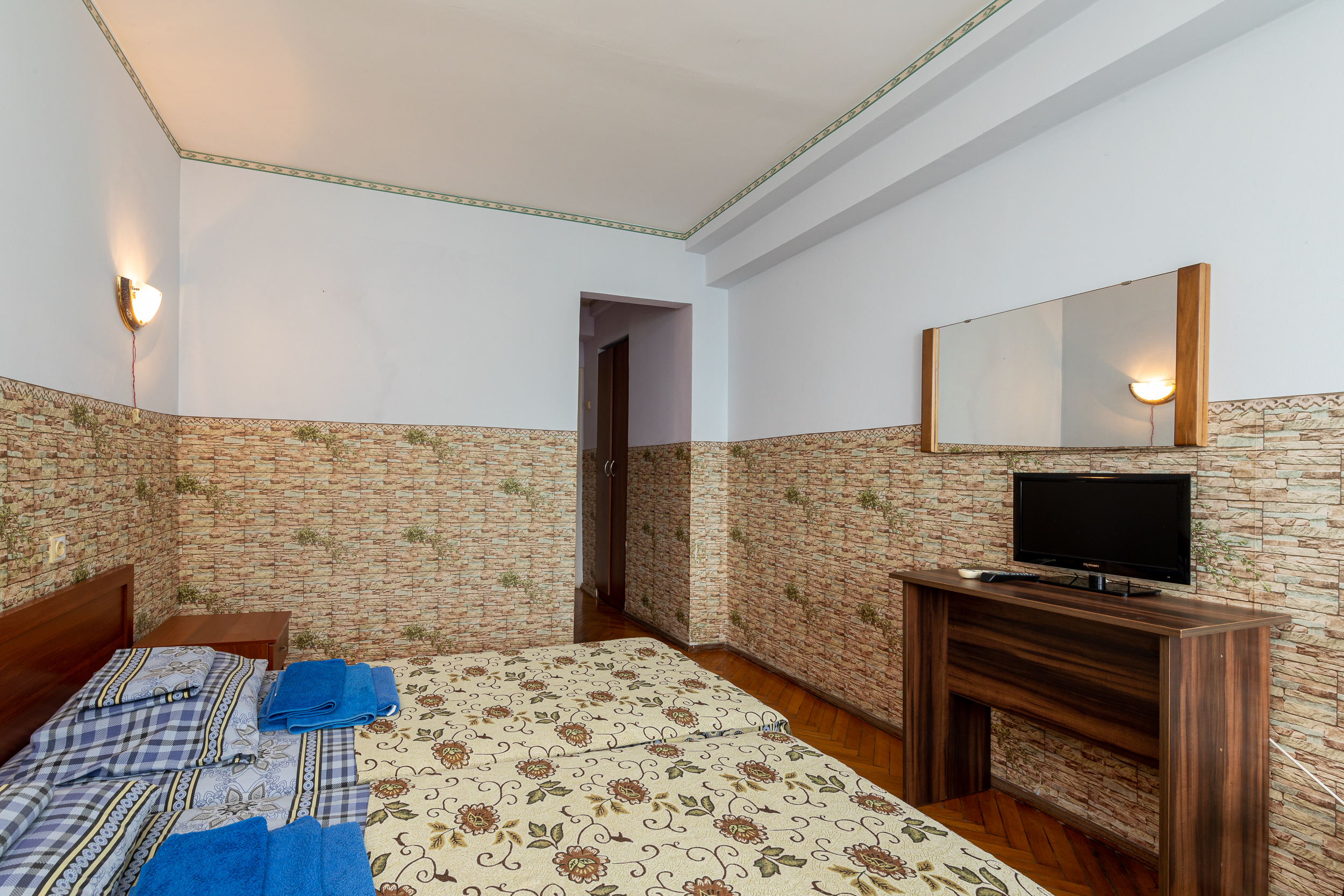 В номере: вешалка, зеркало, кровати односпальные /одна двуспальная кровать, прикроватные тумбочки, стол, стулья, шкаф, вентилятор