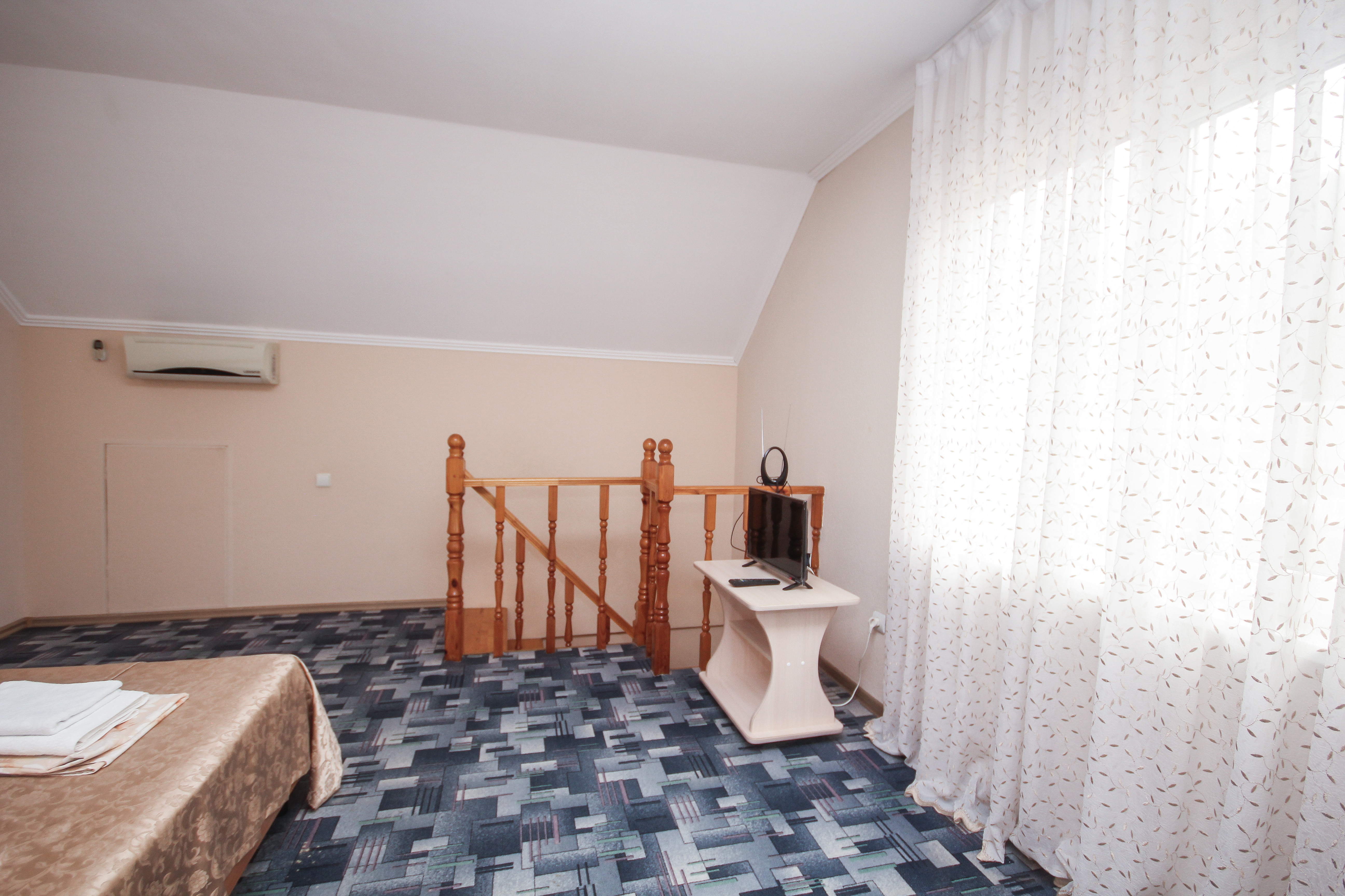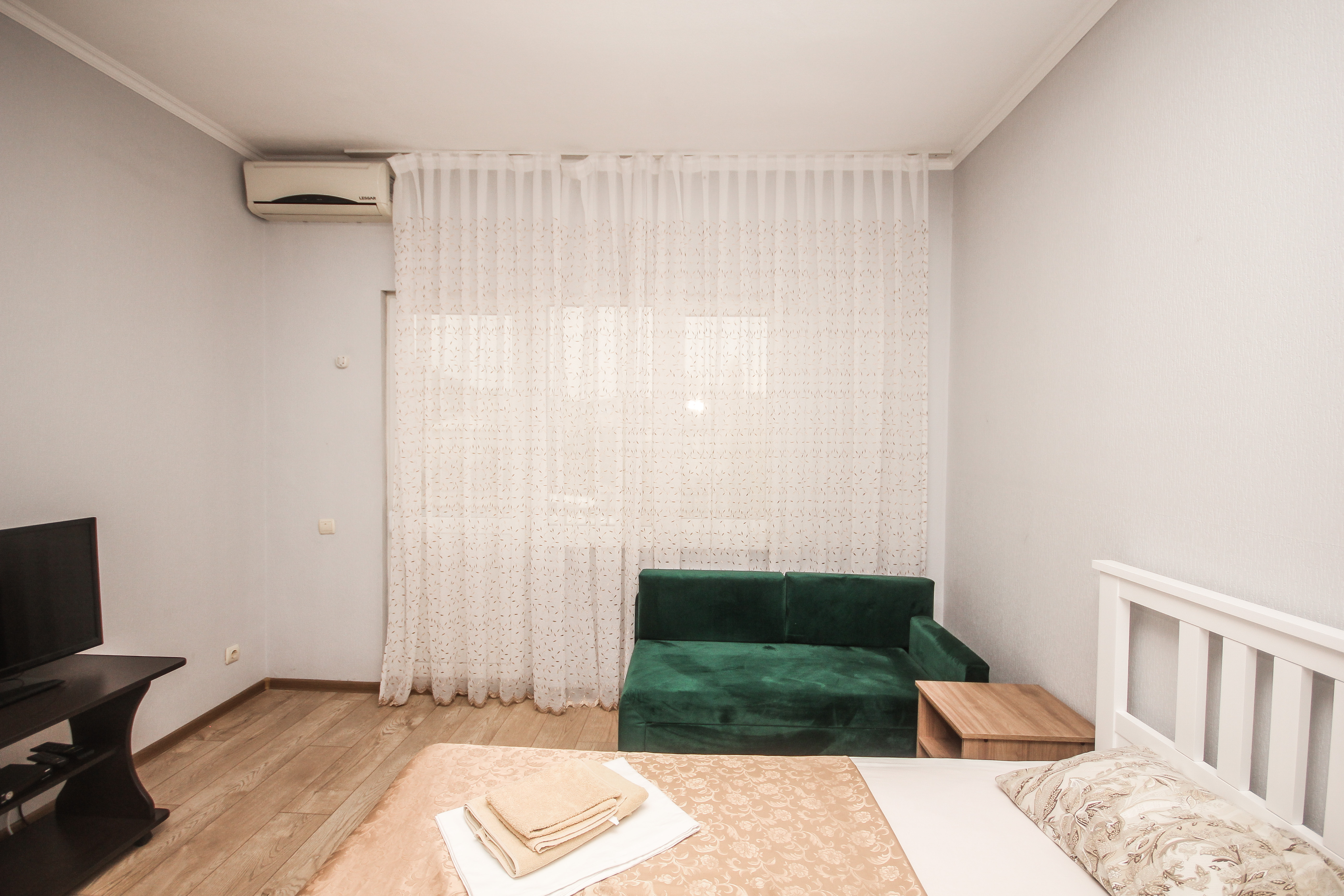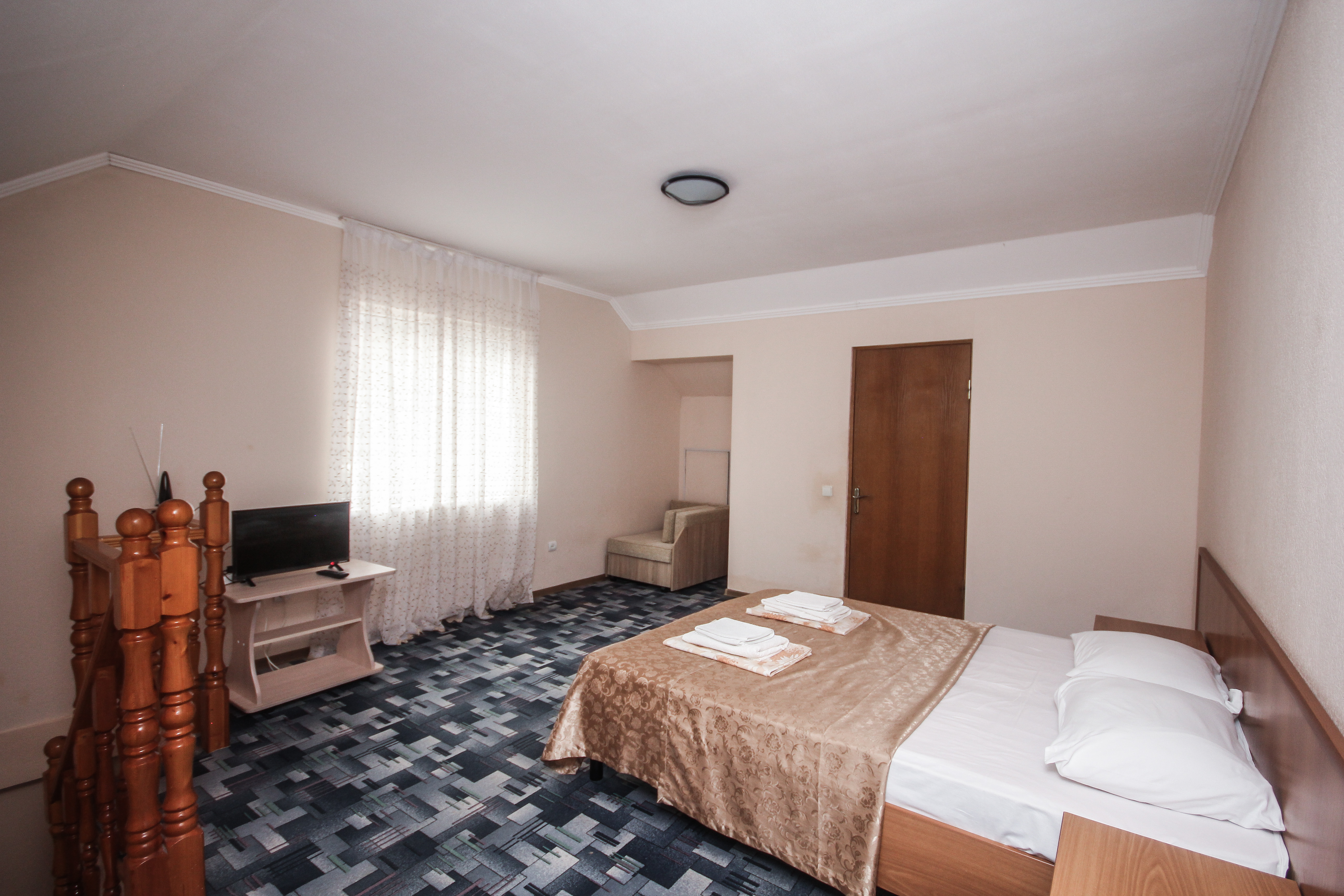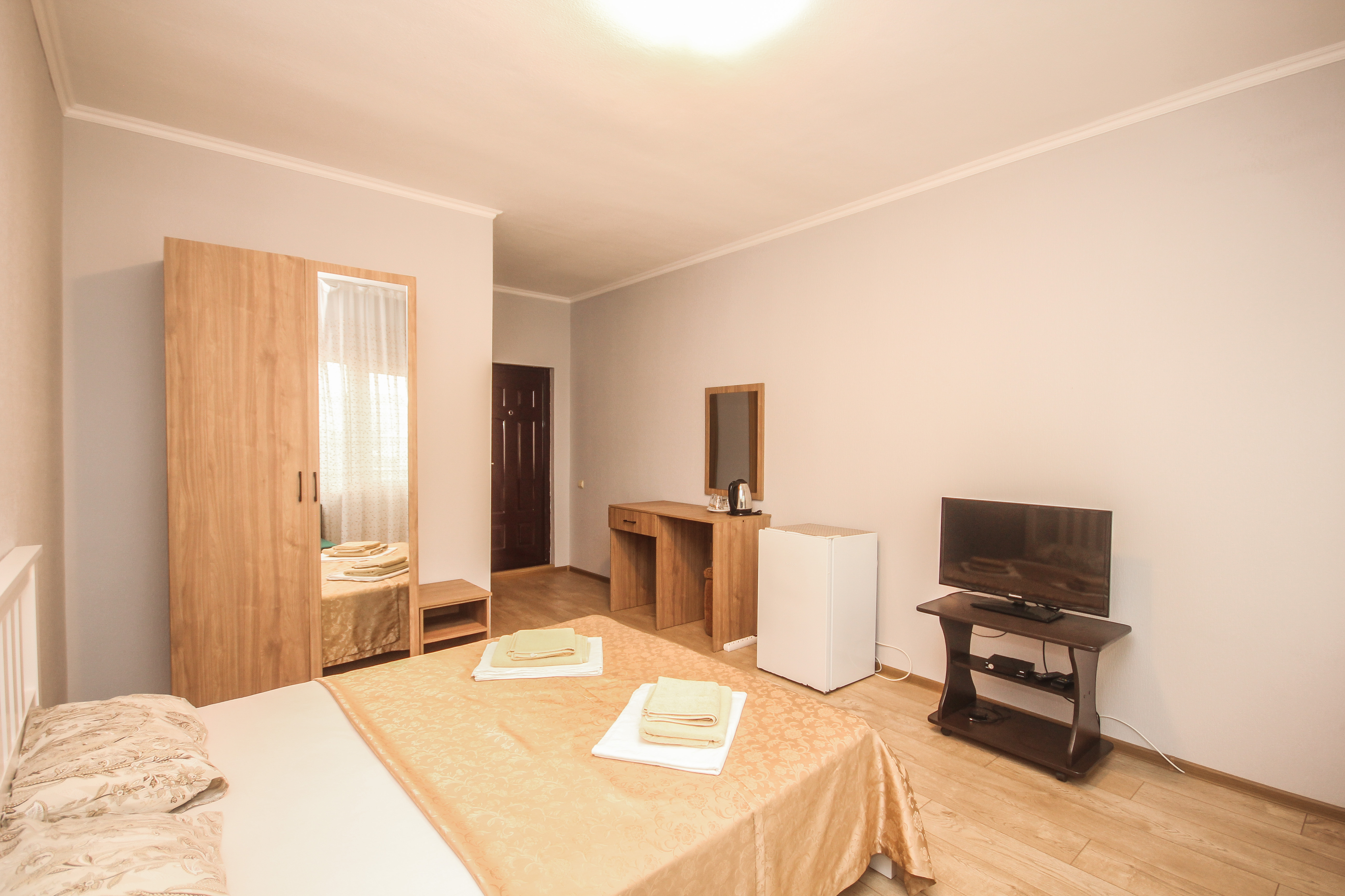 В номере: вешалка, диван, диван раскладной, зеркало, кровать двуспальная, кровать односпальная, прикроватные тумбочки, пуфик, стол, столик журнальный, тумба, шкаф, кондиционер, телевизор, холодильник, чайный набор посуды, электрочайник
