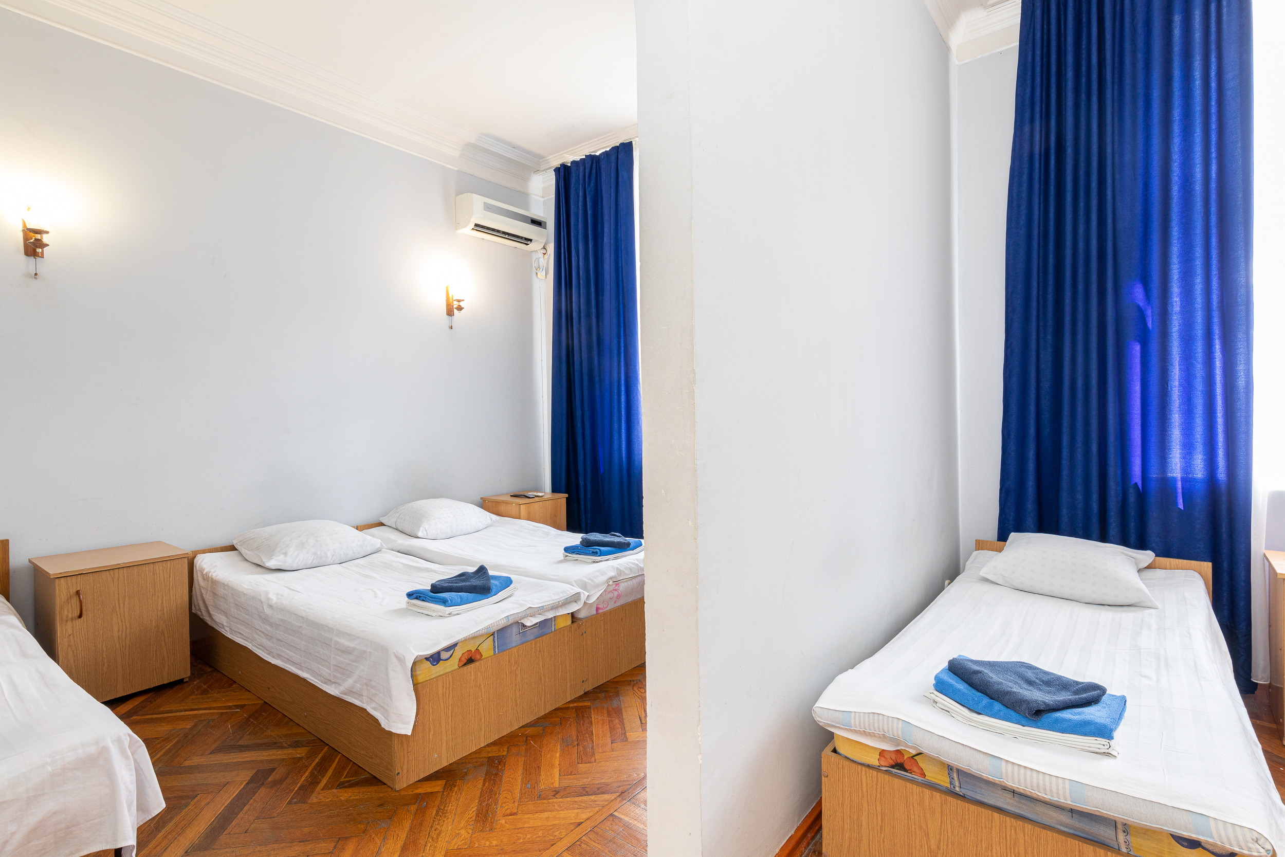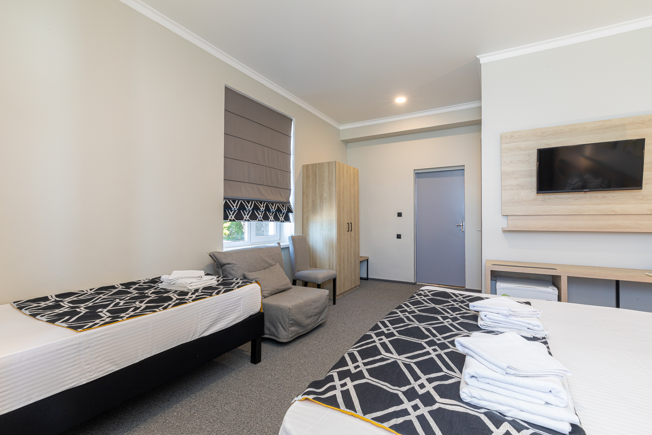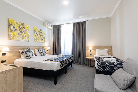 В номере: вешалка, зеркало, кресло-кровать, кровати односпальные /одна двуспальная кровать, кровать односпальная, прикроватные тумбочки, стол, стул, шкаф, кондиционер, телевизор, холодильник, электрочайник