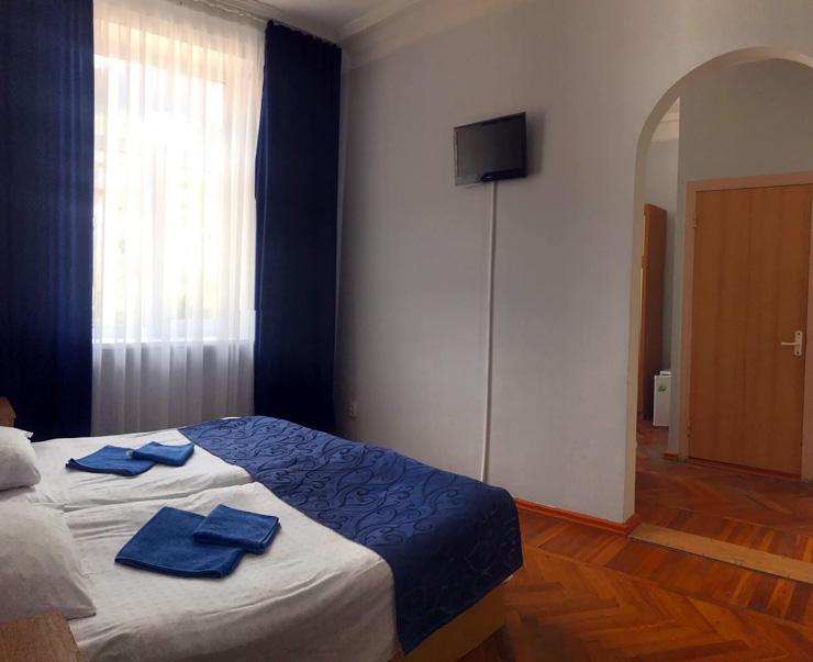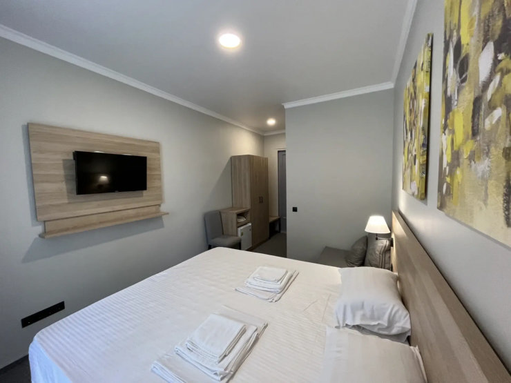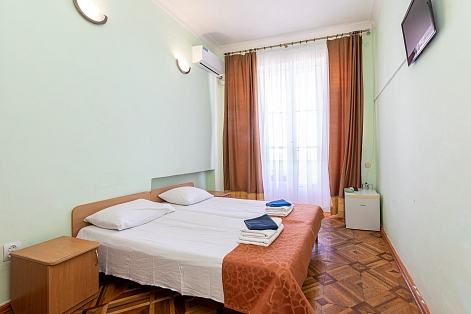 В номере: вешалка, зеркало, кровати односпальные /одна двуспальная кровать, прикроватные тумбочки, стол, стул, шкаф, кондиционер, мини-холодильник, телевизор