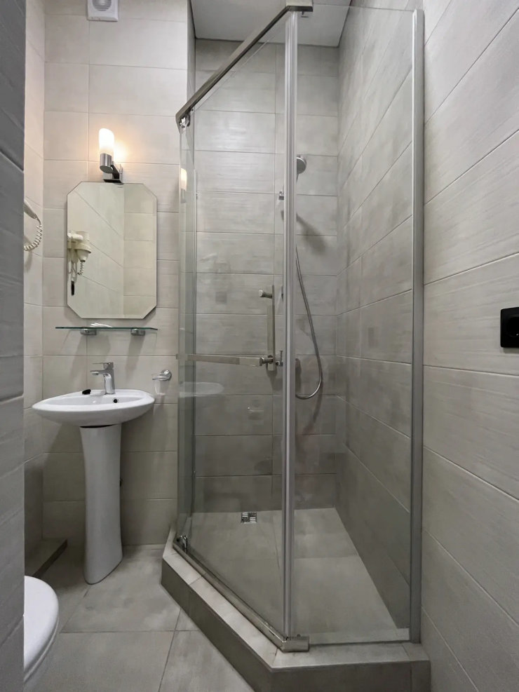 В номере: вешалка, зеркало, кровати односпальные, прикроватные тумбочки, шкаф, кондиционер, телевизор, холодильник, электрочайник