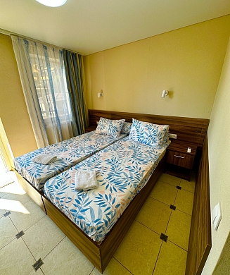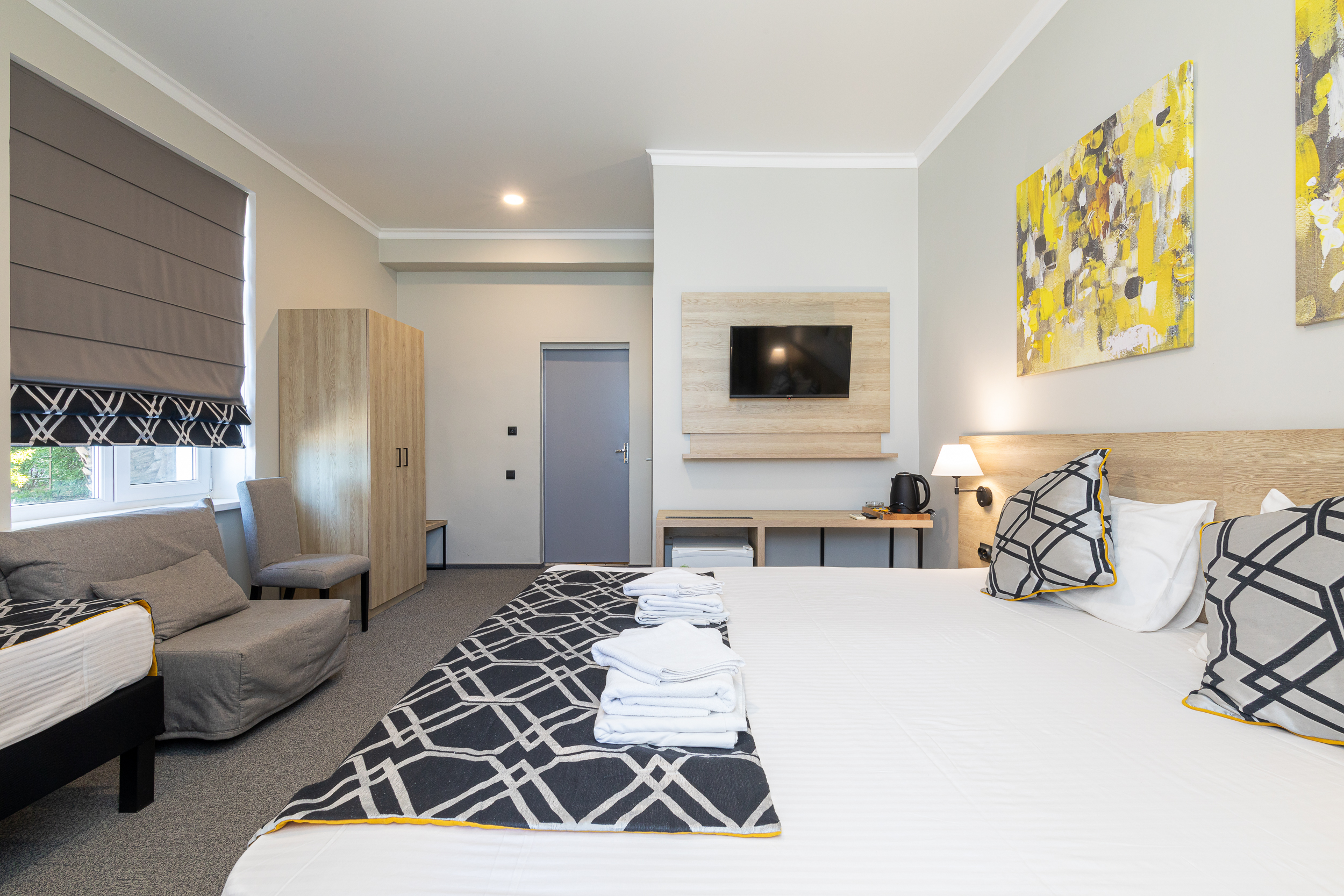 В номере: вешалка, зеркало, кресло-кровать, кровати односпальные /одна двуспальная кровать, прикроватные тумбочки, стул, тумба, шкаф, кондиционер, мини-холодильник, телевизор, чайный набор посуды, электрочайник