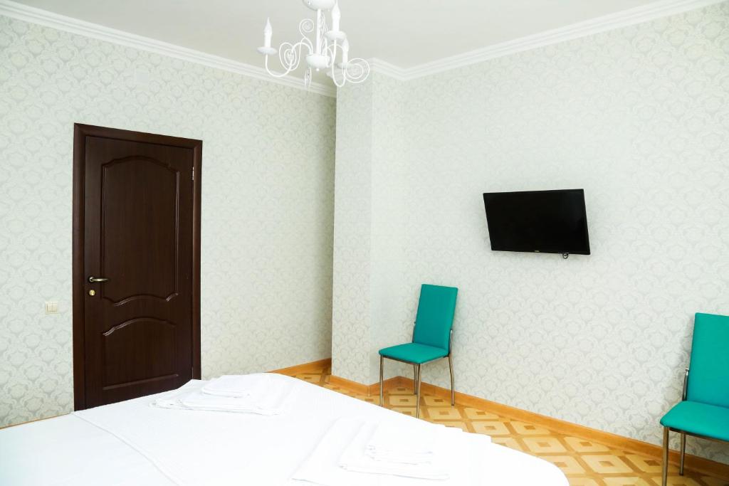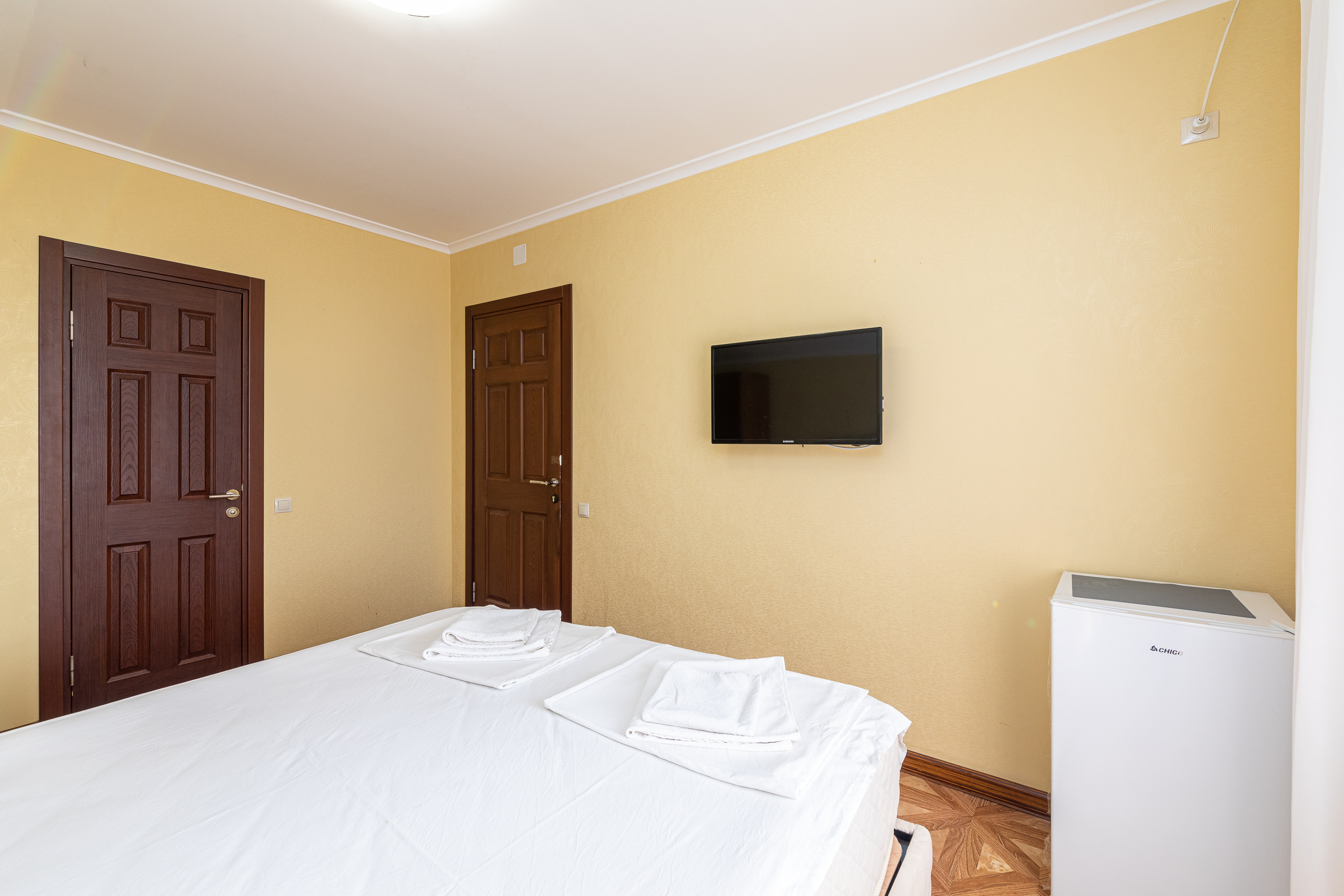 В номере: вешалка, зеркало, кровать двуспальная, прикроватные тумбочки, стол, стулья, шкаф, кондиционер, мини-холодильник, телевизор