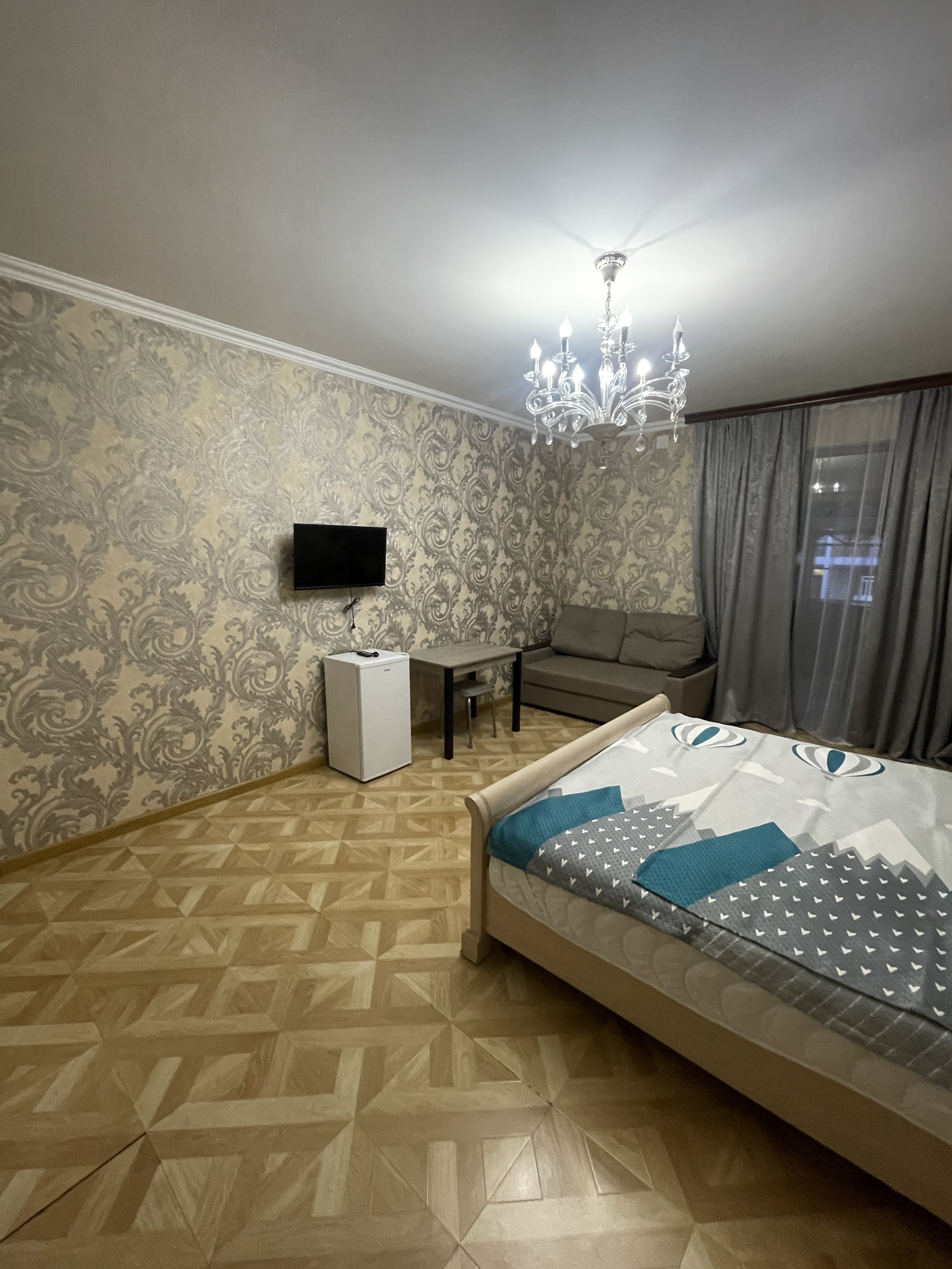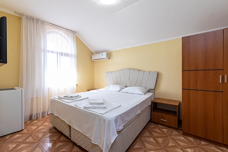 В номере: вешалка, диван раскладной, зеркало, кровать двуспальная, прикроватные тумбочки, стол, стулья, шкаф, кондиционер, мини-холодильник, телевизор