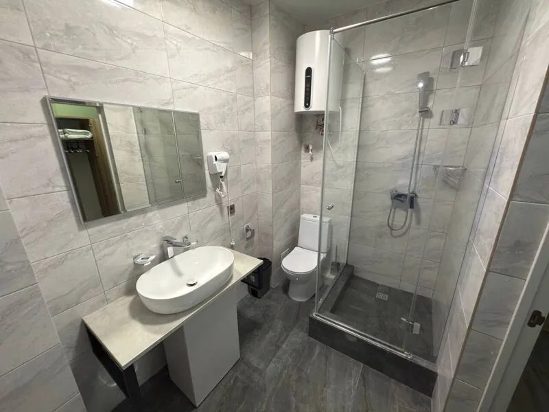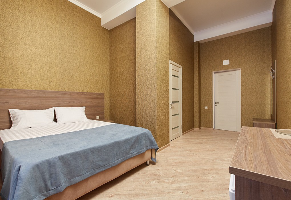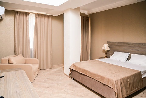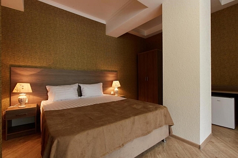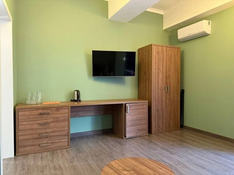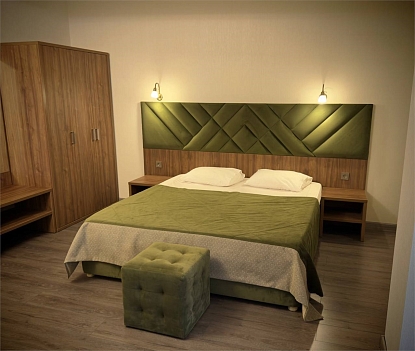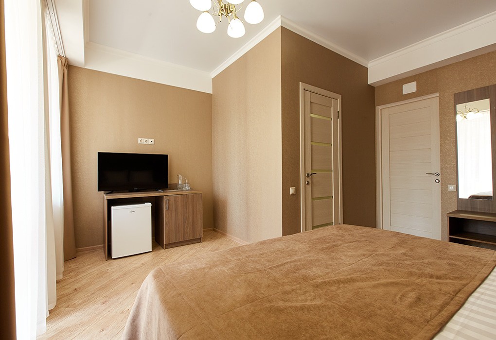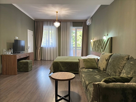 В номере: вешалка, диван, зеркало, кровать двуспальная, прикроватные тумбочки, стол, стул, шкаф, кондиционер, телевизор