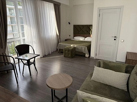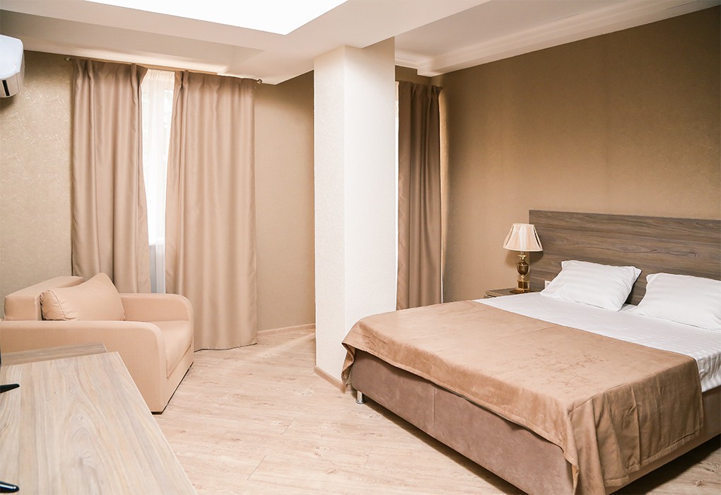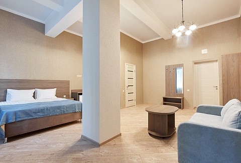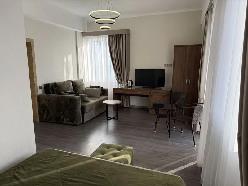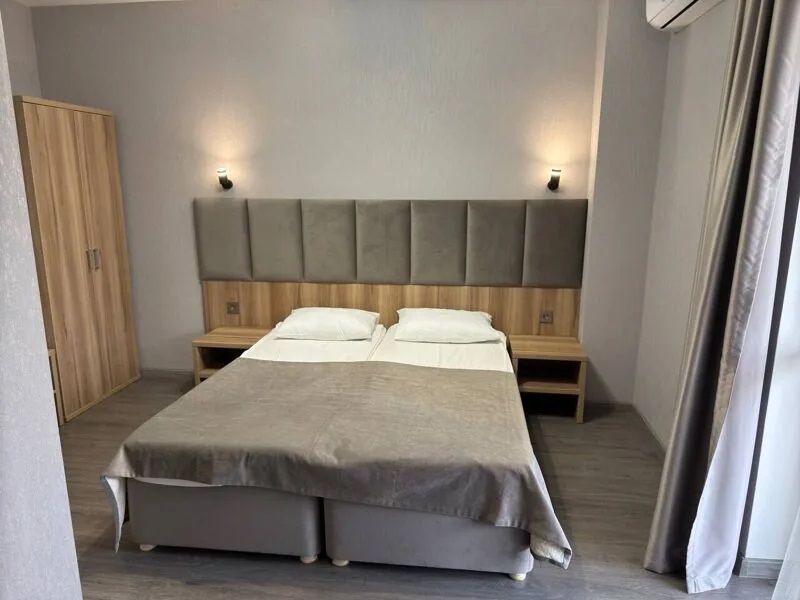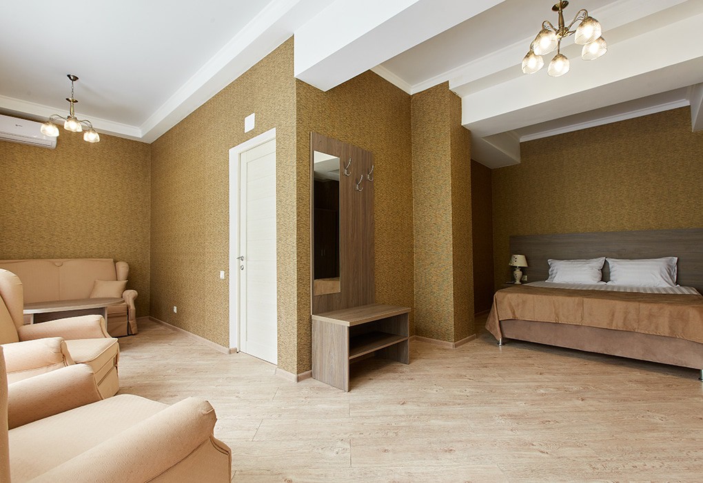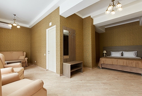 В номере: вешалка, диван, зеркало, кровать двуспальная, прикроватные тумбочки, стол, стулья, шкаф, кондиционер, телевизор