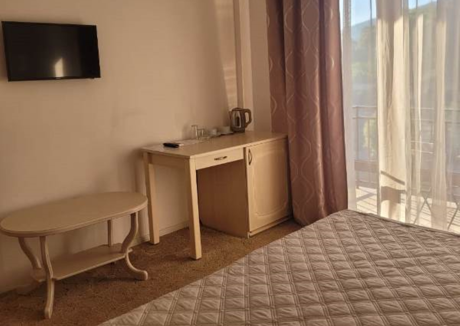 В номере: вешалка, зеркало, кровать двуспальная, прикроватные тумбочки, стол, стул, шкаф, кондиционер, телевизор, холодильник, чайный набор посуды, электрочайник
