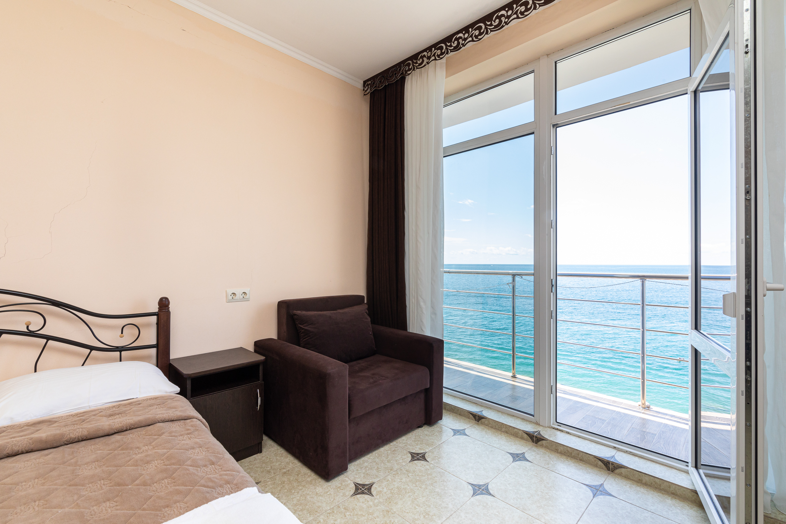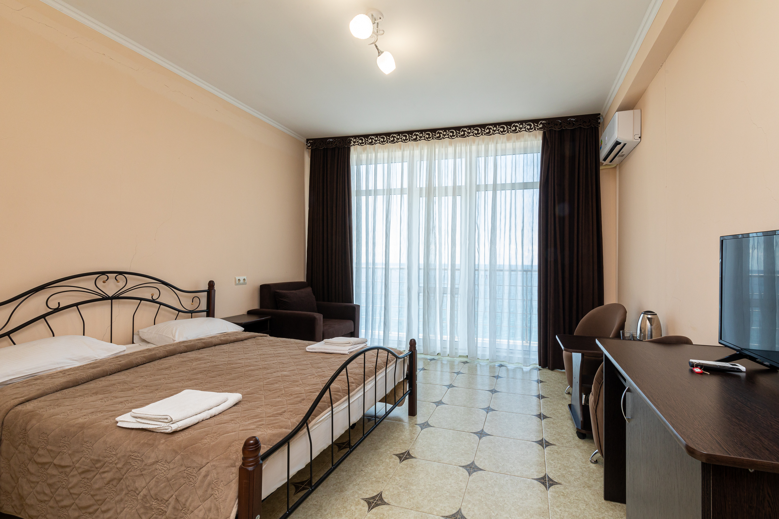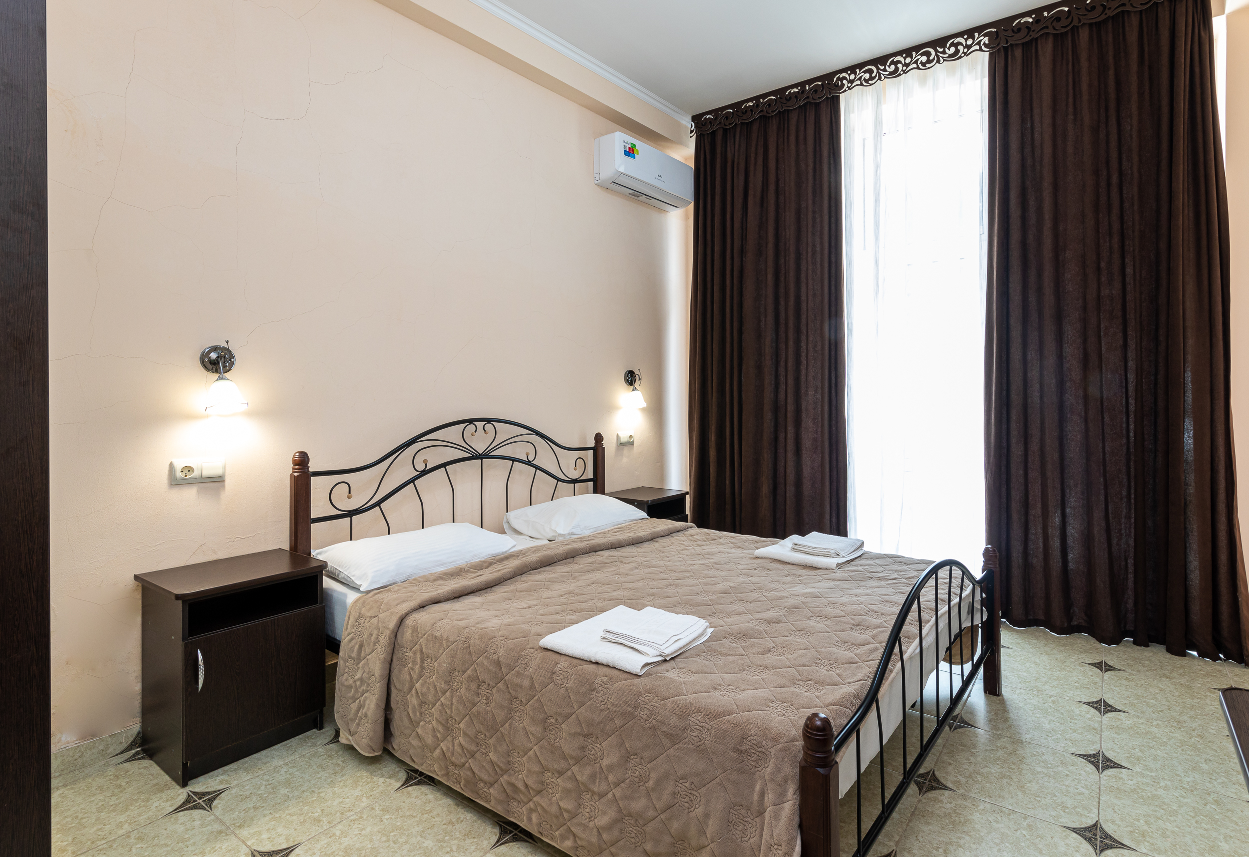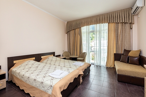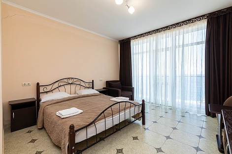 Закрытый двор украшают фонтан, роскошные пальмы, уголки для отдыха и кафе. Отель работает сезонно и принимает гостей без возрастных ограничений – даже самых маленьких. Небольшие диваны в номерах легко превращаются в дополнительное место для размещения ребенка. Их же можно использовать как рабочий уголок – вместе с небольшим столом и двумя креслами. Кроме того, в каждом номере есть удобные кровати, телевизор, холодильник, кондиционер: это создает уют в любую погоду.Прекрасная терраса с видом на море, кафе и бар радуют гостей блюдами европейской и кавказской кухни.К услугам отдыхающих – организация экскурсий, выдача напрокат спортивного инвентаря, трансфер.