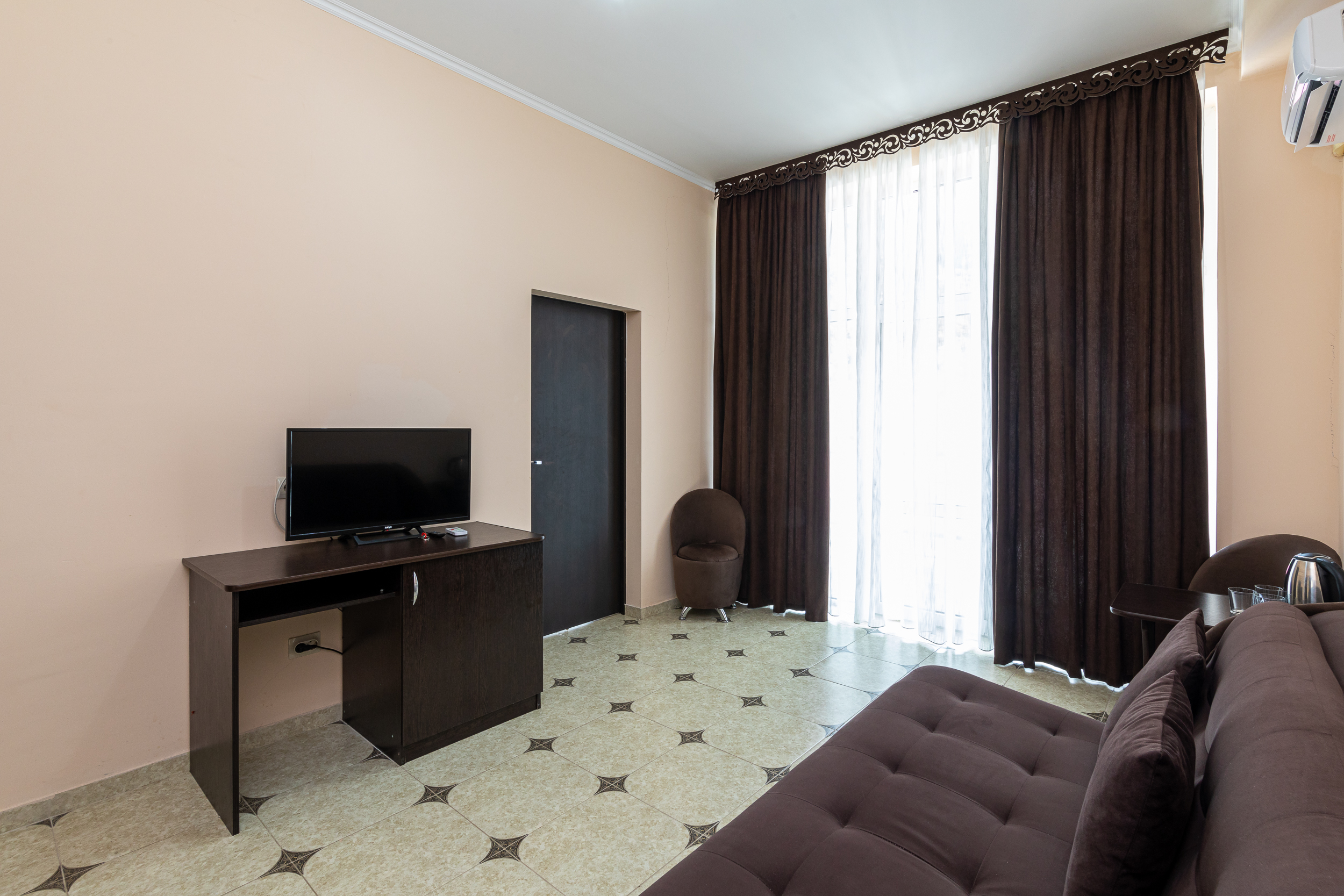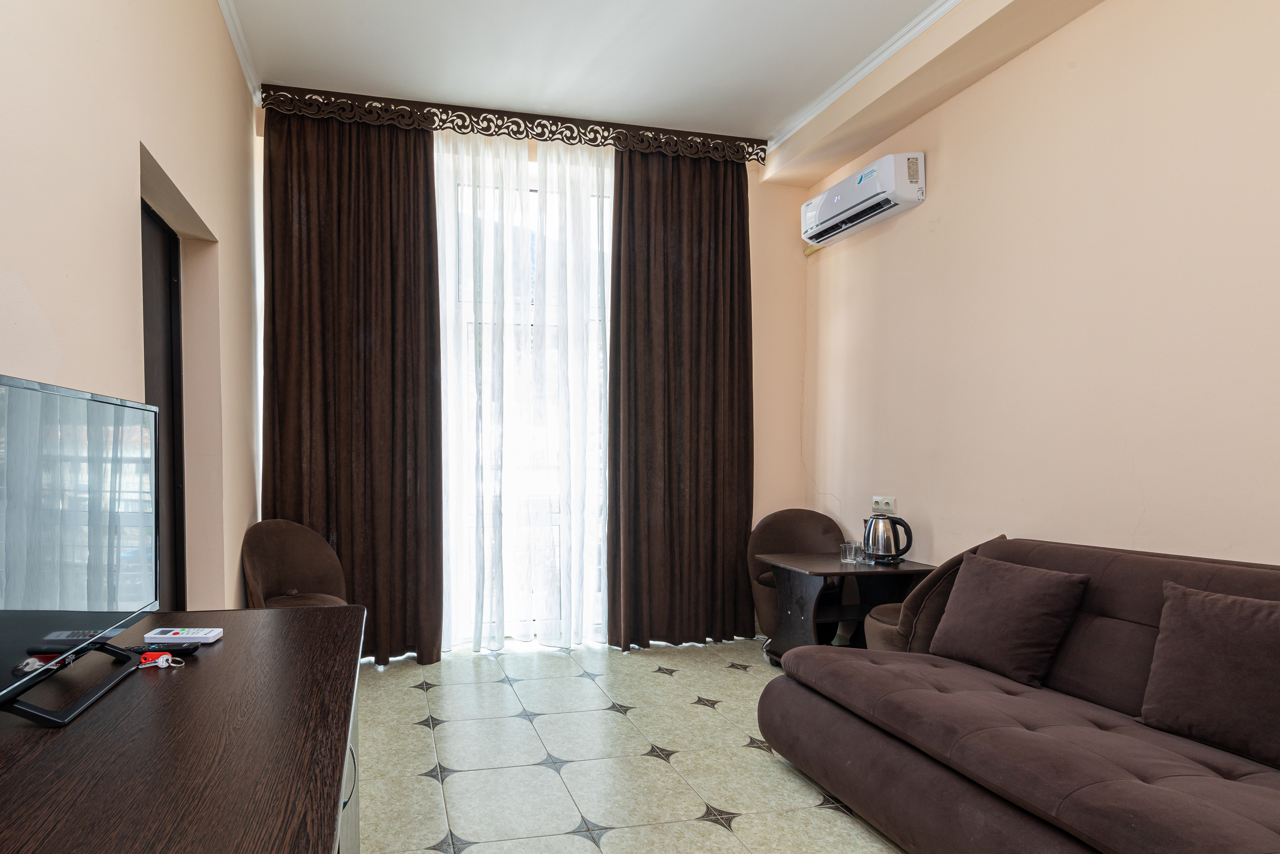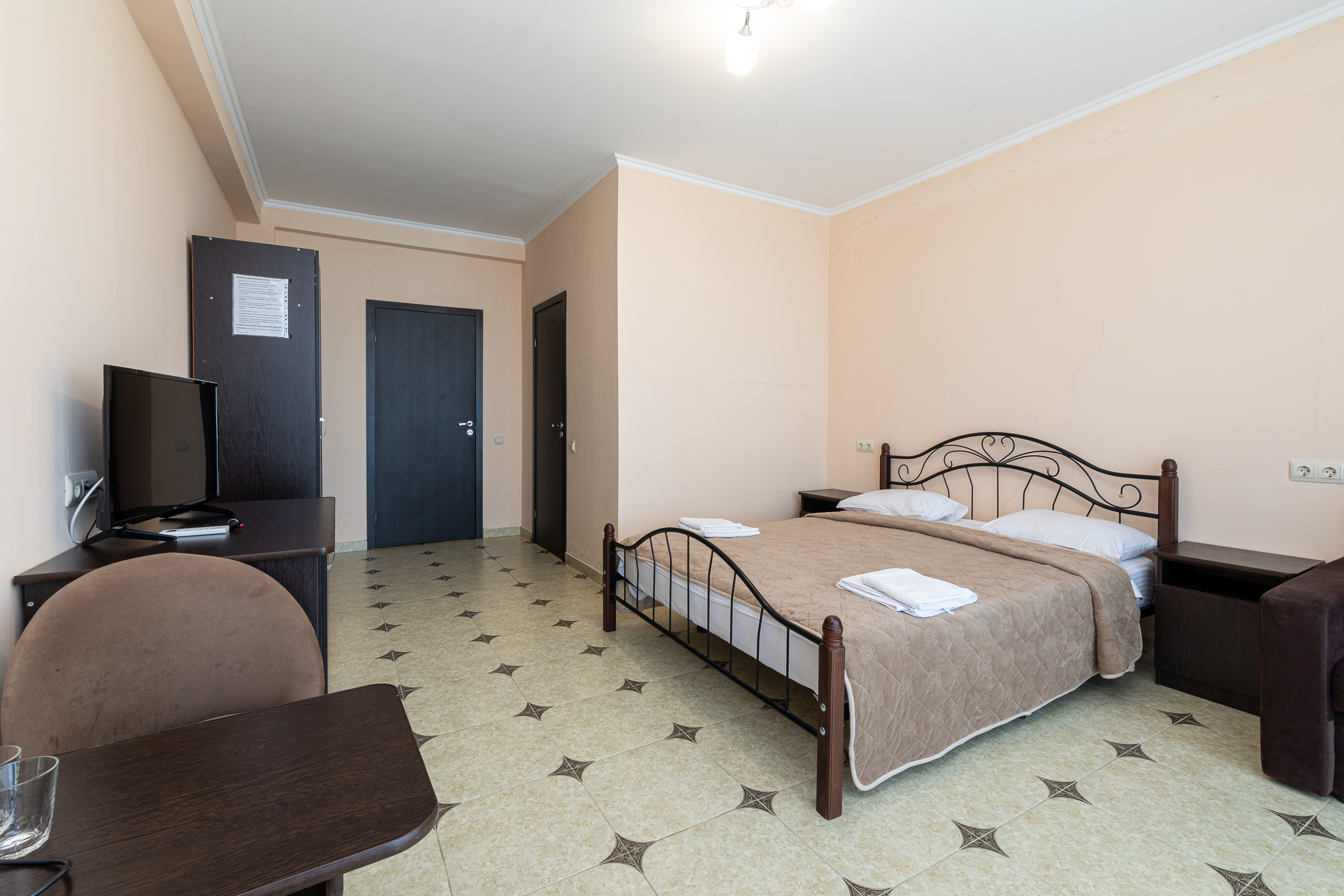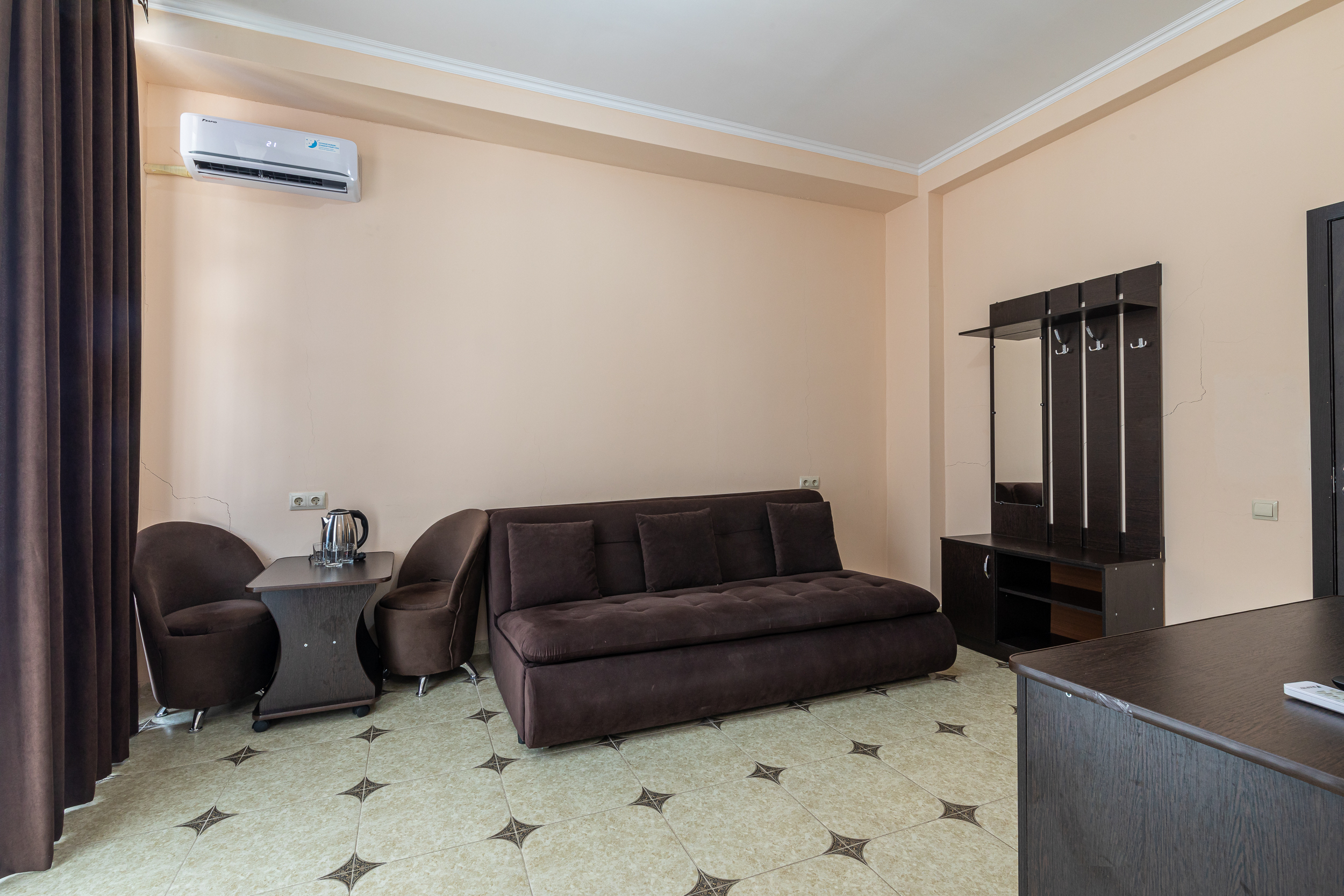 В номере: вешалка, диван раскладной, зеркало, кресла, кровать двуспальная, прикроватные тумбочки, стол, столик журнальный, шкаф, кондиционер, телевизор, холодильник