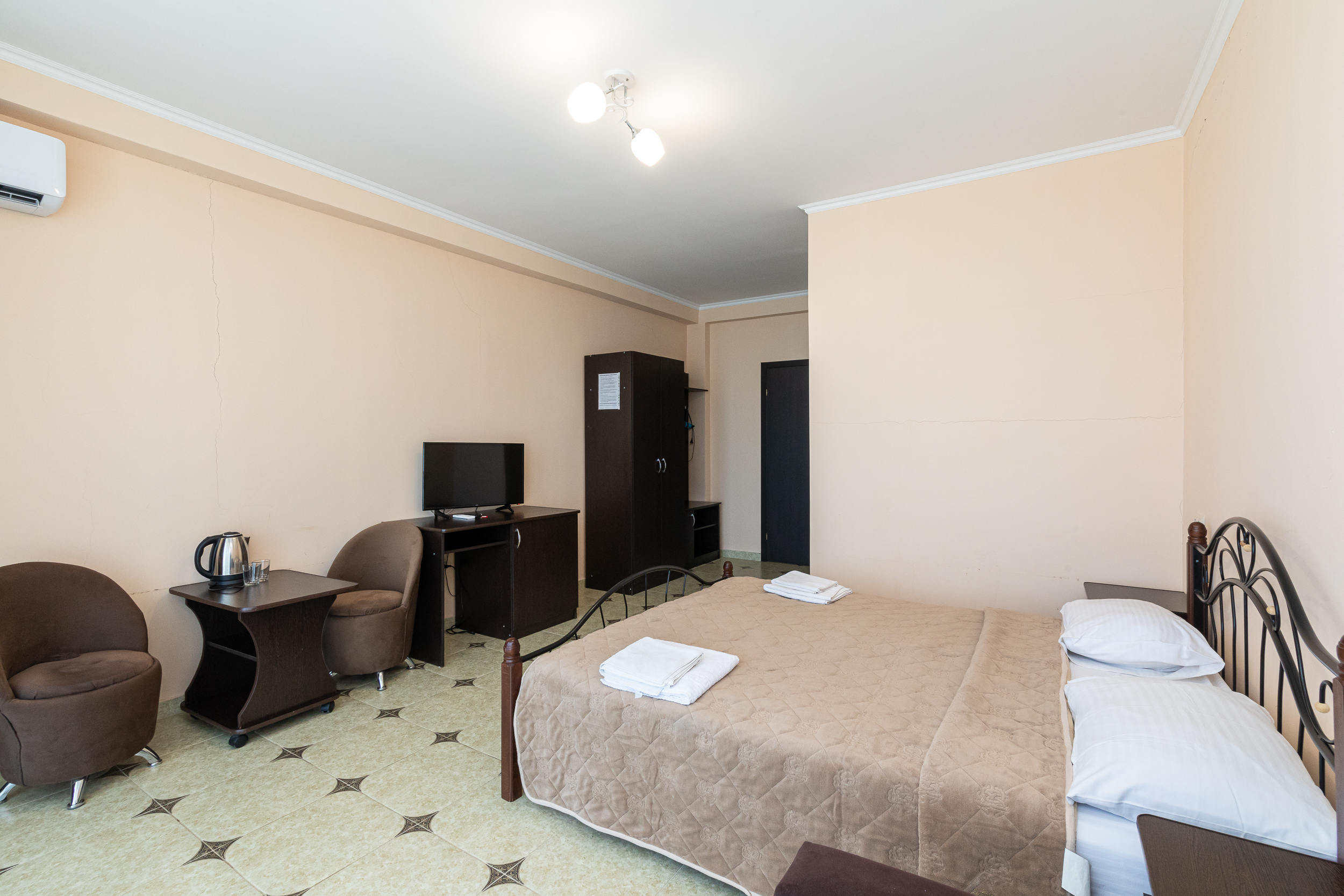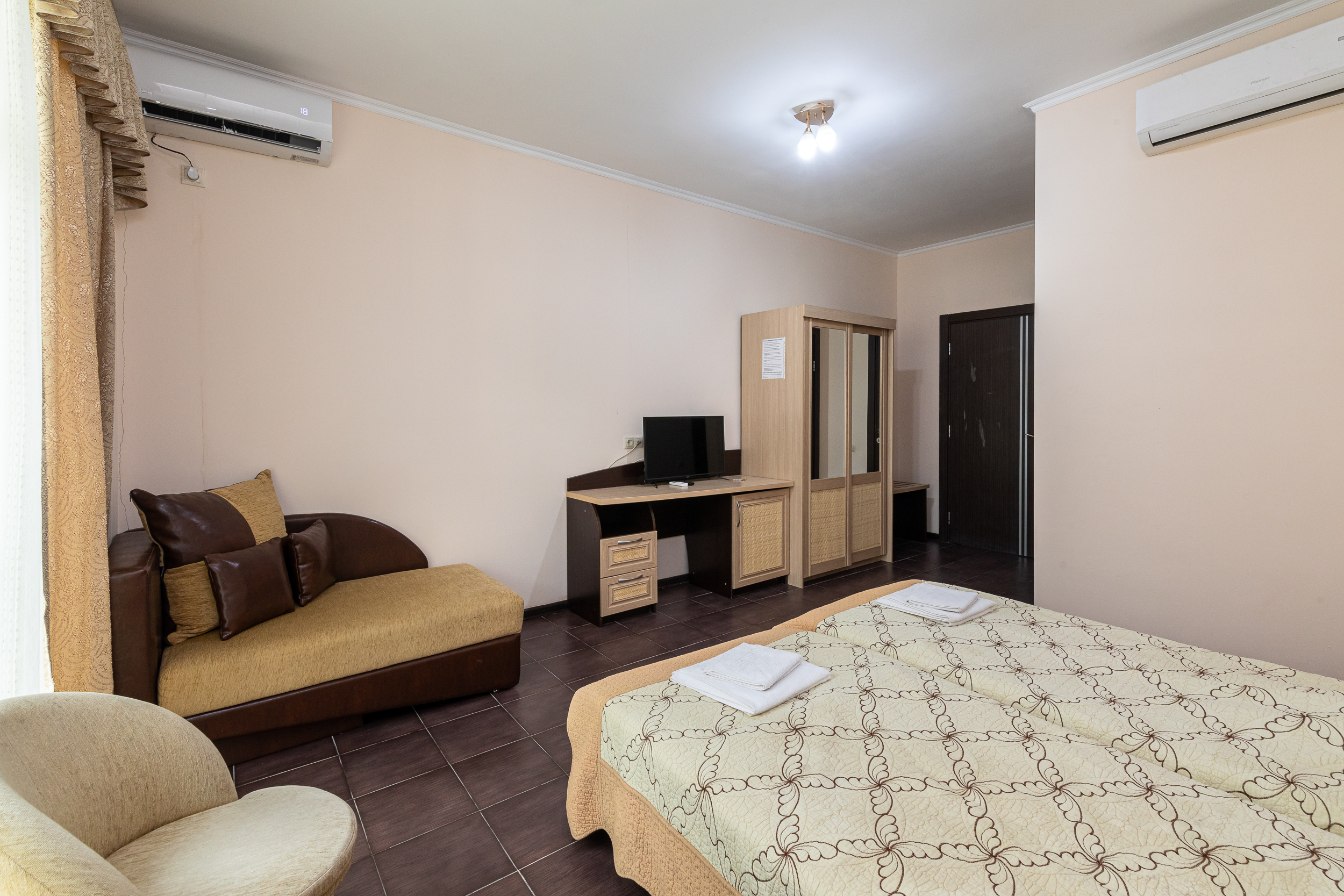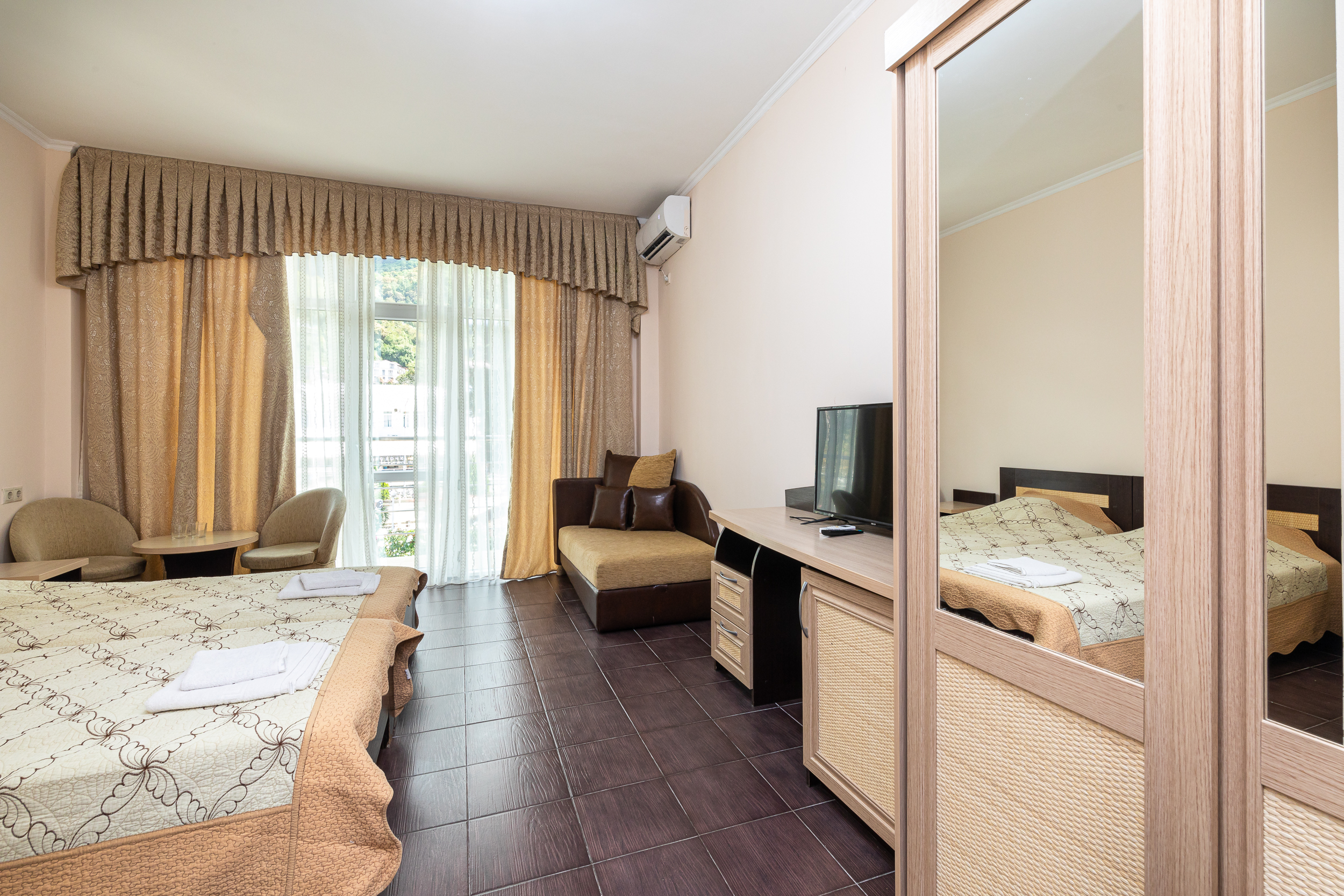 В номере: вешалка, зеркало, кресла, кровати односпальные /одна двуспальная кровать, прикроватные тумбочки, стол, шкаф, кондиционер, телевизор, холодильник